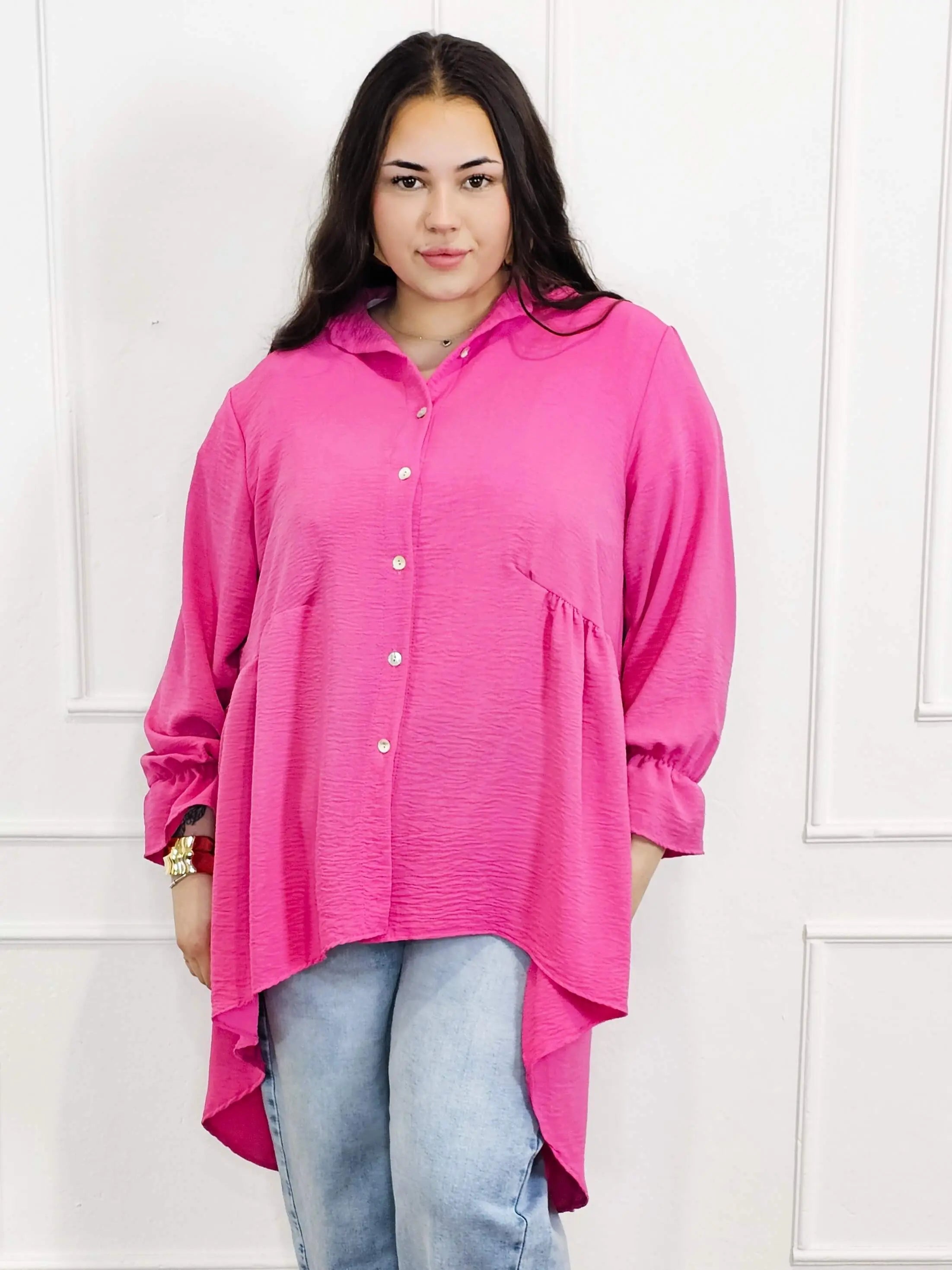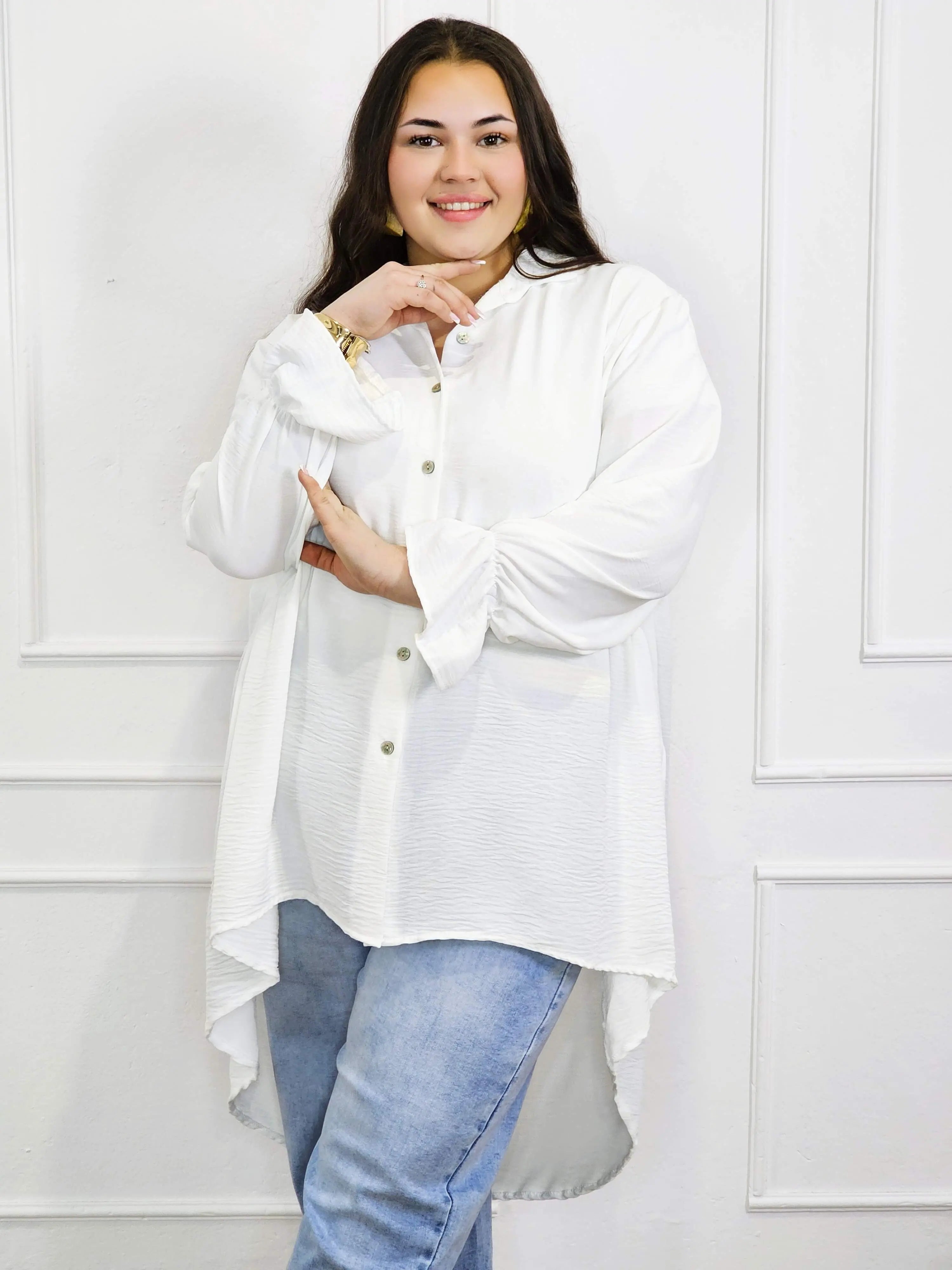 Bluzka plus size koszulowa z dłuższym tyłem – lekka, oversize, na guziki XXL