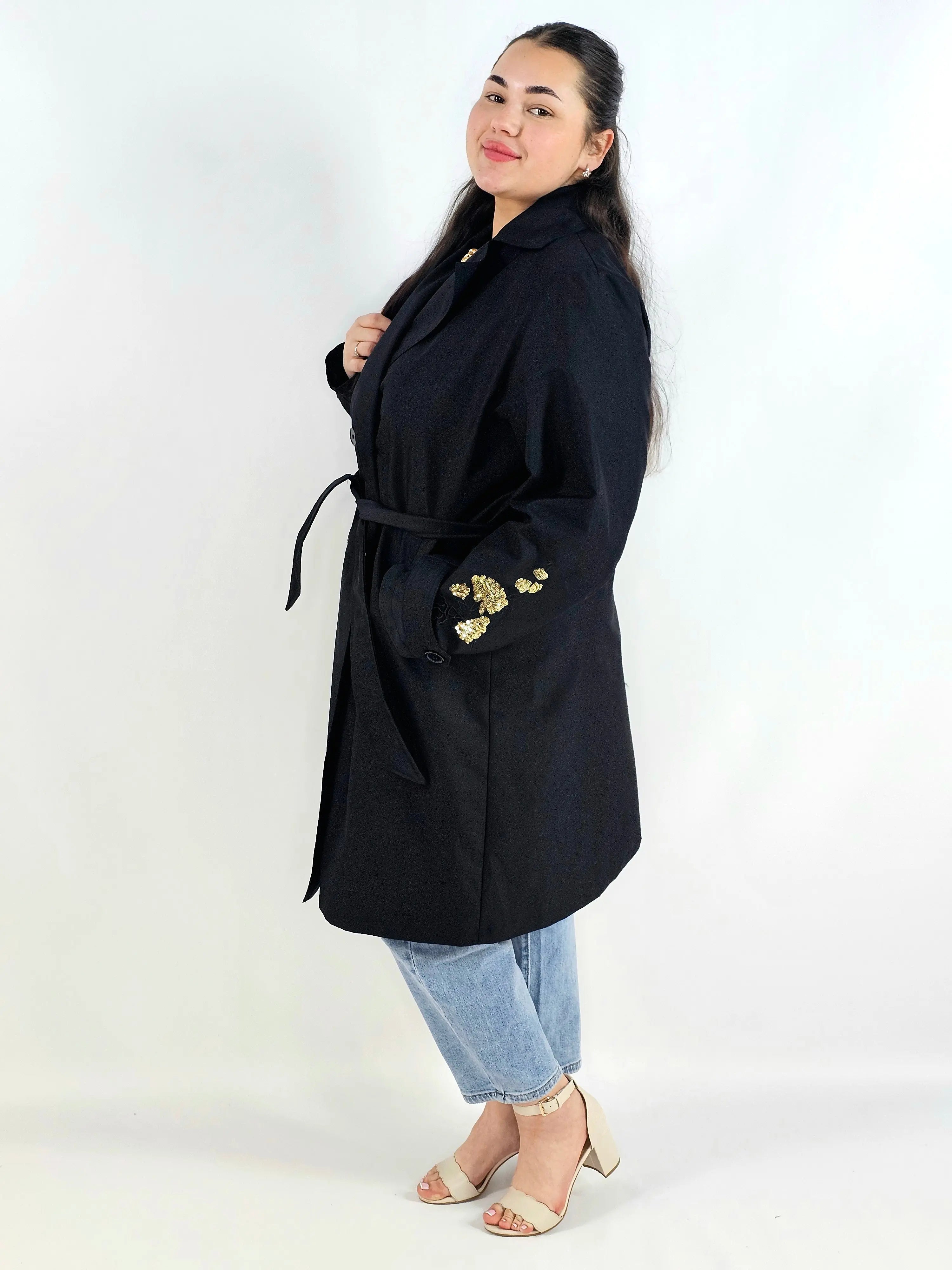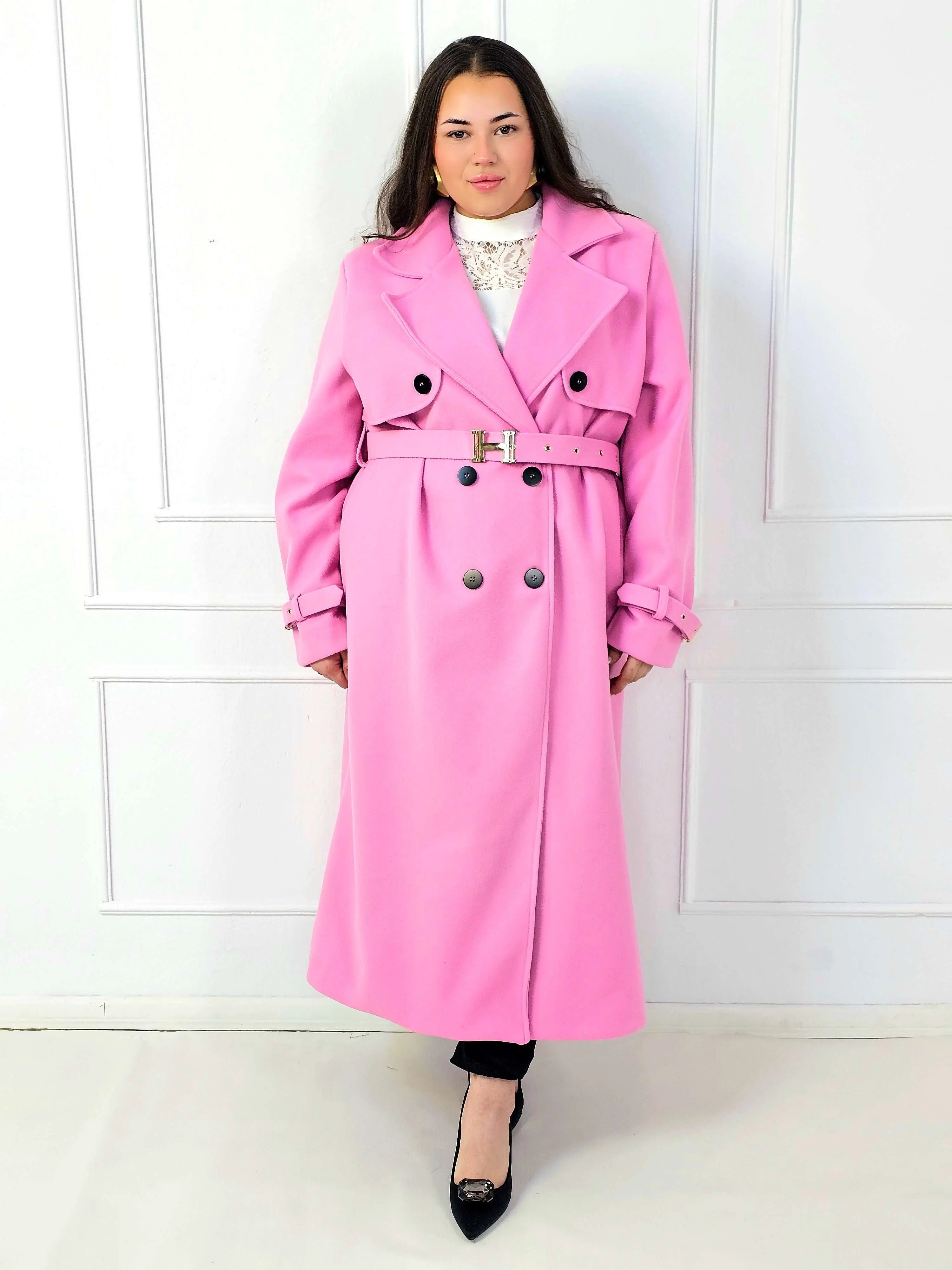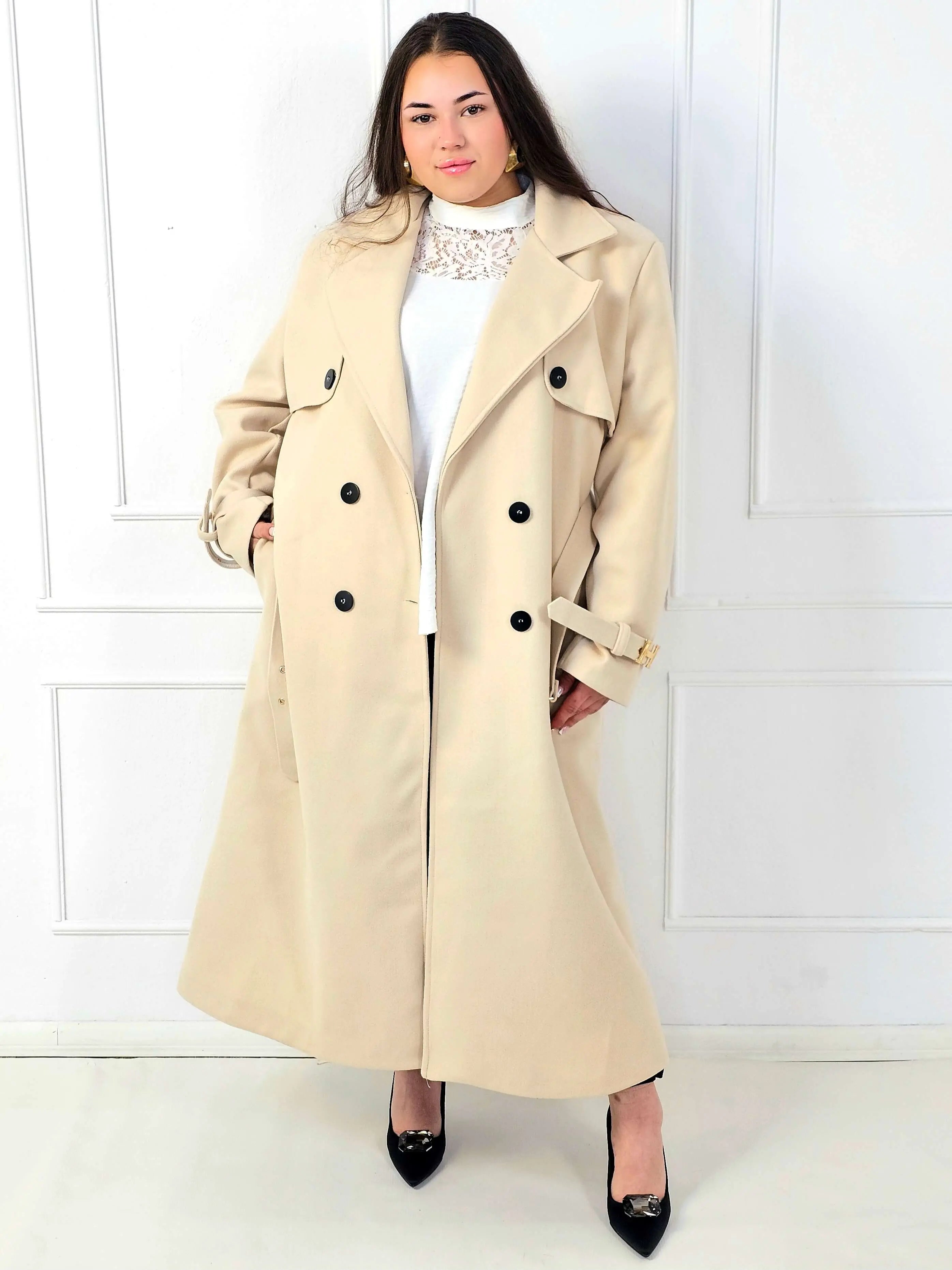 Płaszcz plus size dwurzędowy z paskiem – elegancki płaszcz XXL