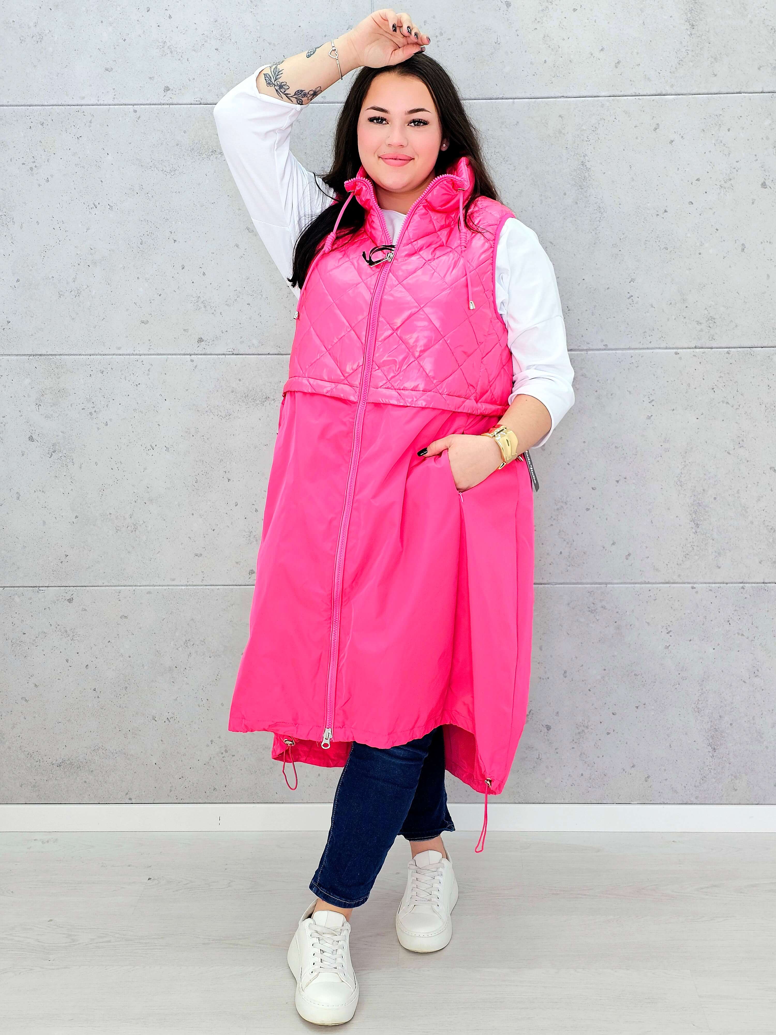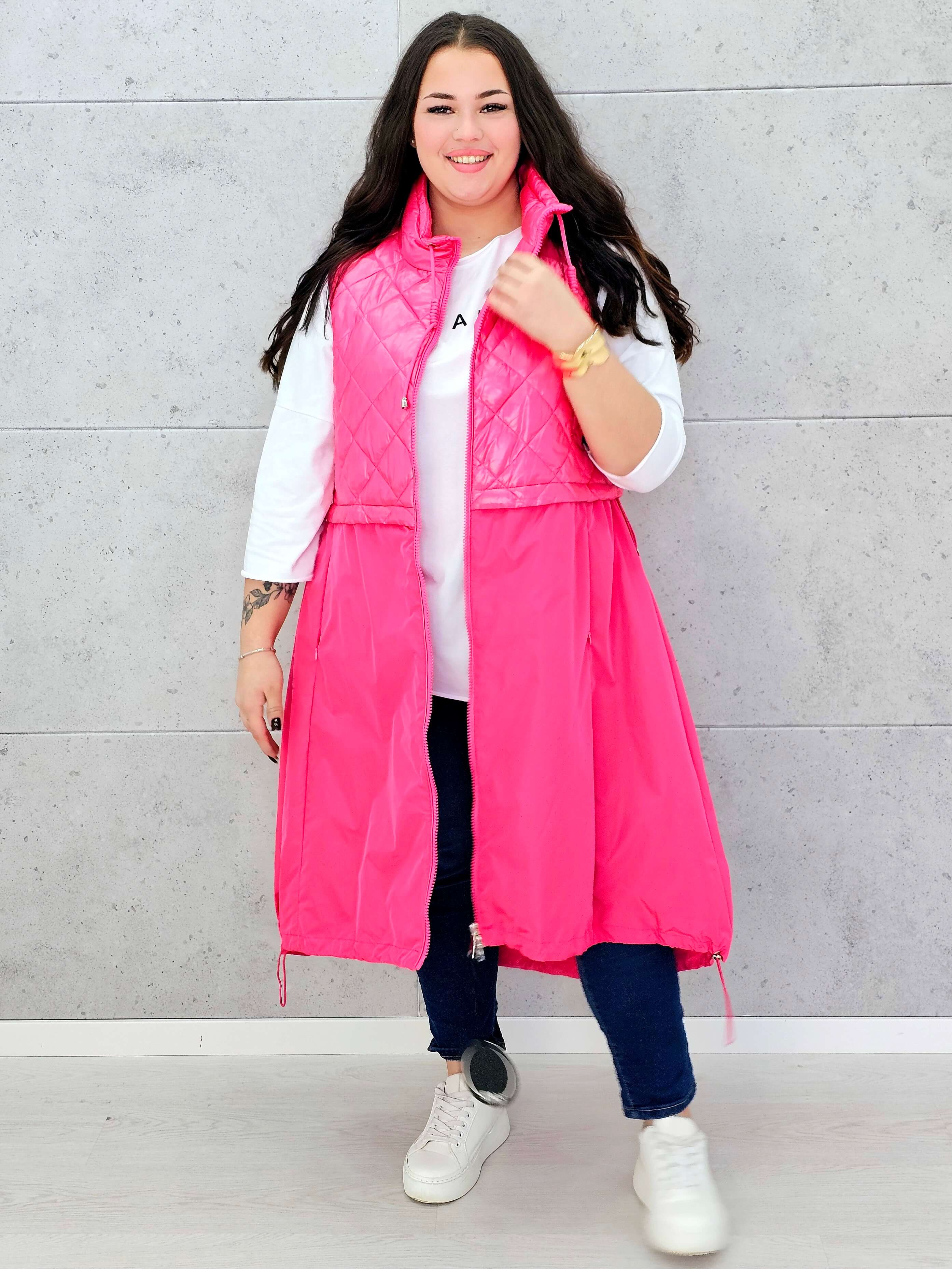 Dostępna w dwóch żywych kolorach – malinowym różu i świeżej zieleni – ta kamizelka plus size doda stylizacji energii i podkreśli Twój indywidualny styl. Doskonale komponuje się z bluzą, swetrem czy longsleevem, tworząc modny, miejski look idealny na sezon przejściowy.