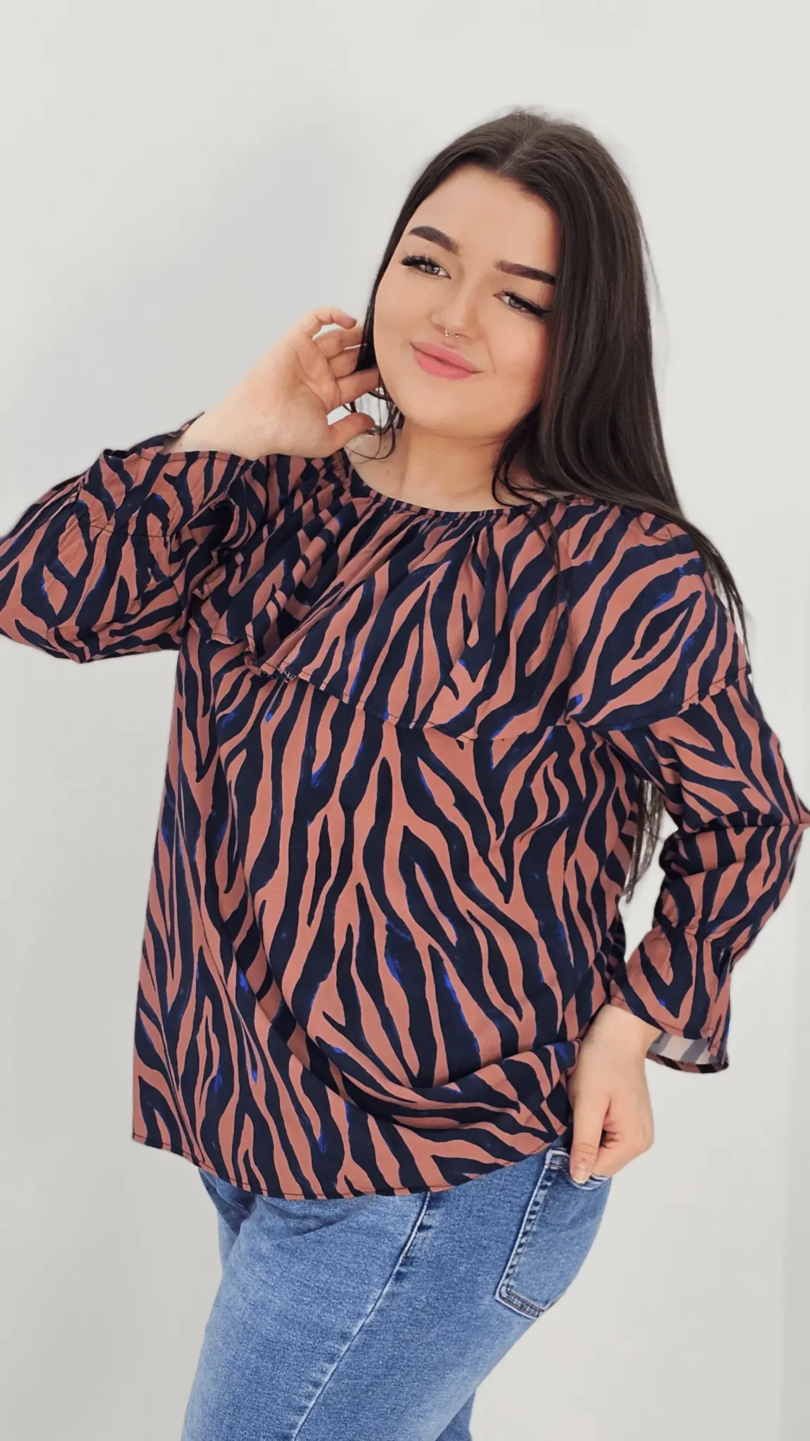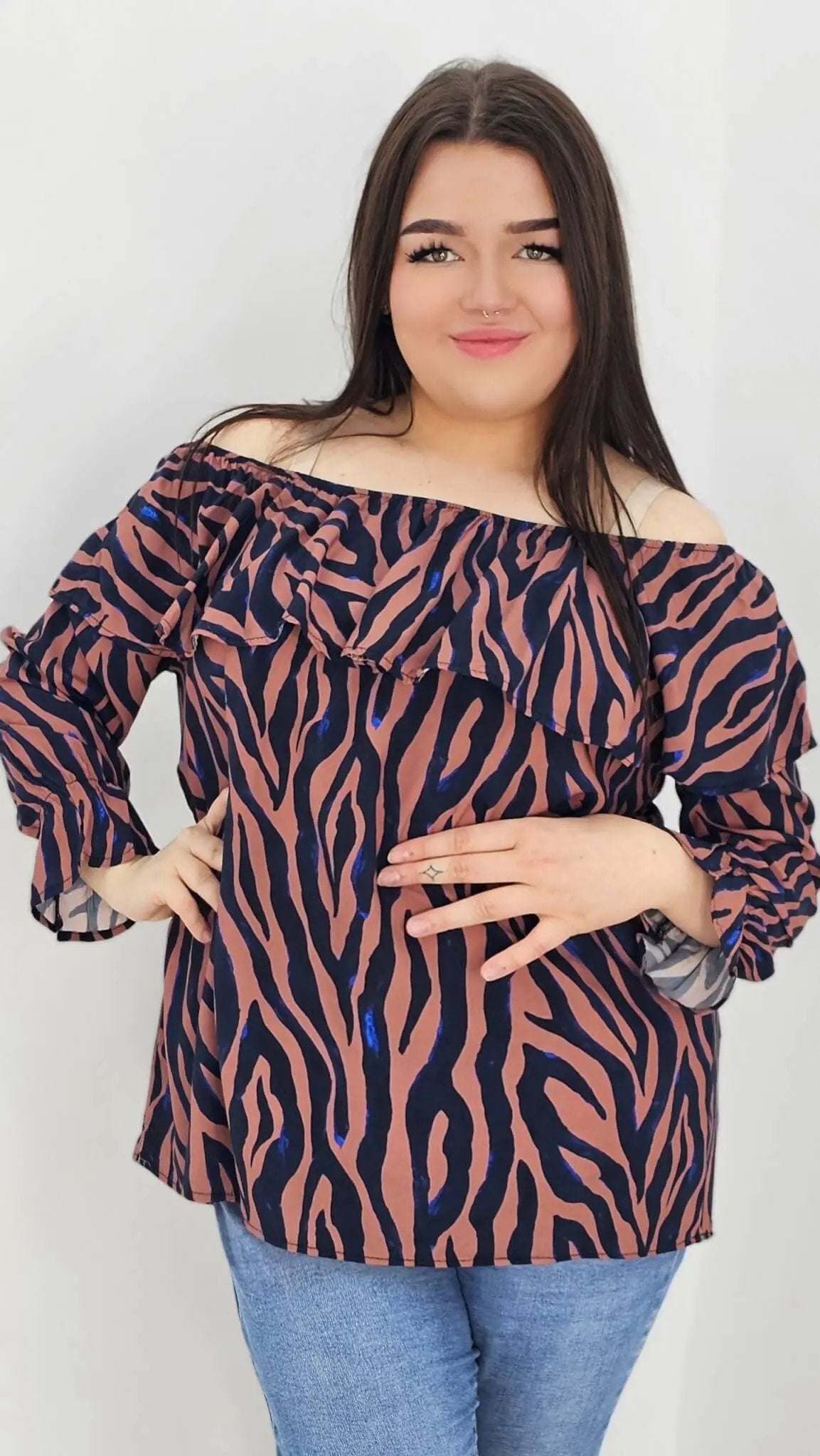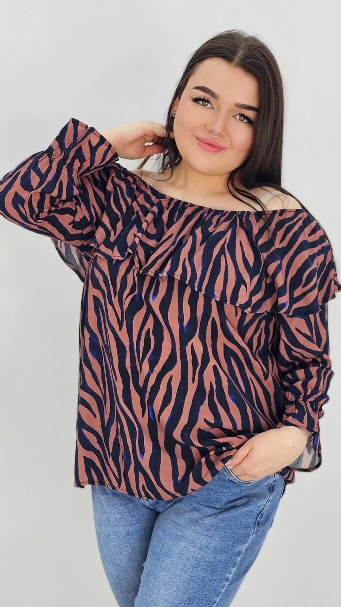 Bluzka hiszpanka to zazwyczaj luźniejszy fason z wydłużonym dekoltem wokół ramion, co dodaje bluzce elegancji i romantycznego charakteru. W połączeniu z wzorem i falbanką tworzy efektowną i modną kompozycję.