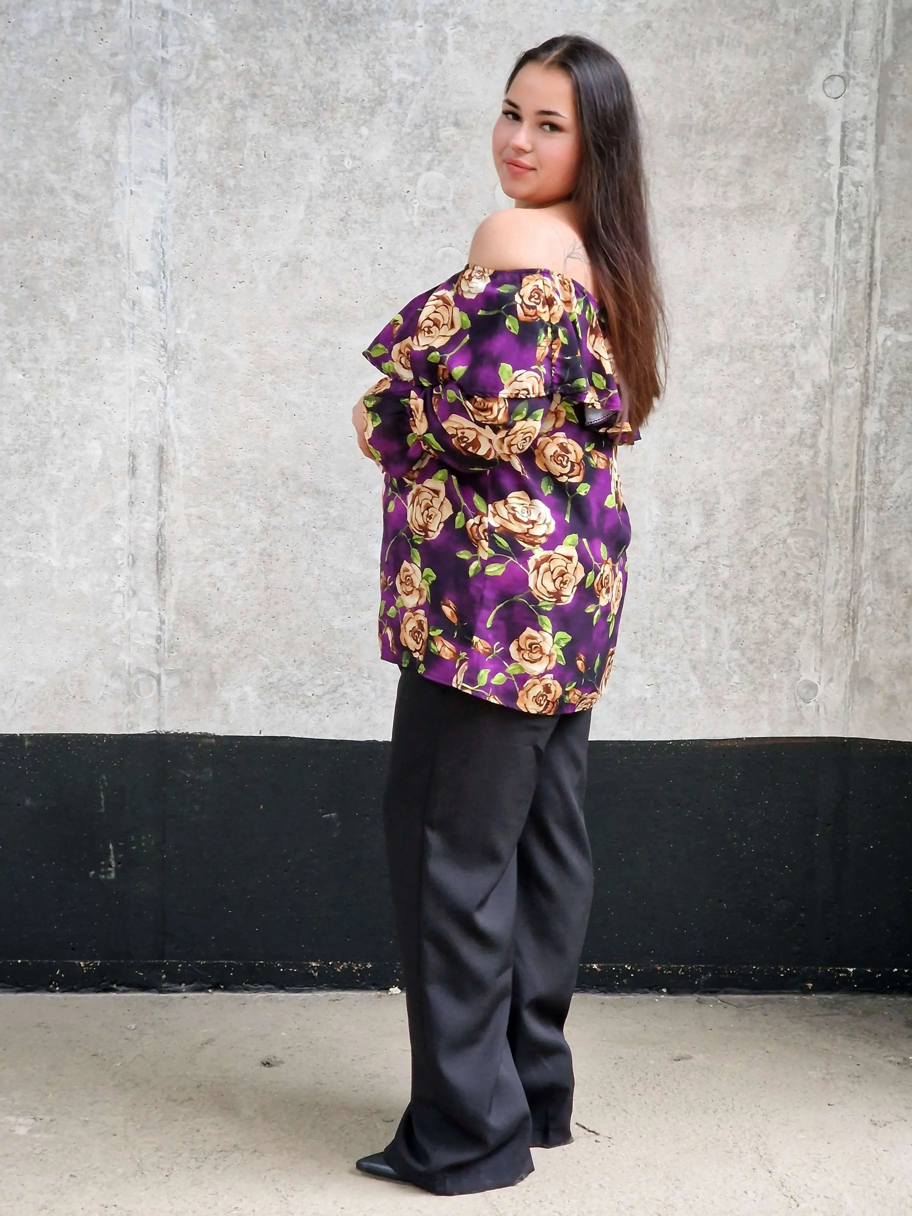 Bluzka hiszpanka to zazwyczaj luźniejszy fason z wydłużonym dekoltem wokół ramion, co dodaje bluzce elegancji i romantycznego charakteru. W połączeniu z wzorem i falbanką tworzy efektowną i modną kompozycję.