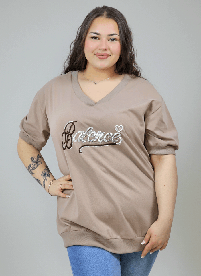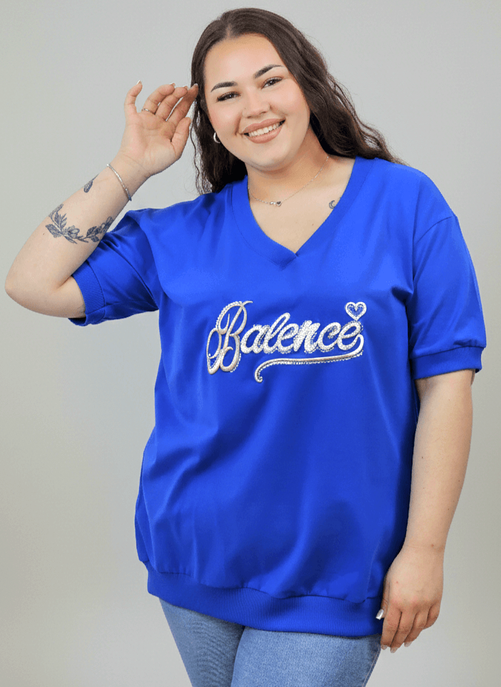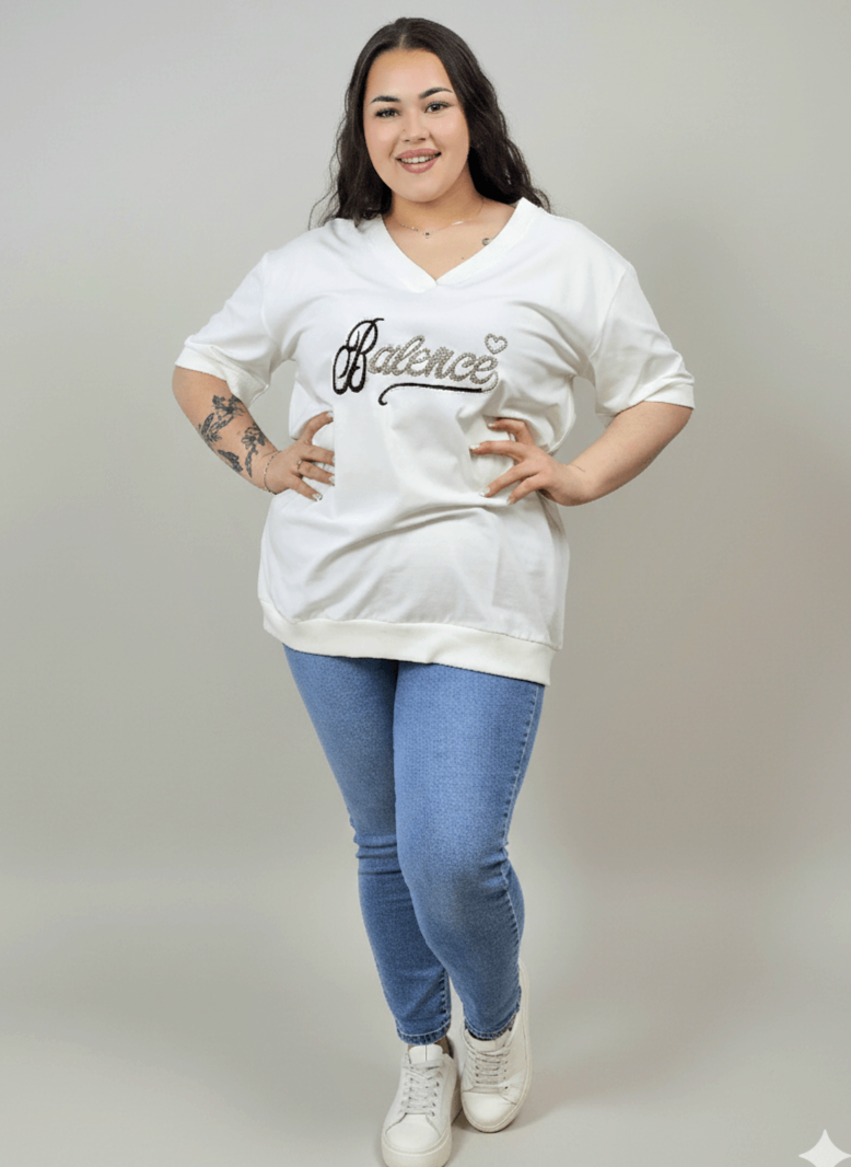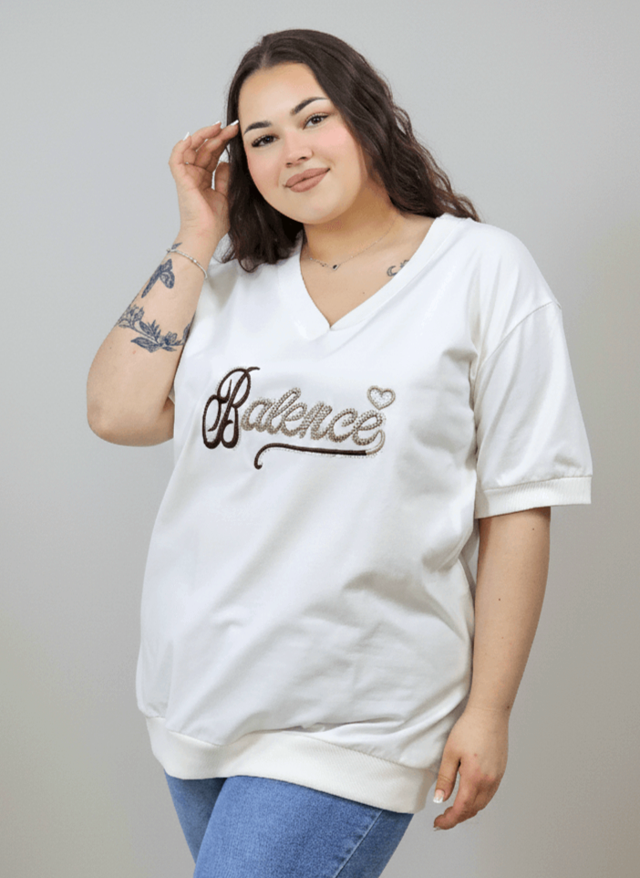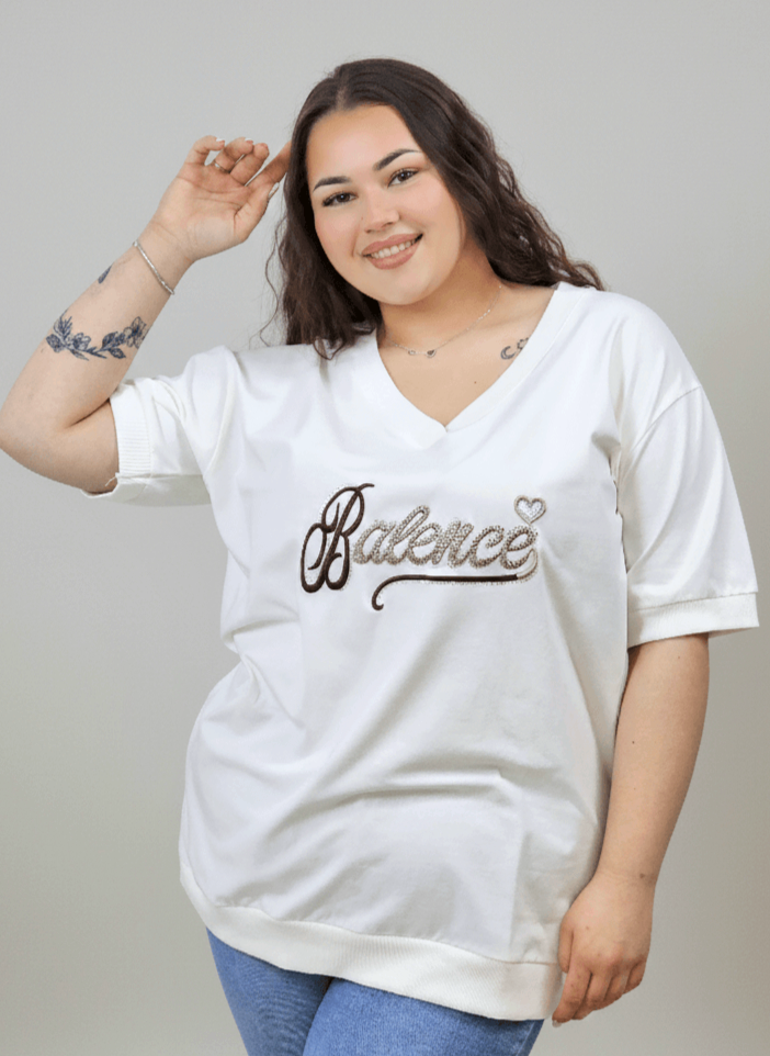 Bluzka plus size została wykonana z przyjemnej w dotyku, elastycznej dzianiny, która dopasowuje się do kształtów ciała i pozwala na swobodę ruchów. Ozdobny haft „Balance” z subtelnym sercem przyciąga wzrok i nadaje całości kobiecego charakteru. To doskonały wybór zarówno do codziennych stylizacji z jeansami, jak i do bardziej dopracowanych zestawów casualowych.