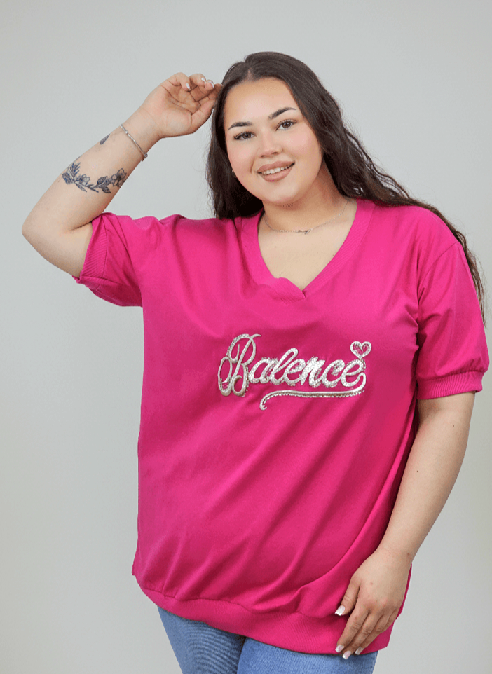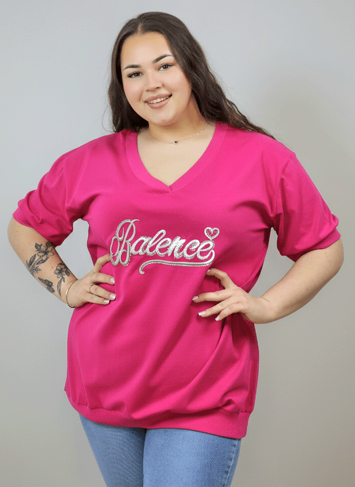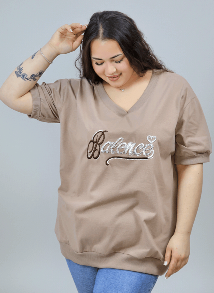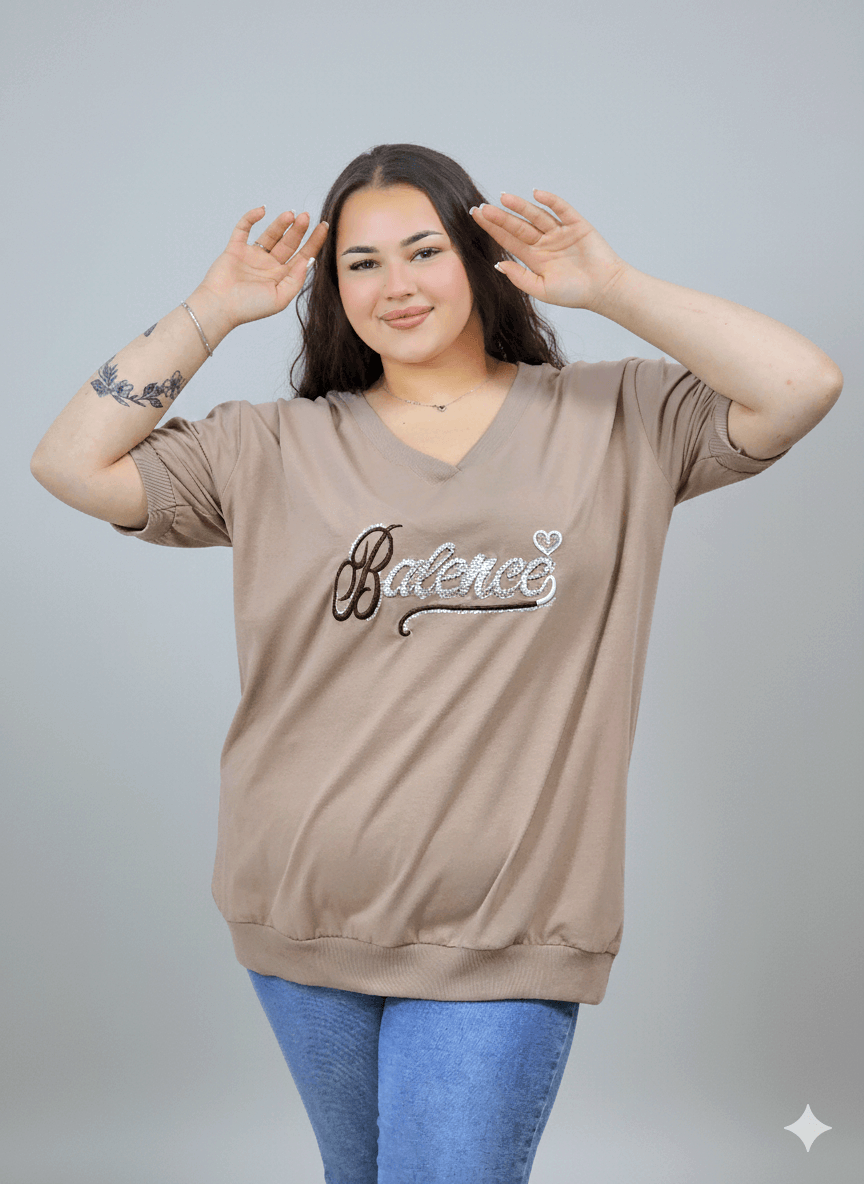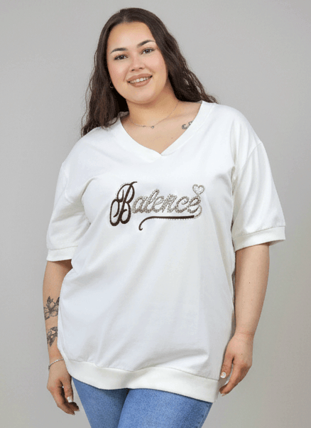 Bluzka plus size została wykonana z przyjemnej w dotyku, elastycznej dzianiny, która dopasowuje się do kształtów ciała i pozwala na swobodę ruchów. Ozdobny haft „Balance” z subtelnym sercem przyciąga wzrok i nadaje całości kobiecego charakteru. To doskonały wybór zarówno do codziennych stylizacji z jeansami, jak i do bardziej dopracowanych zestawów casualowych.