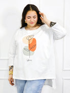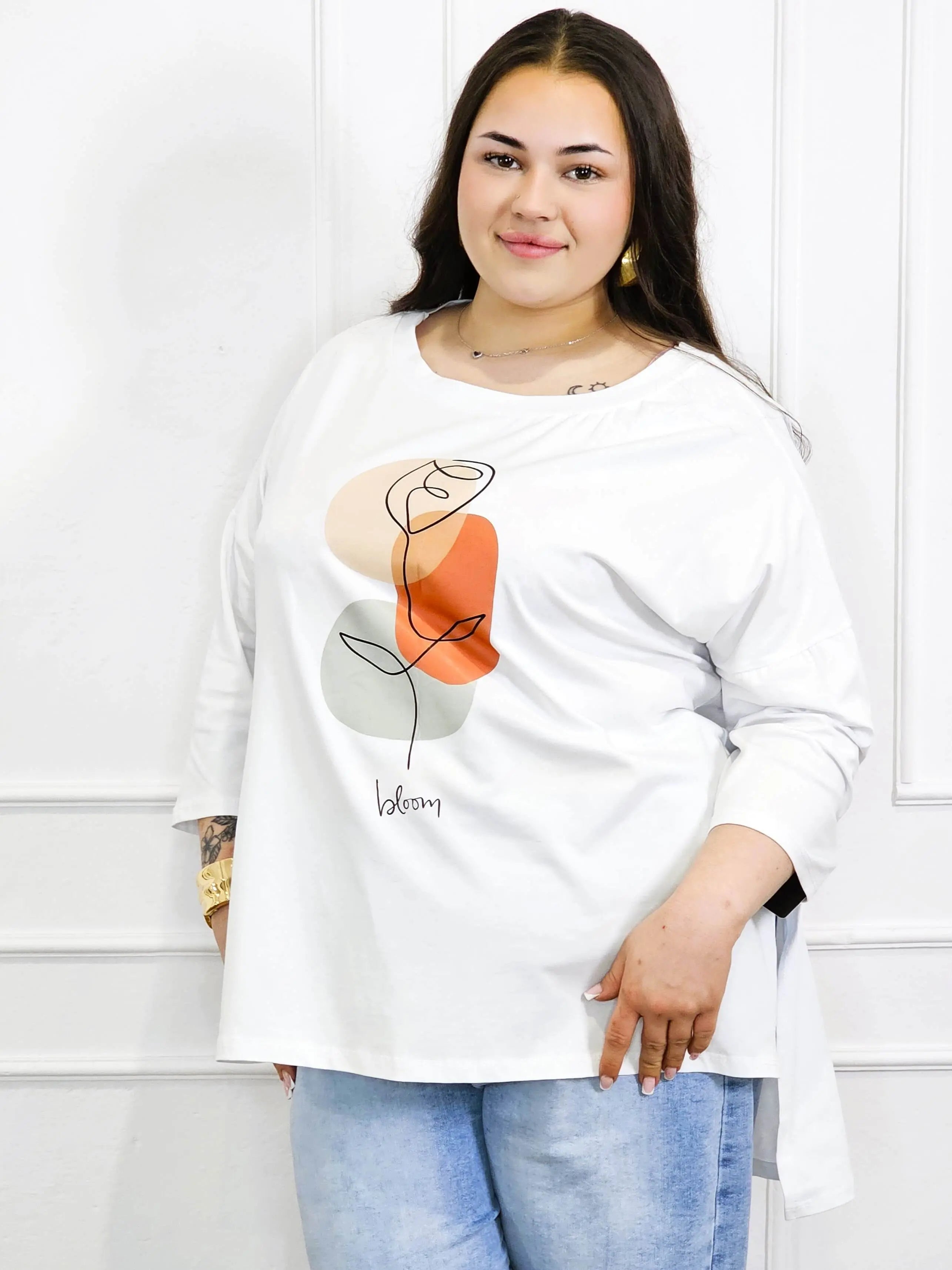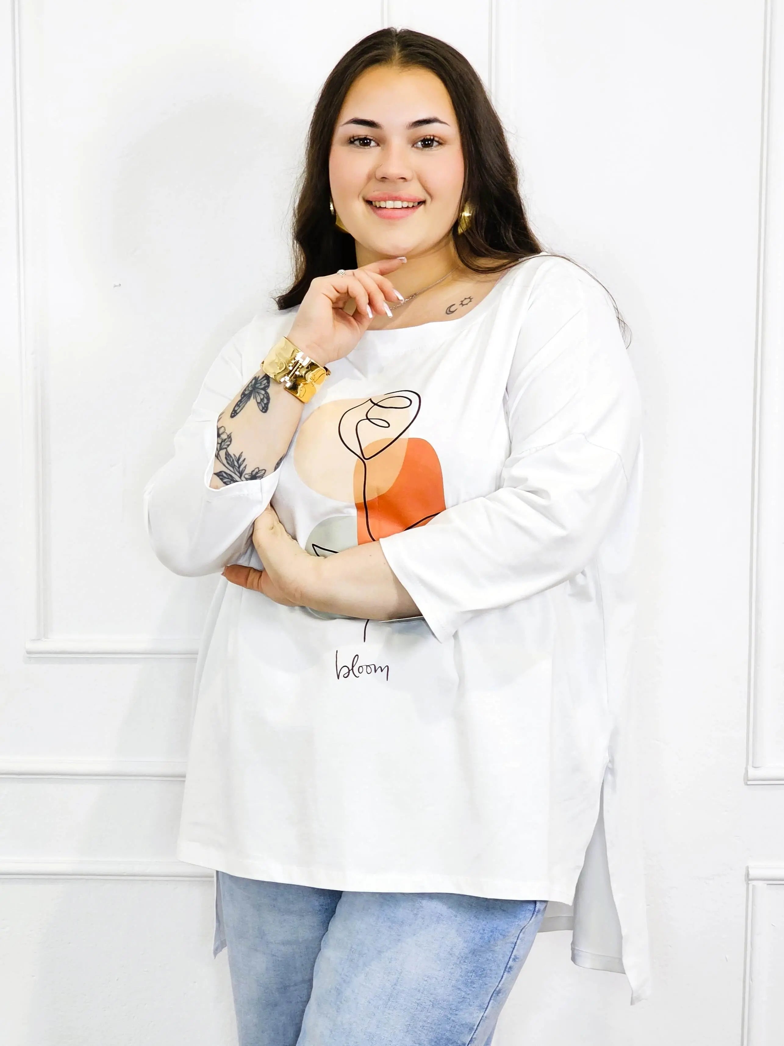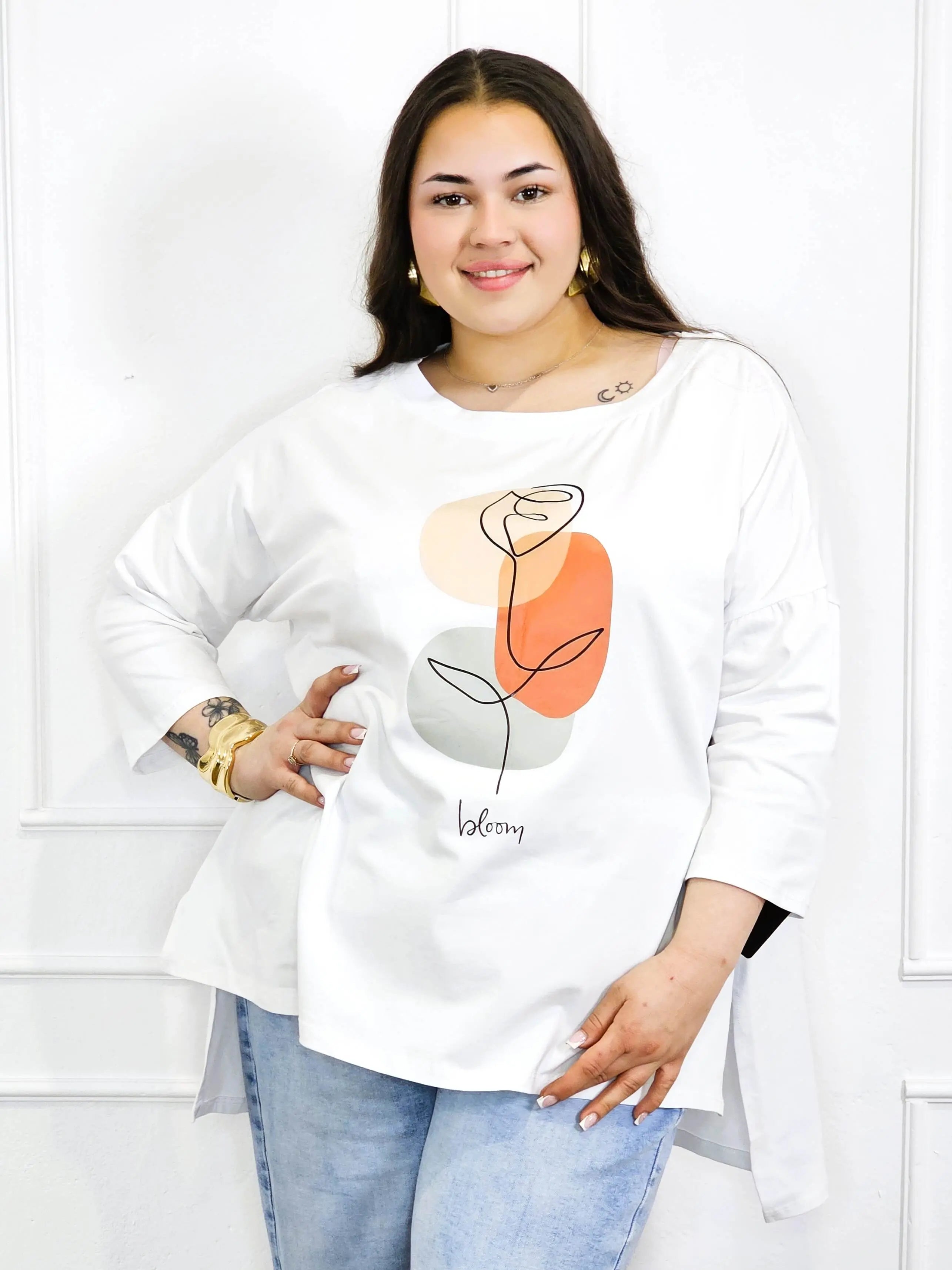 Bluzka plus size biała oversize z nadrukiem bloom – rękaw 3/4
