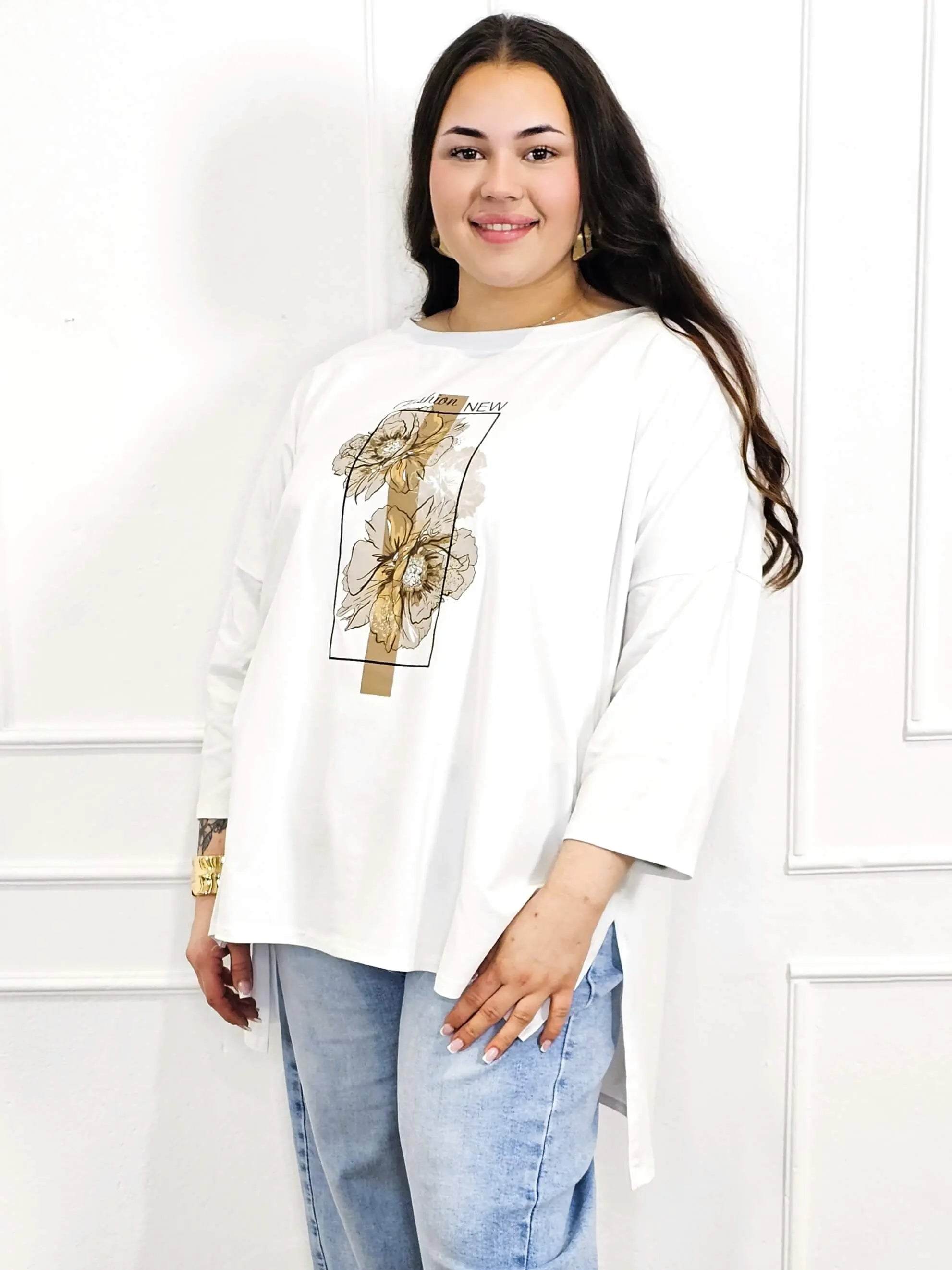 Bluzka plus size w białym kolorze z delikatnym, kwiatowym nadrukiem to świetna propozycja, jeśli szukasz wygodnej góry, która od razu robi efekt „wow”, ale nadal pasuje do wszystkiego. Luźny krój typu oversize pięknie układa się na sylwetce i zapewnia swobodę w okolicy biustu, talii i bioder, co doceni każda fanka mody plus size.