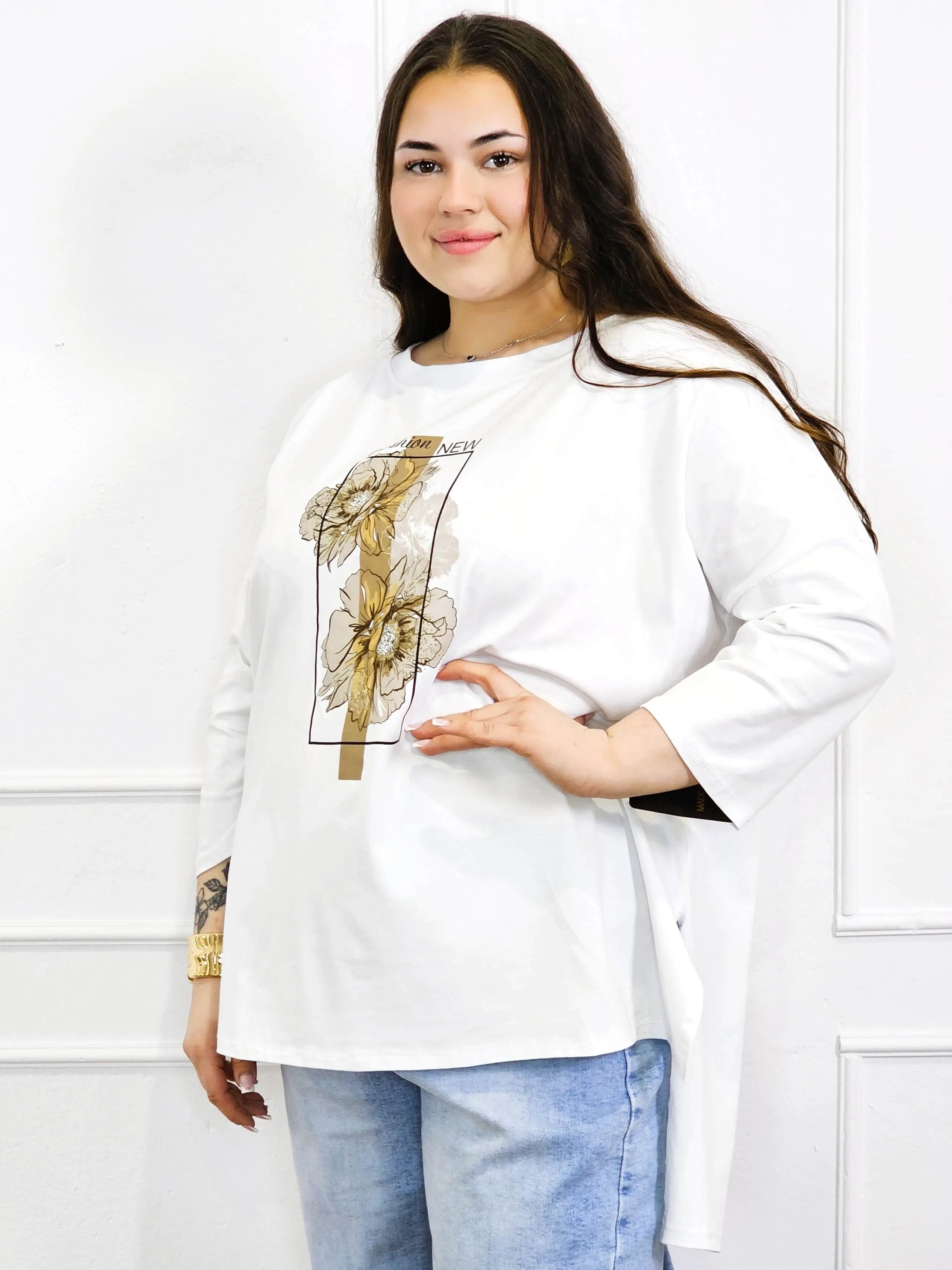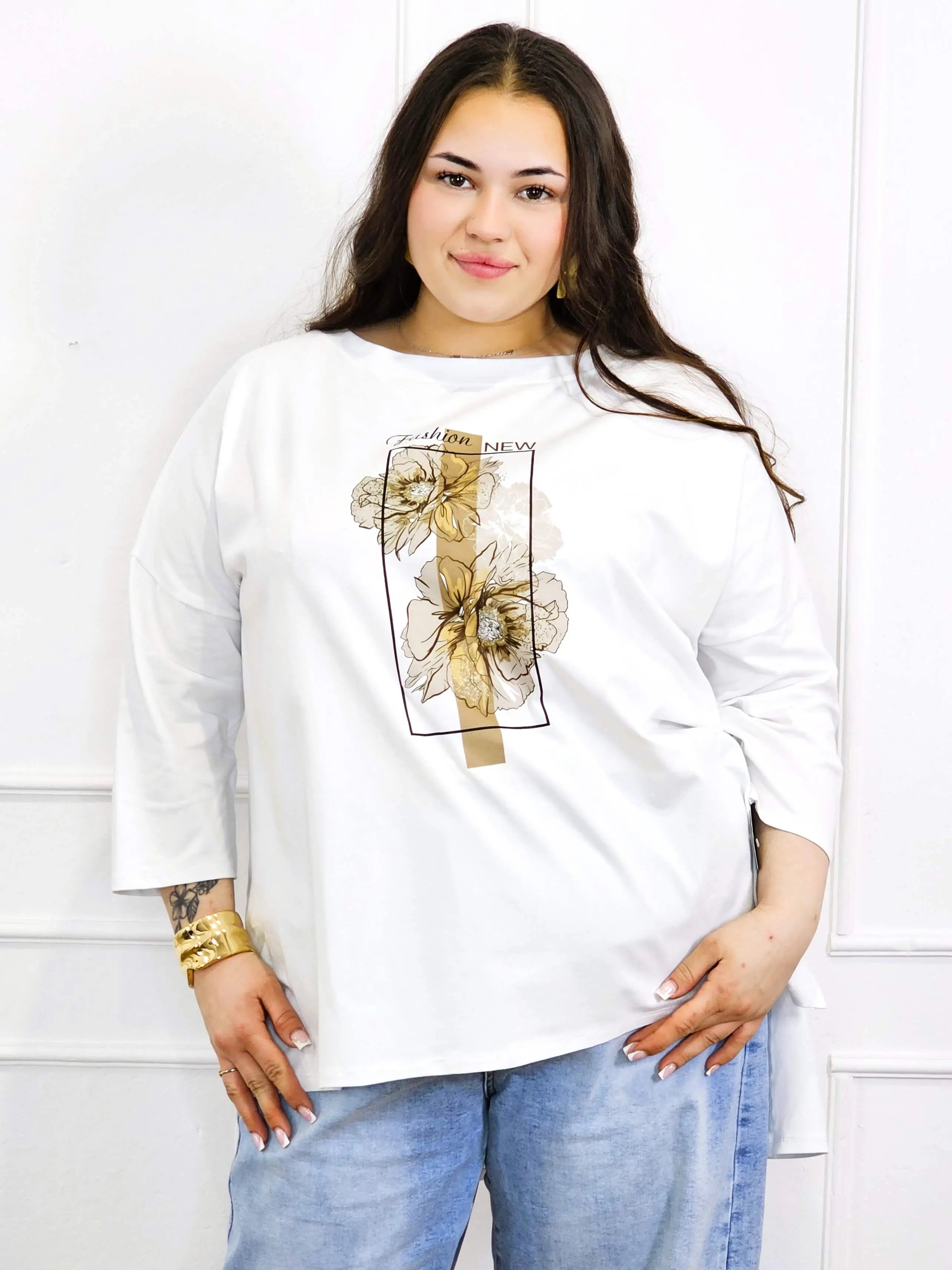 Bluzka plus size biała z kwiatowym nadrukiem i rękawem 3/4 – modny oversize
