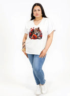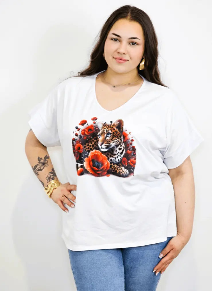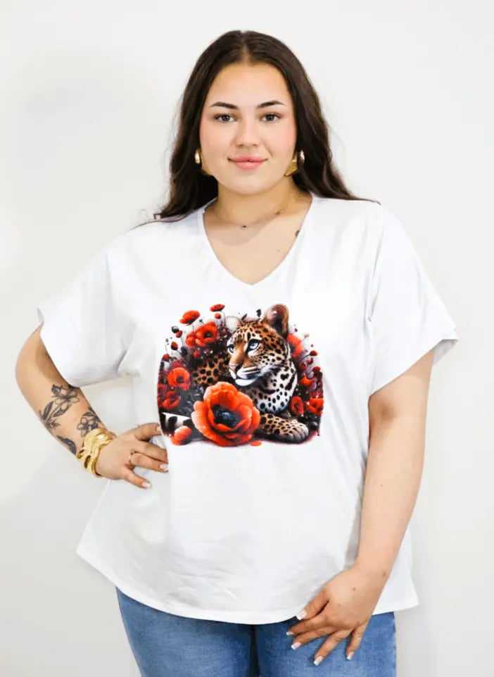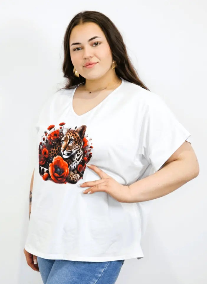 Bluzka plus size w kolorze białym z efektownym nadrukiem lamparta wśród czerwonych kwiatów to propozycja dla kobiet, które lubią wyraziste detale i modny charakter stylizacji. Dekolt w kształcie litery V pięknie wysmukla górę sylwetki i sprawia, że bluzka plus size świetnie układa się przy większym biuście. To model idealny do codziennych zestawów z jeansami lub legginsami.