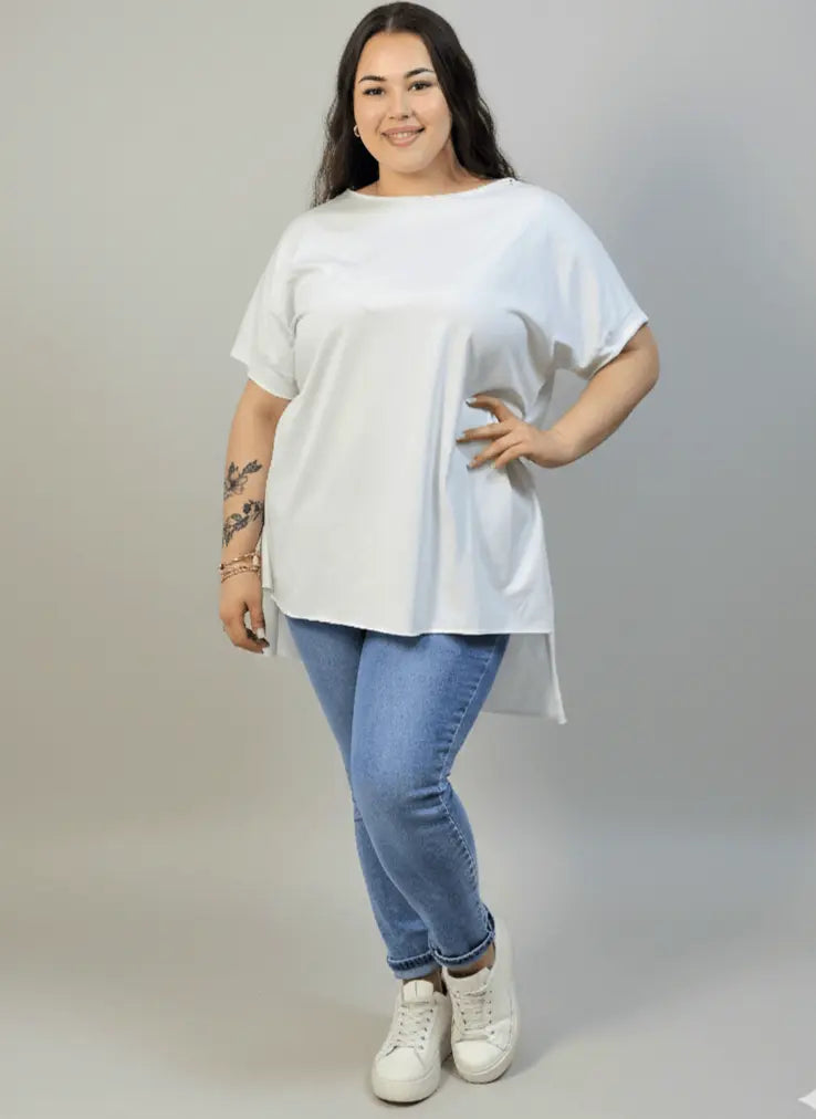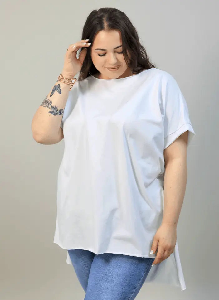 Luźny, swobodny fason sprawia, że bluzka plus size doskonale układa się na sylwetce i nie opina biustu, talii ani bioder. Wydłużony tył zapewnia komfort noszenia i optycznie wysmukla dolne partie sylwetki, co jest szczególnie istotne w modzie plus size dla kobiet. Krótki rękaw i miękka linia ramion podkreślają lekkość formy.