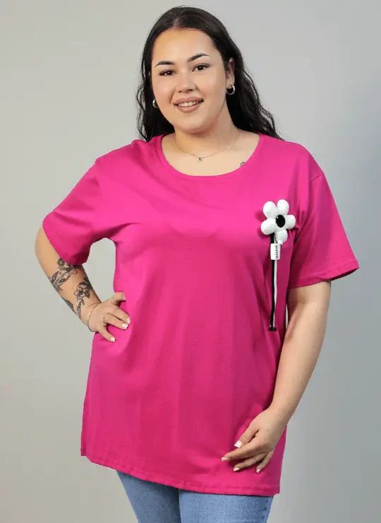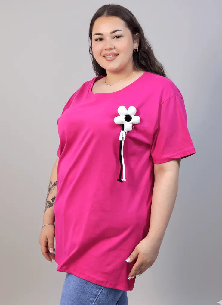 Bluzka plus size fuksjowa z ozdobnym kwiatem 3D