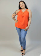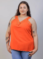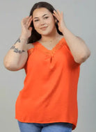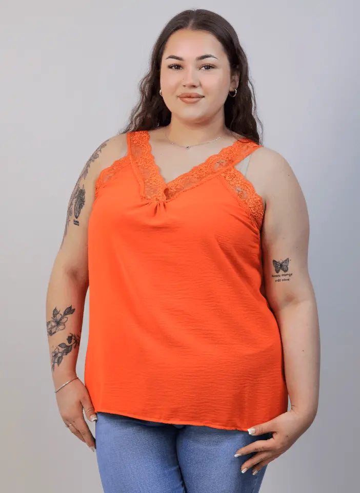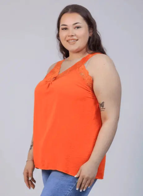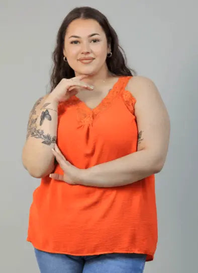 Bluzka plus size w intensywnym koralowym kolorze to kobieca i wygodna propozycja na cieplejsze dni. Model na szerokich ramiączkach został ozdobiony delikatną koronką przy dekolcie w kształcie litery V, co dodaje całości lekkości i subtelnej elegancji. Dzięki prostemu, luźnemu krojowi bluzka plus size swobodnie układa się na sylwetce i nie opina newralgicznych partii ciała.