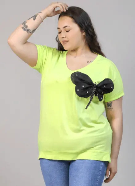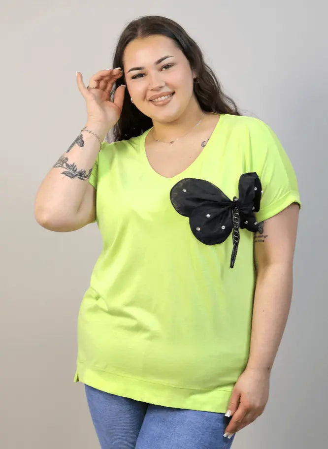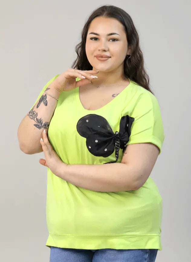 Bluzka plus size w energetycznym, limonkowym kolorze to propozycja dla kobiet, które lubią wyróżniać się kolorem i nowoczesnymi detalami. Model przyciąga uwagę efektowną czarną kokardą umieszczoną z przodu, ozdobioną drobnymi dżetami, która nadaje całości charakteru i modnego kontrastu. Dzięki temu bluzka plus size łączy prostotę kroju z wyrazistym akcentem dekoracyjnym.