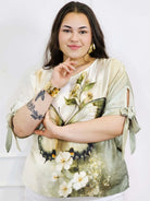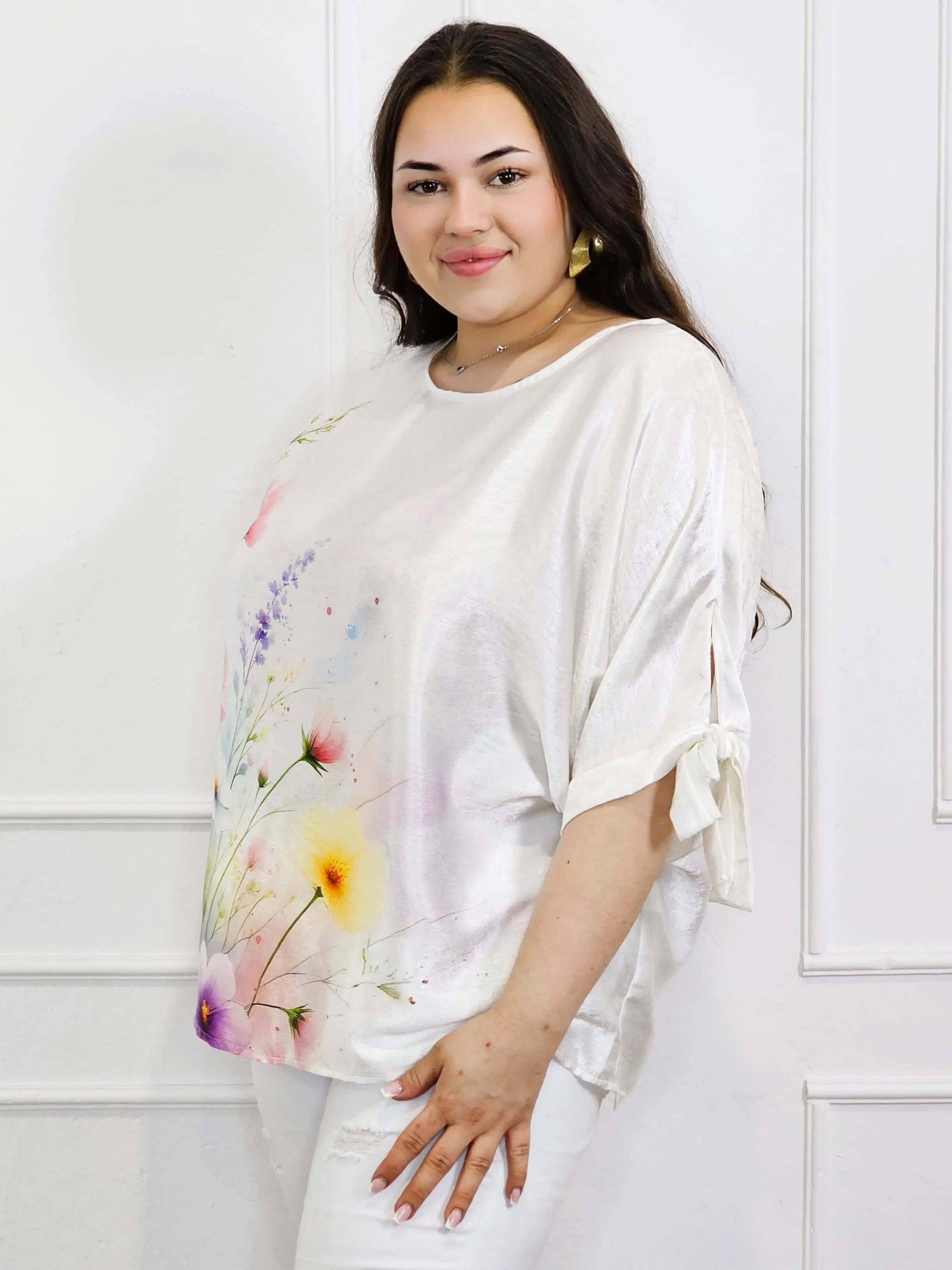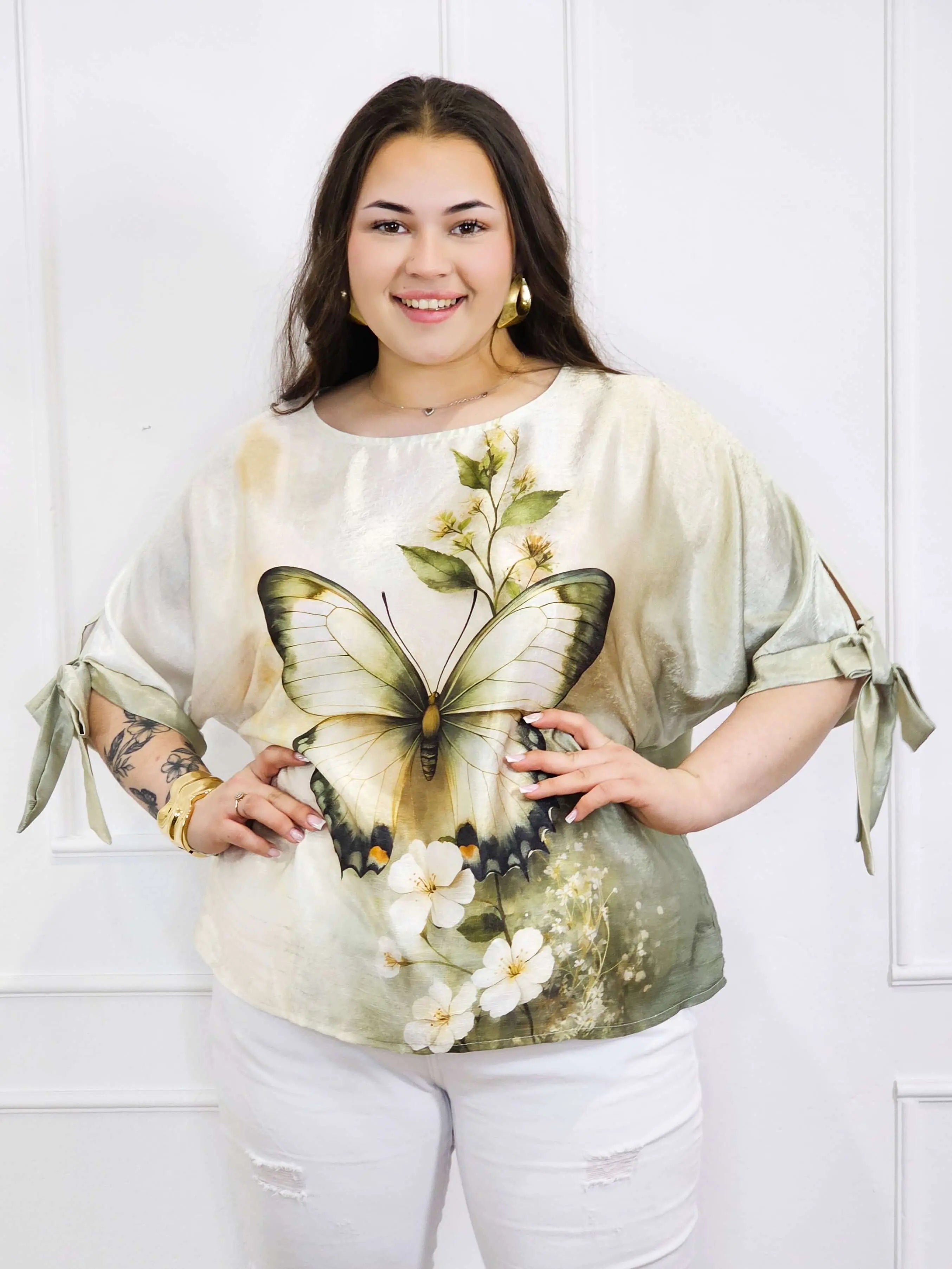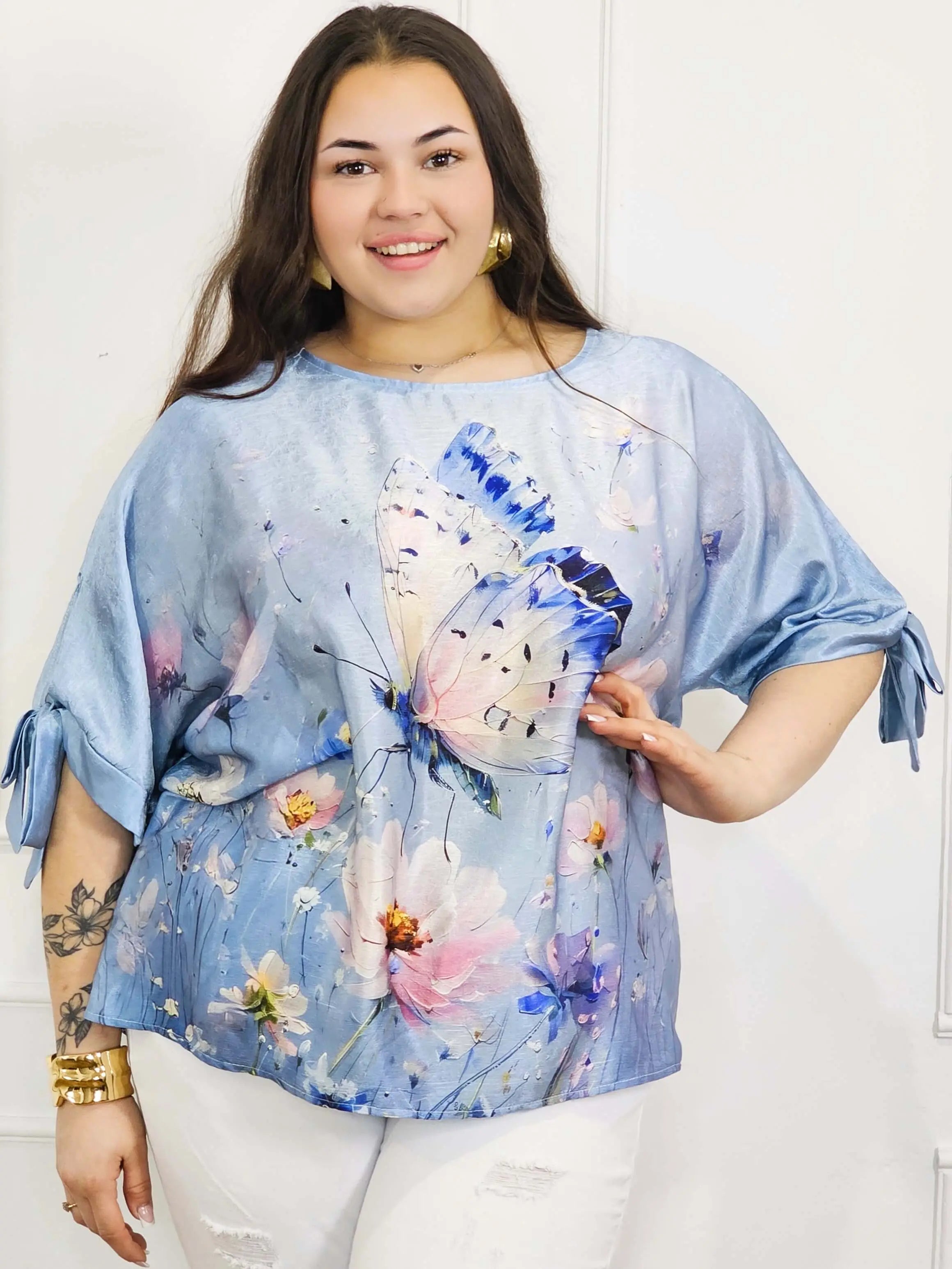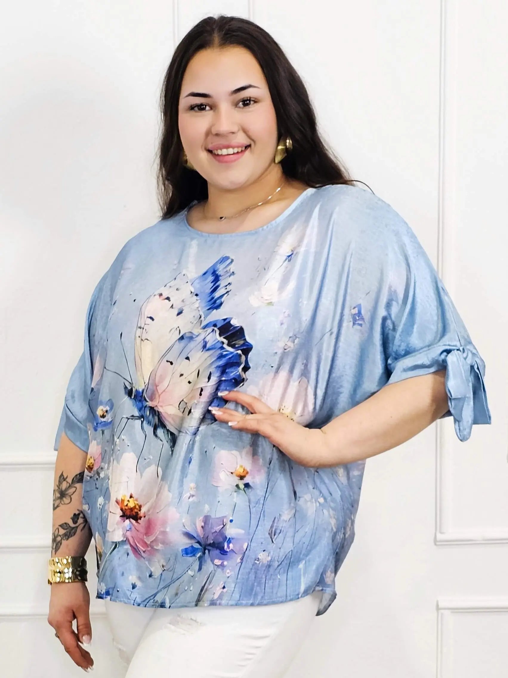 Bluzka plus size przyciąga uwagę artystycznym printem – kwiatowym lub z motywem motyla – który nadaje całości lekkości i kobiecego charakteru. Rękawy zakończone wiązaniem to modny detal, który pozwala subtelnie wyeksponować ramiona i dodać stylizacji lekkości. Prosty dekolt sprawia, że bluzka jest uniwersalna i pasuje do wielu dodatków.