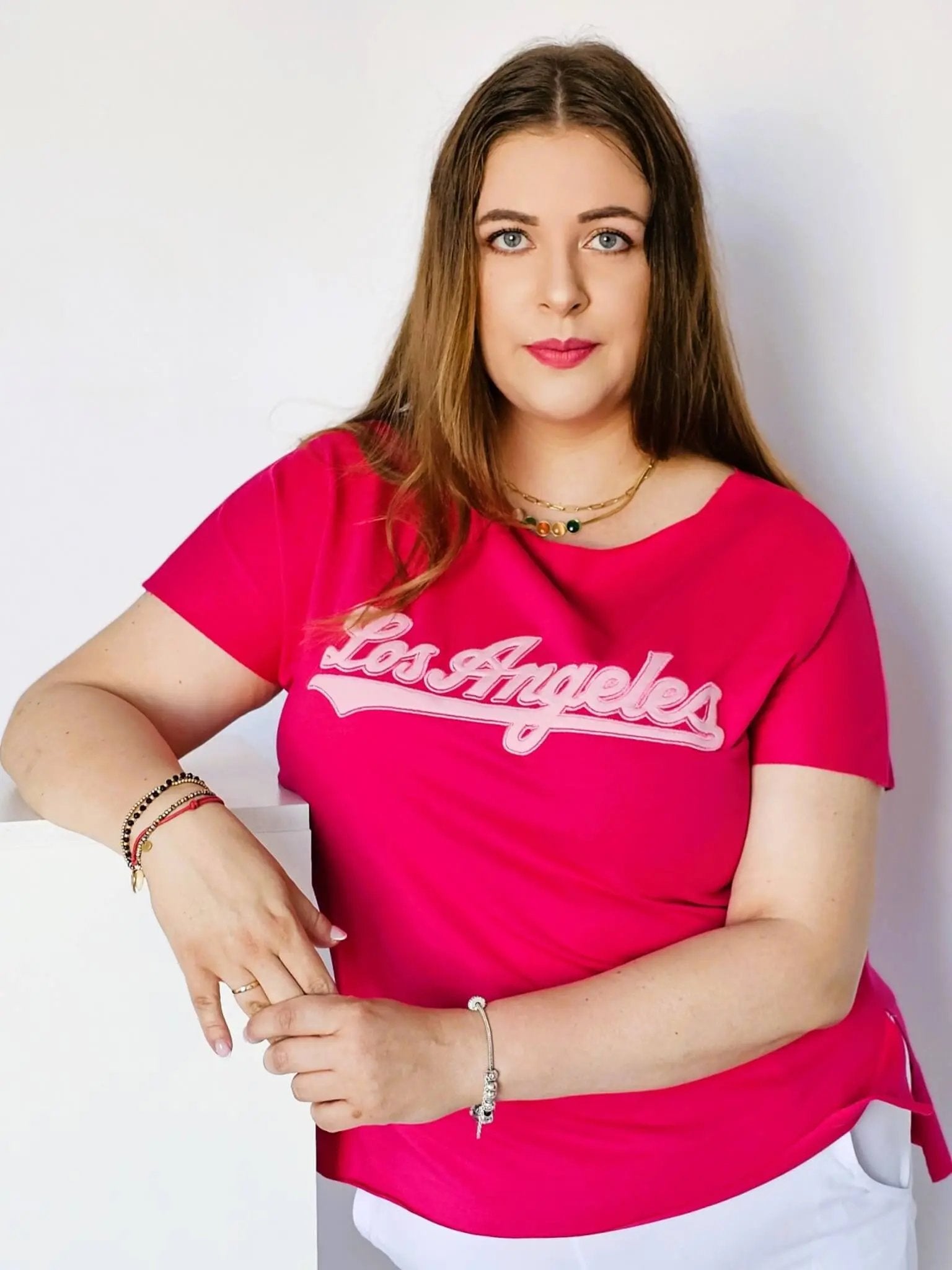 Ta koszulka bawełniana to prawdziwy super model w swojej kategorii. Jej wyjątkowy urok tkwi w haftowanym napisie umieszczonym na przodzie koszulki. Haftowanie dodaje jej stylowego i unikalnego charakteru, przyciągając uwagę i wyróżniając się spośród innych koszulek. Dekolt koszulki jest zaokrąglony, co dodaje jej delikatności i subtelności. Jest to klasyczny, ale zawsze modny fason, który pasuje do wielu stylizacji i może być noszony zarówno na co dzień, jak i na bardziej formalne okazje. Ta koszulka bawełniana z pewnością stanie się ulubionym elementem garderoby, łącząc wygodę materiału i wyjątkowy design.