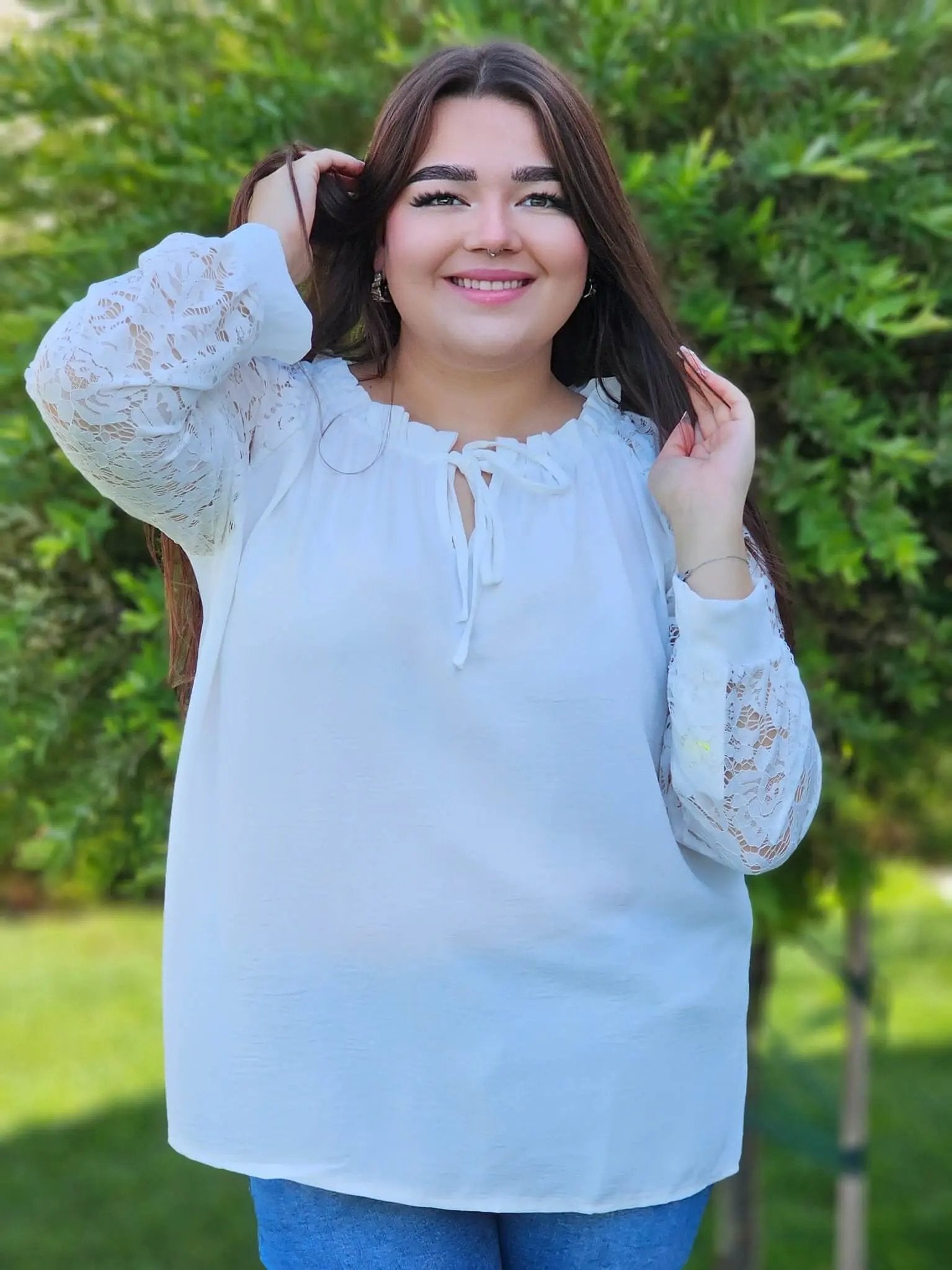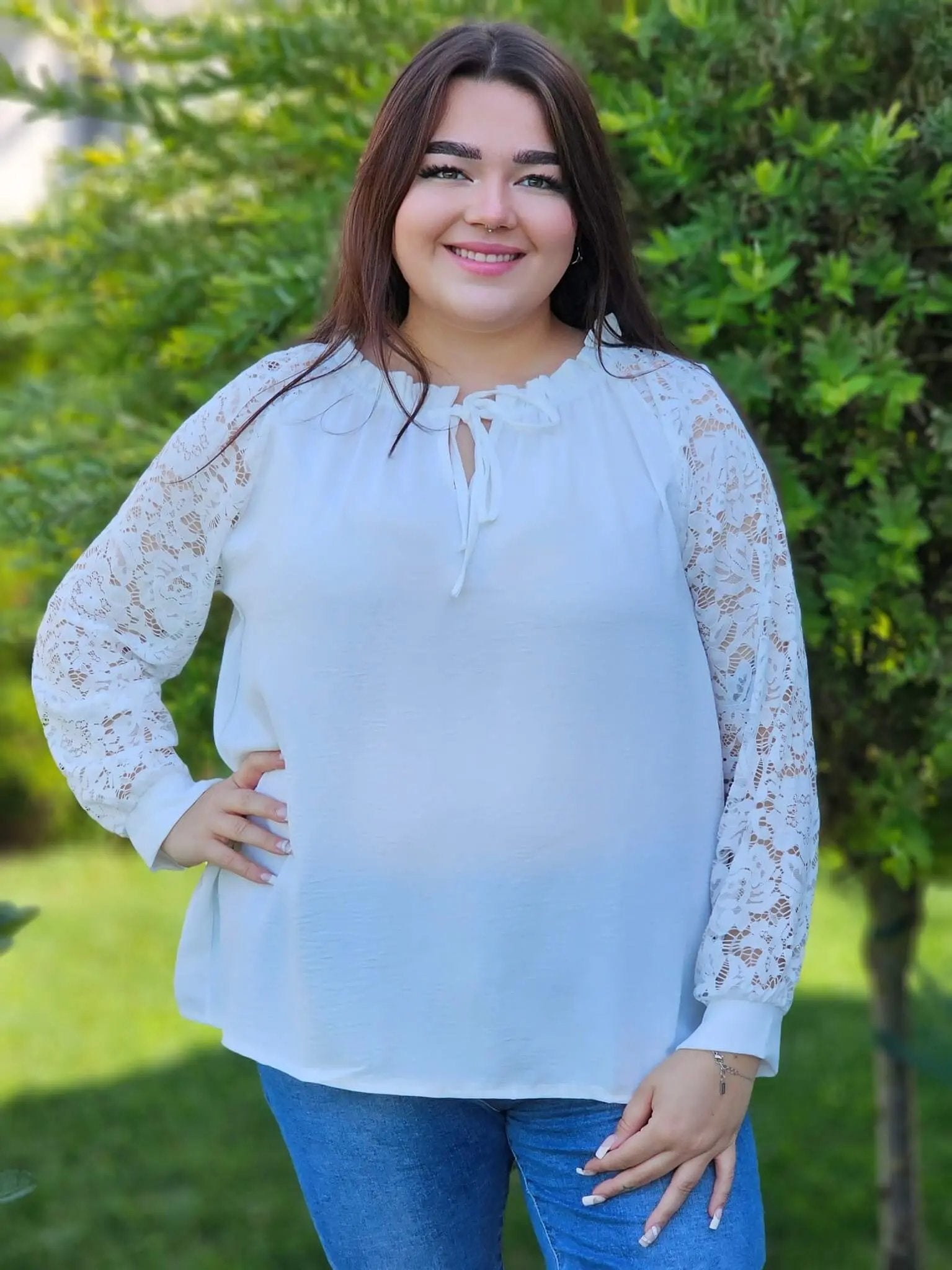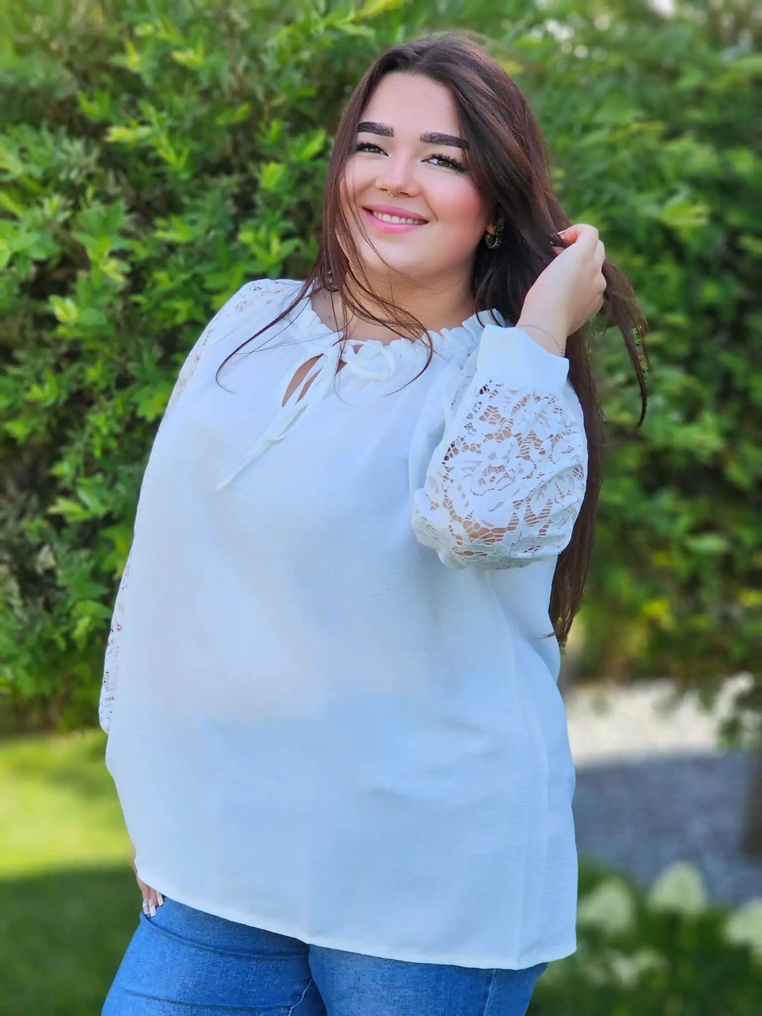 Romantyczna biała bluzka z koronkowymi rękawami - biel