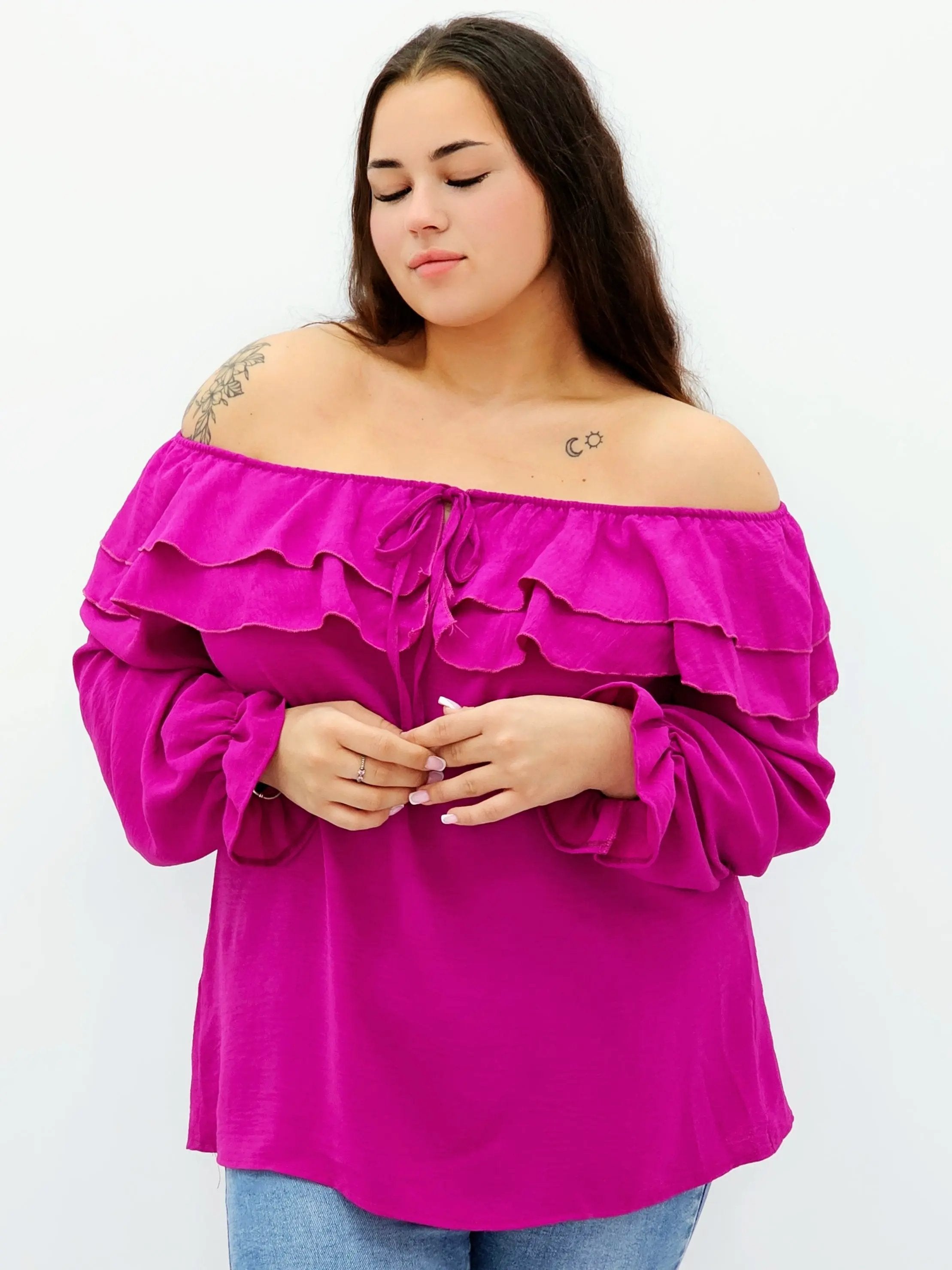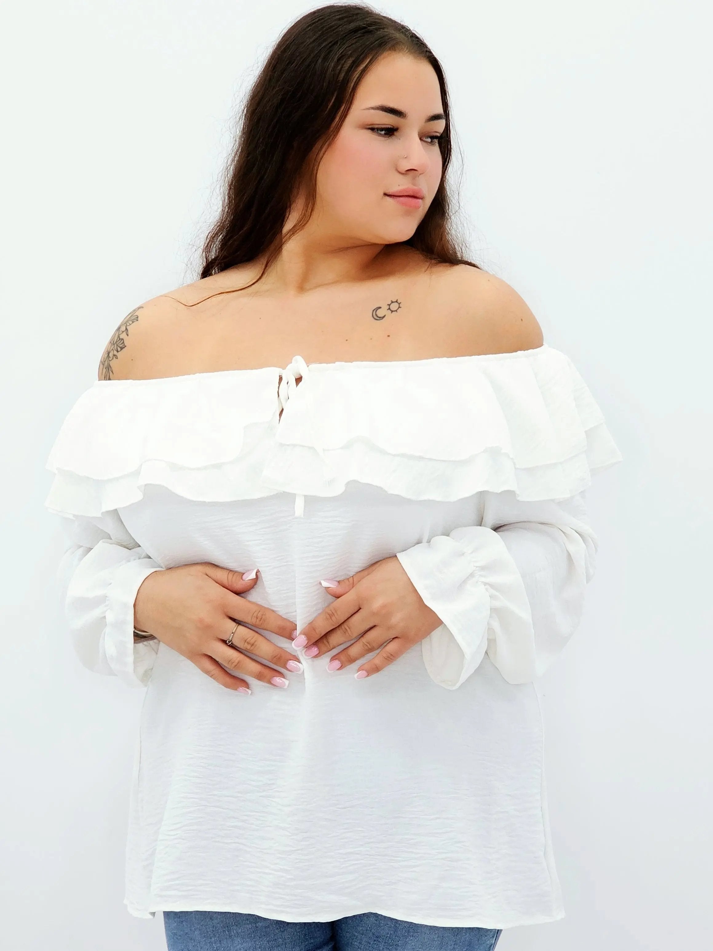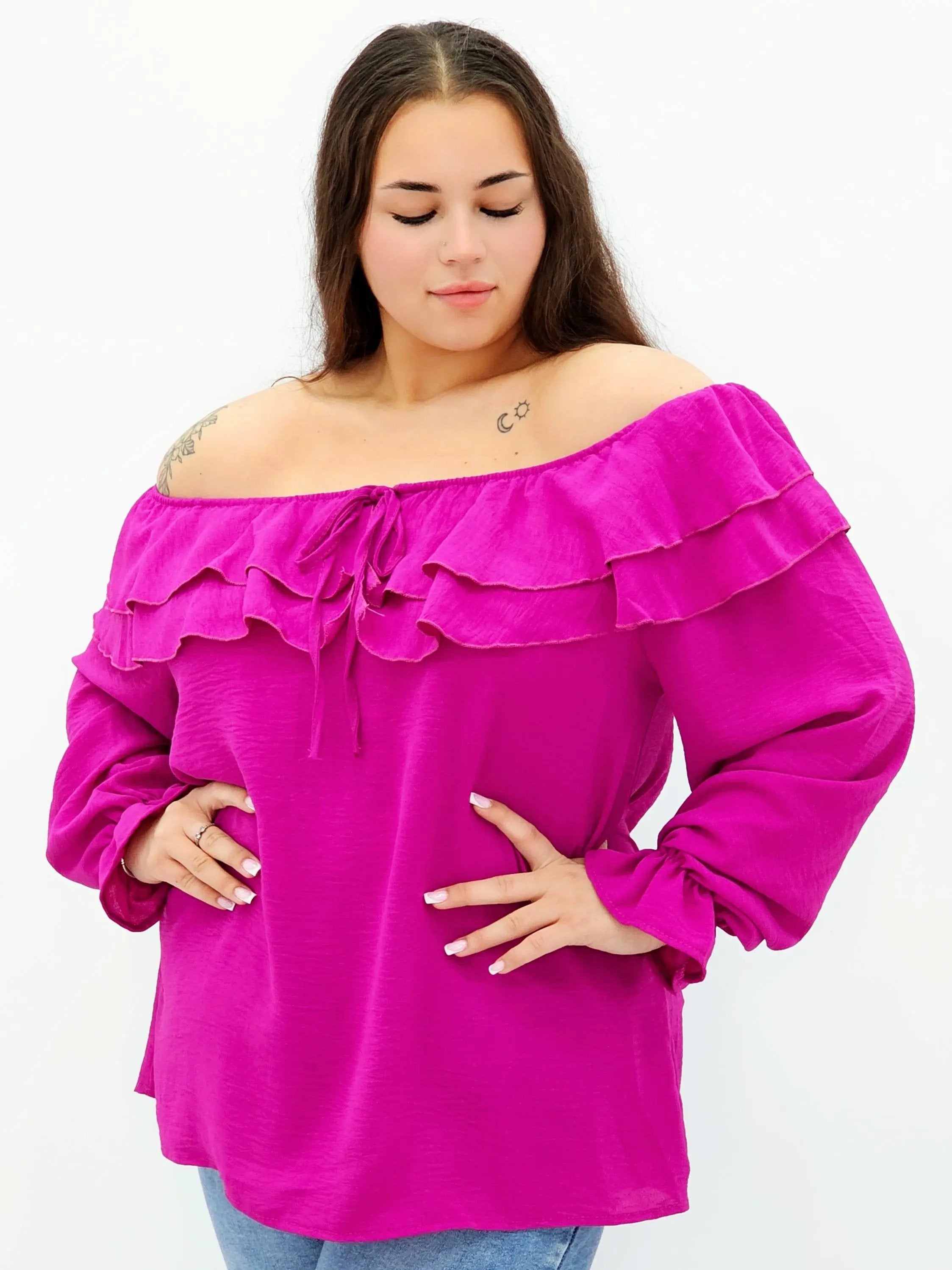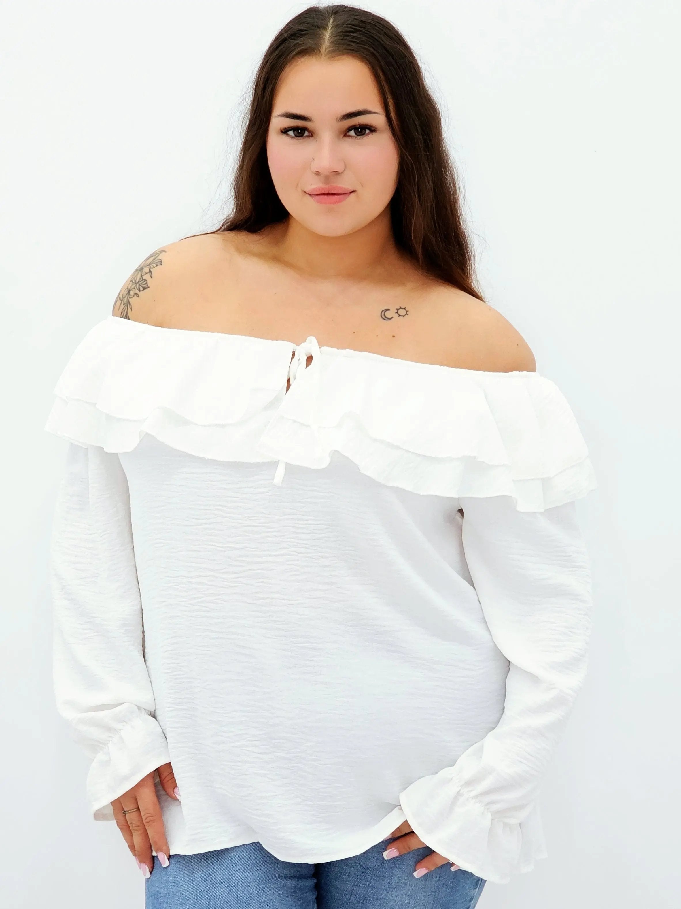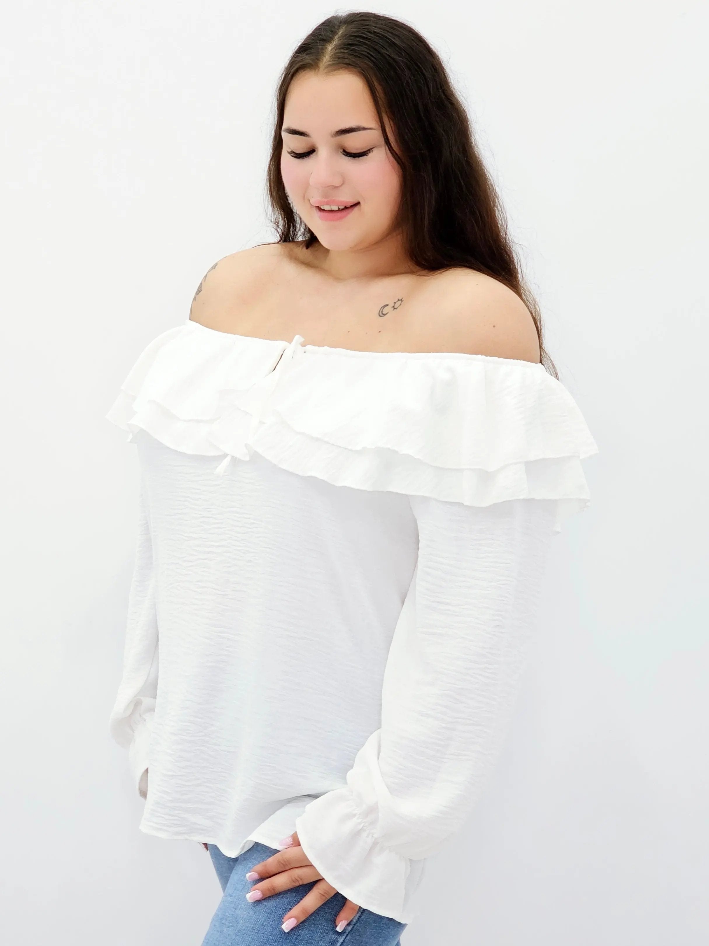 Stylowa bluzka z falbanami i odkrytymi ramionami