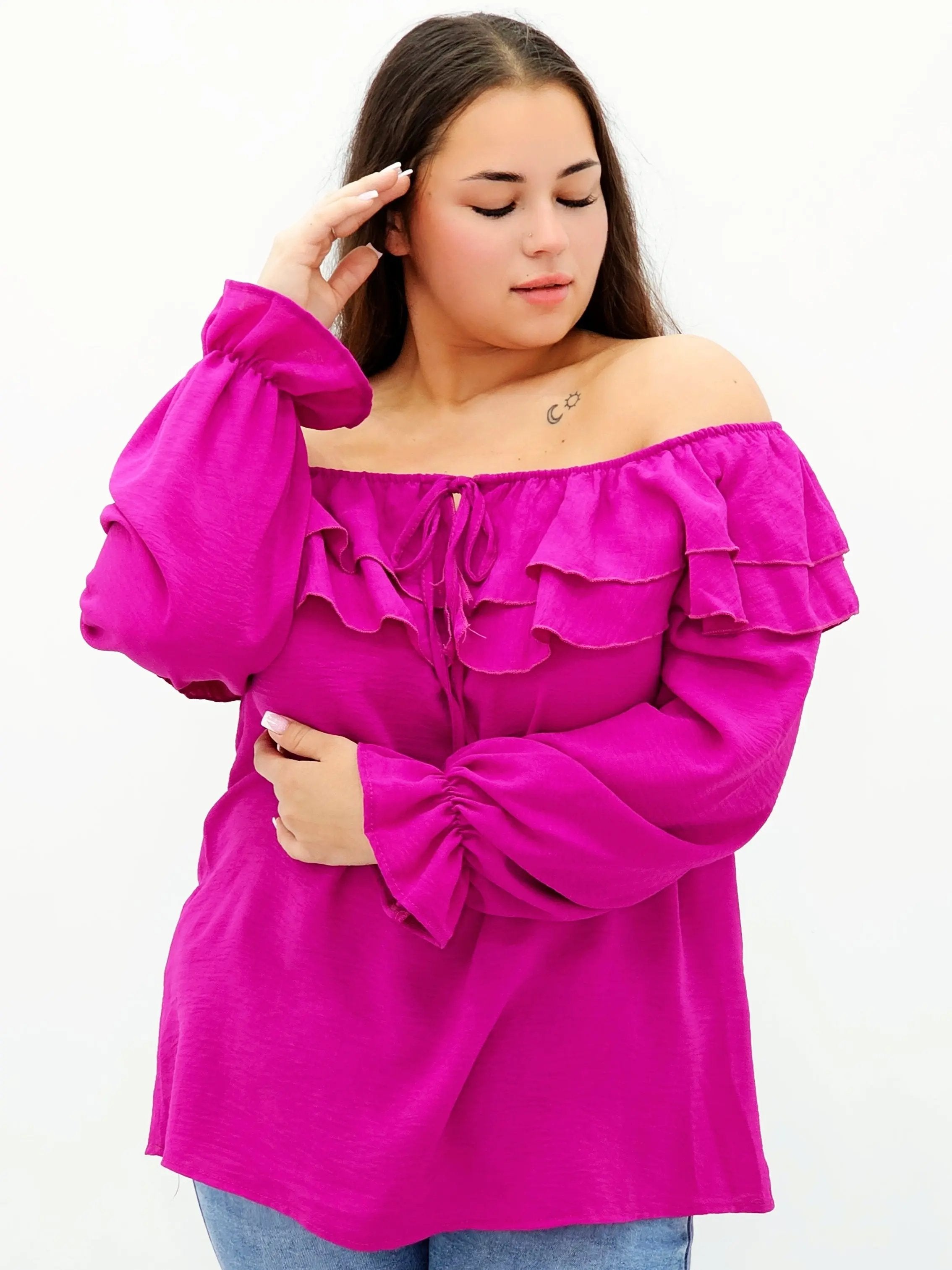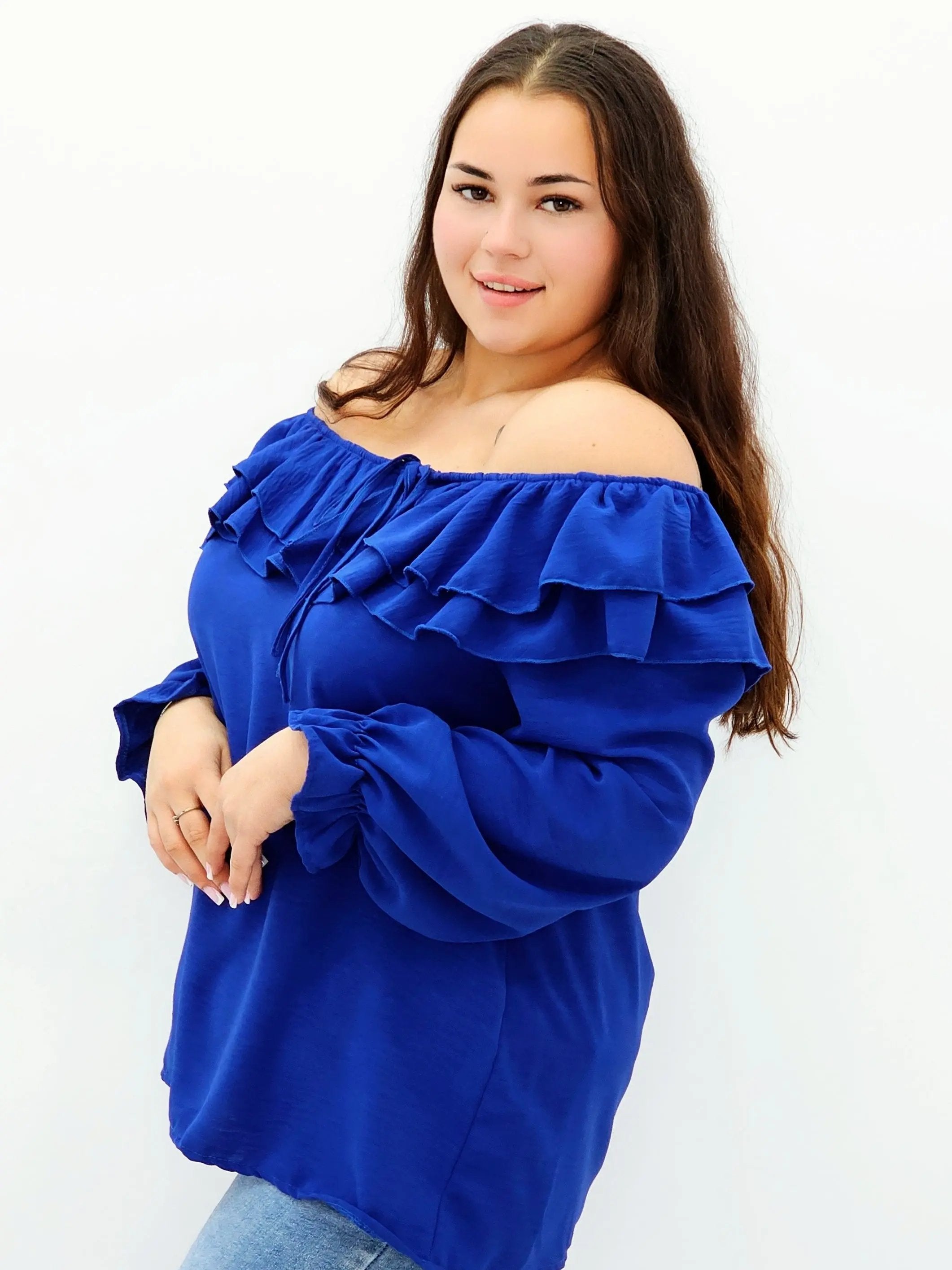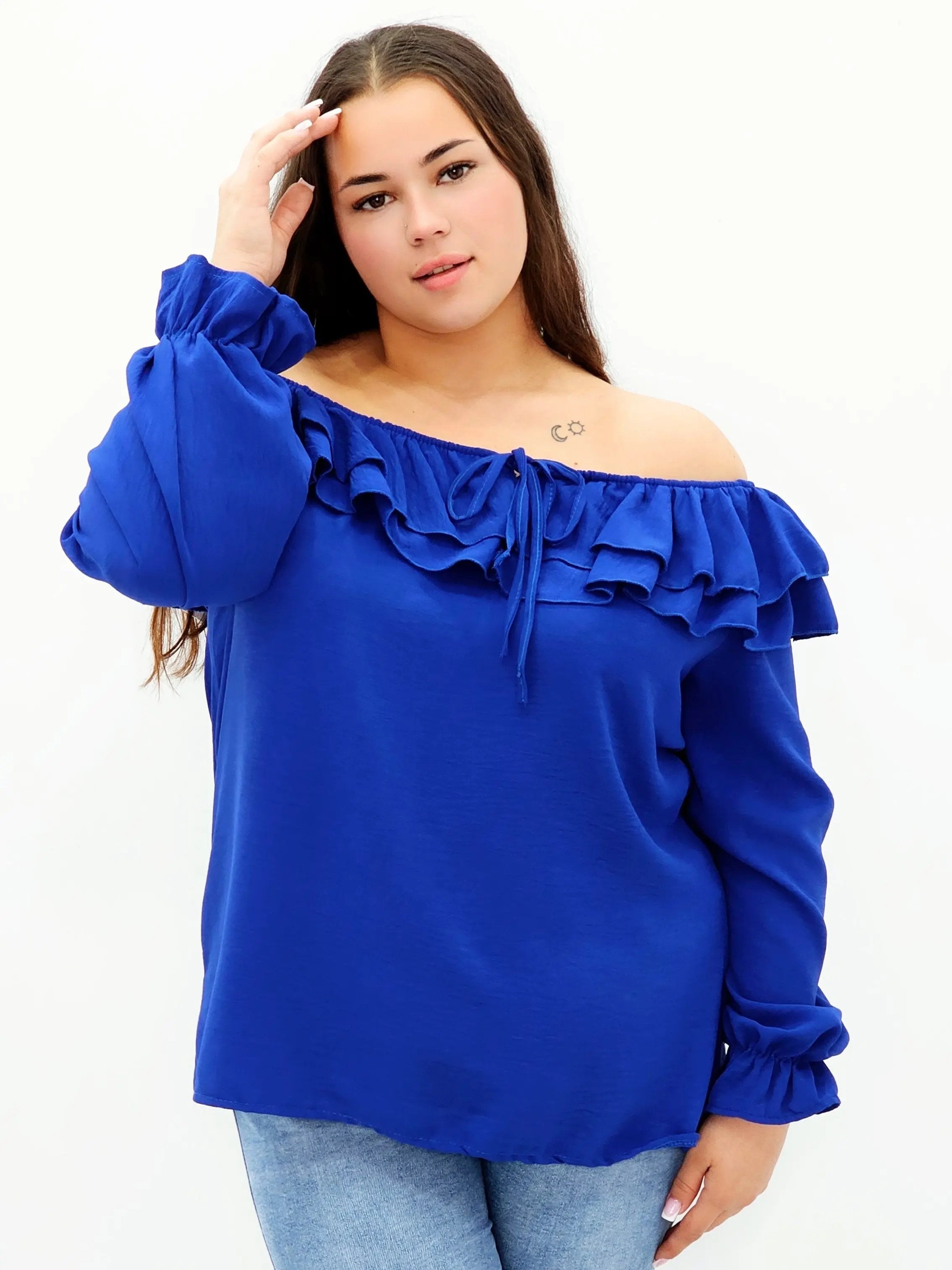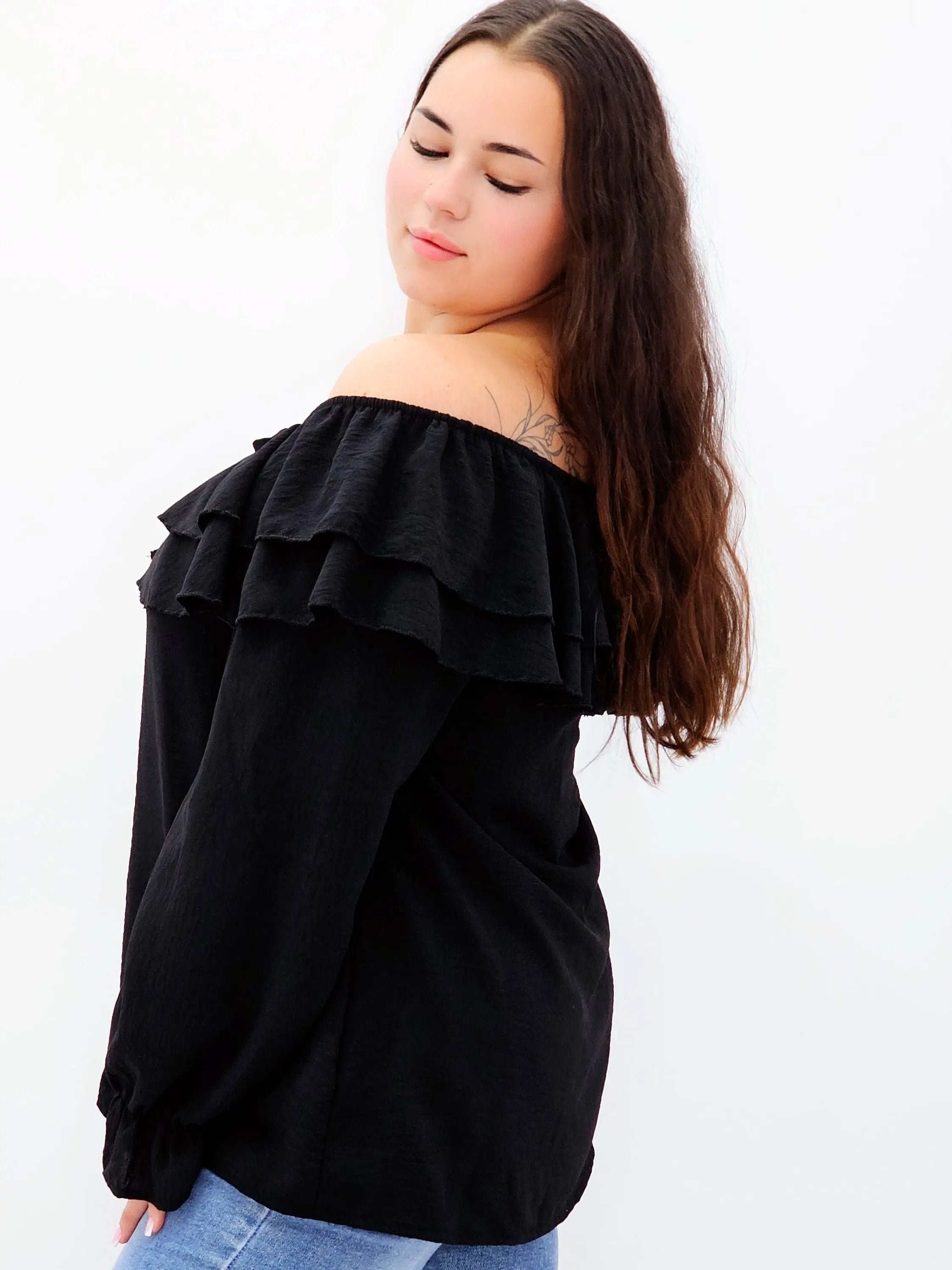 Stylowa bluzka z falbanami i odkrytymi ramionami