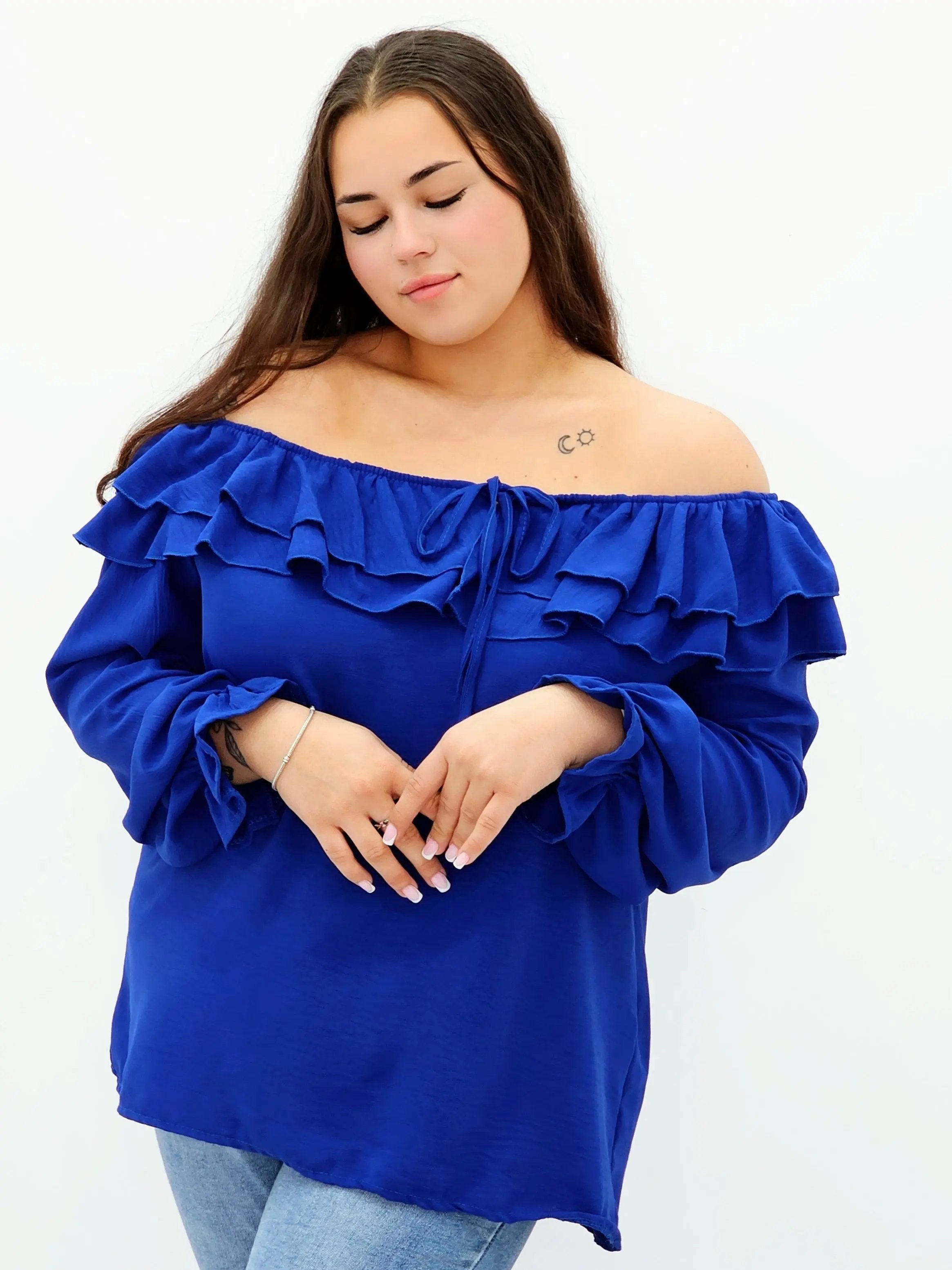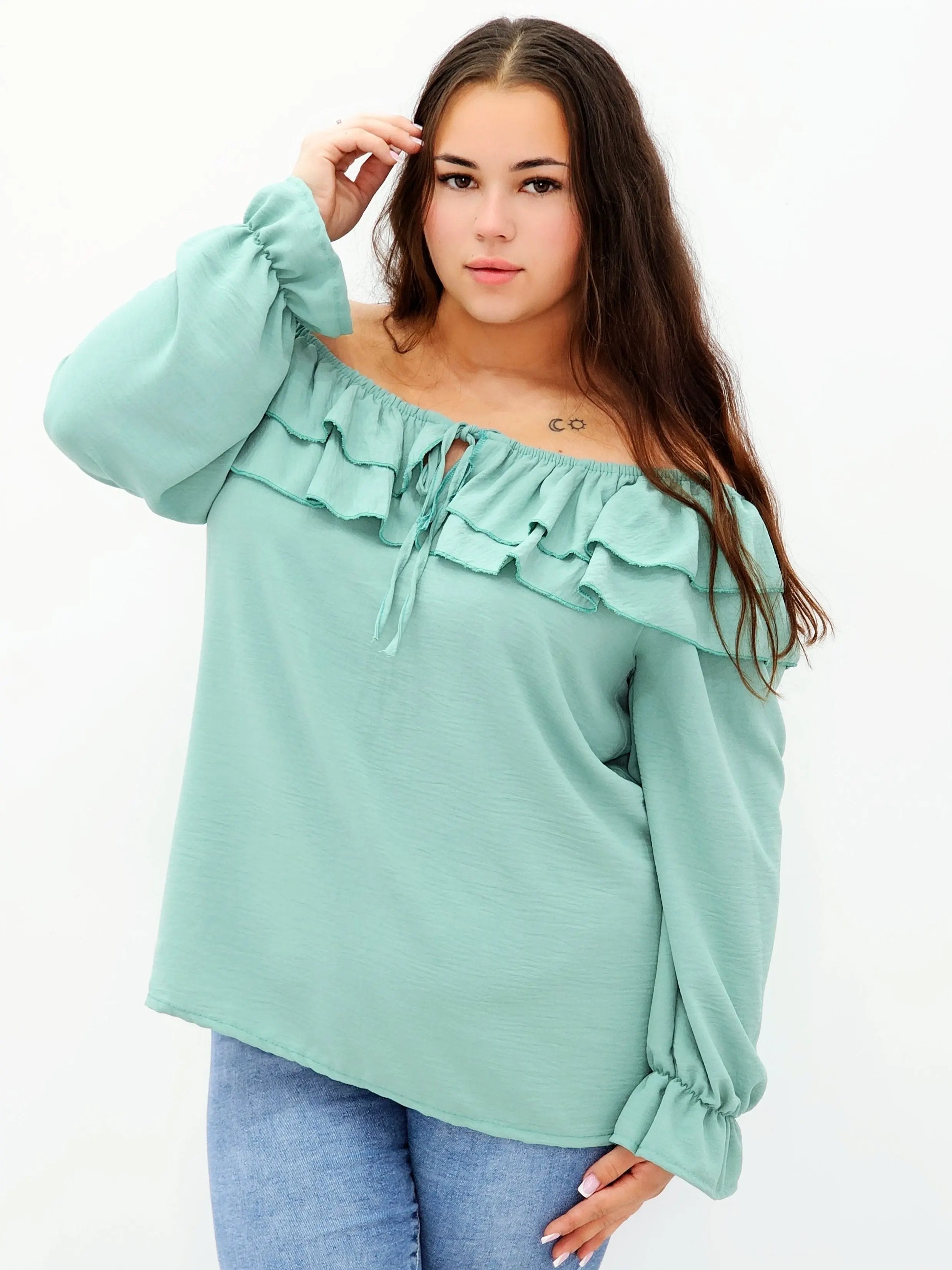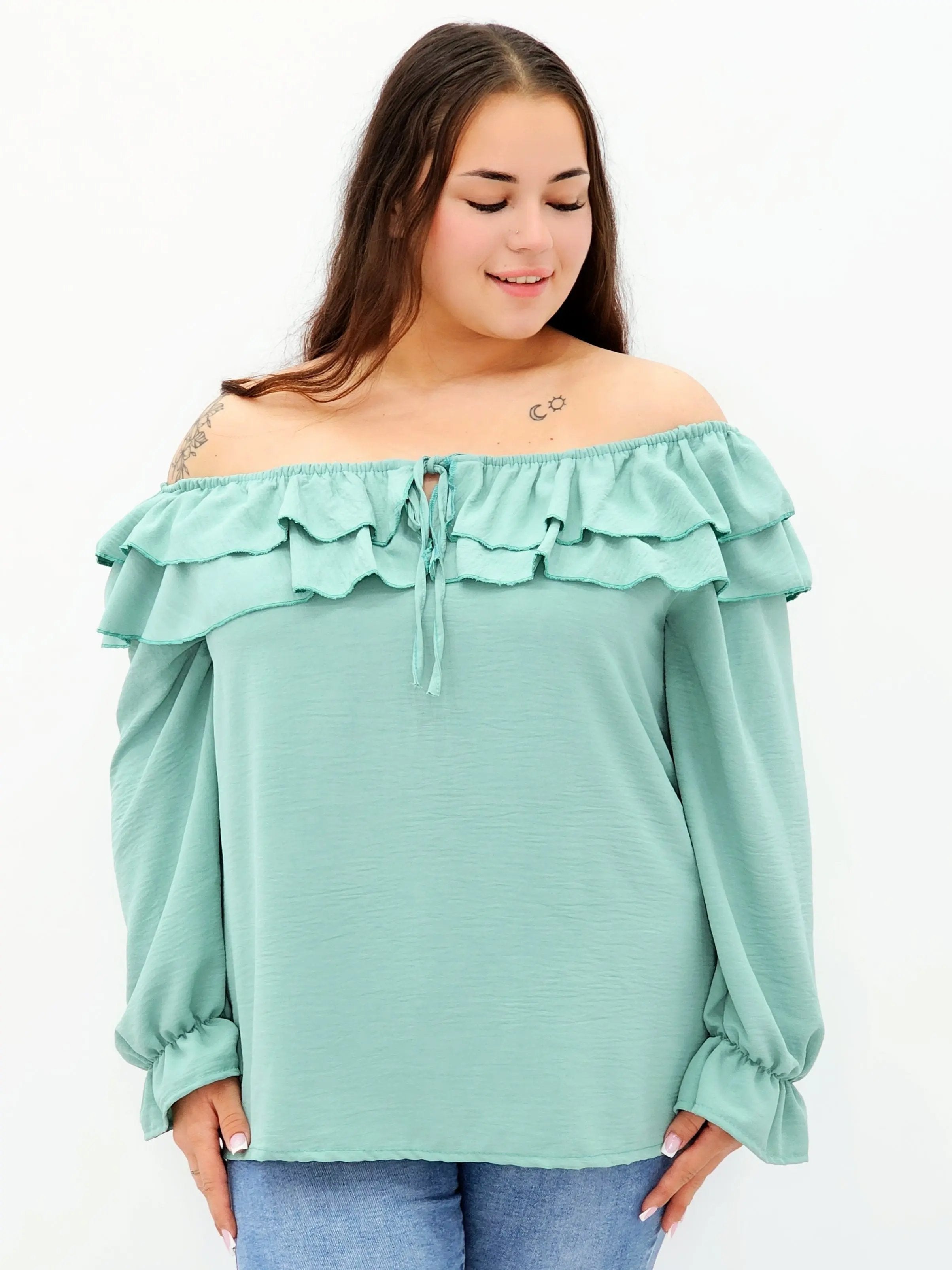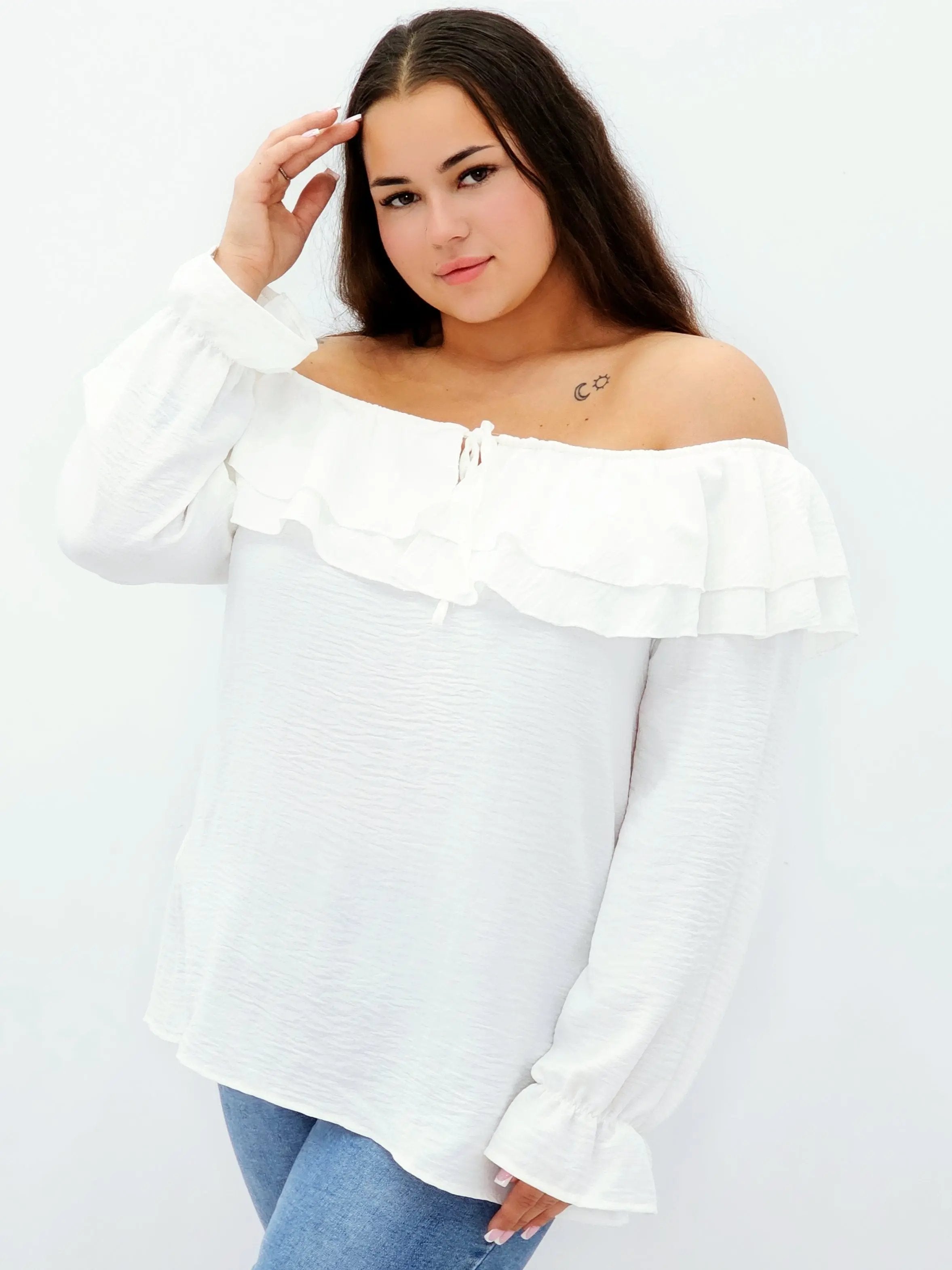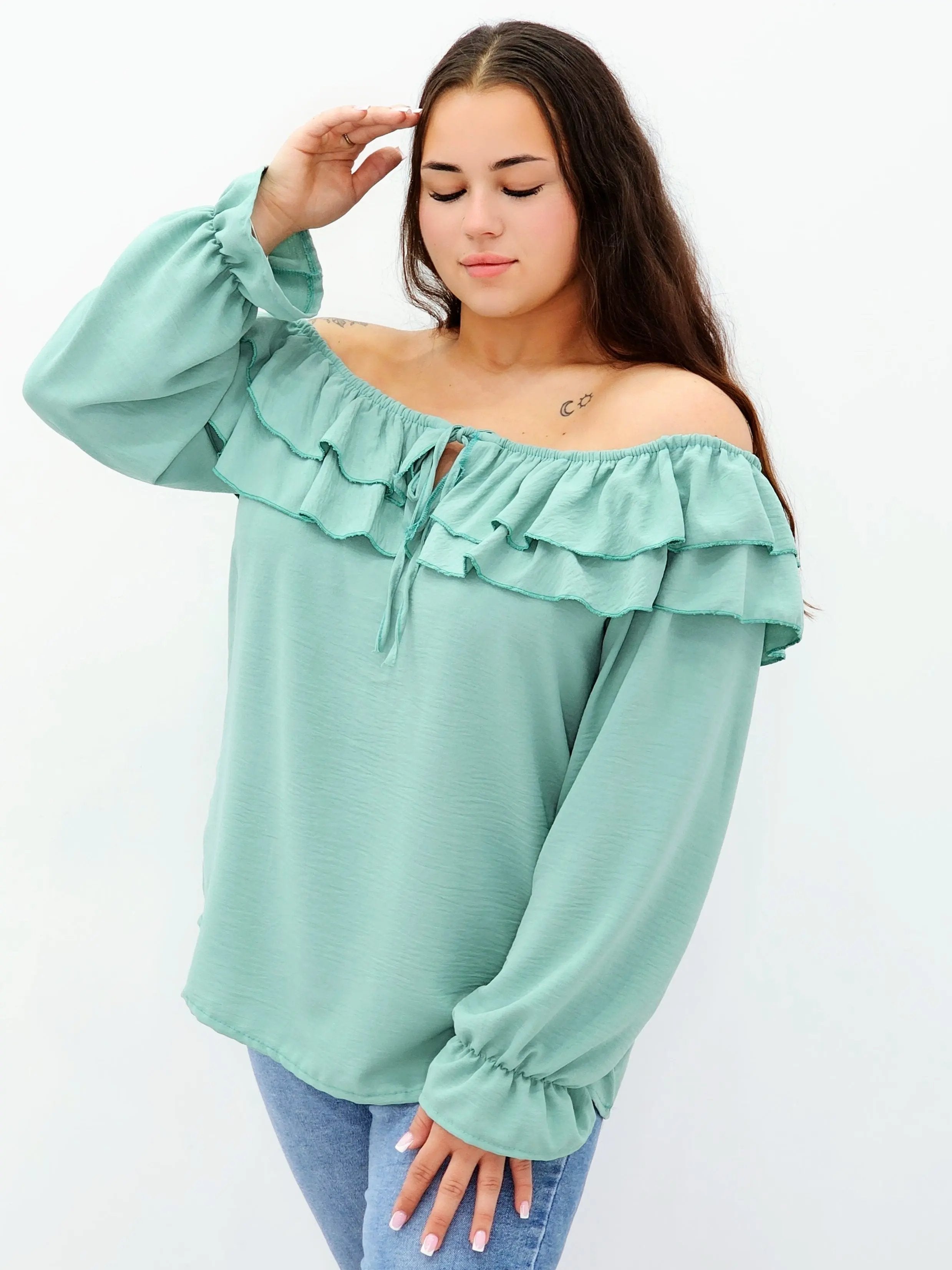 Stylowa bluzka z falbanami i odkrytymi ramionami