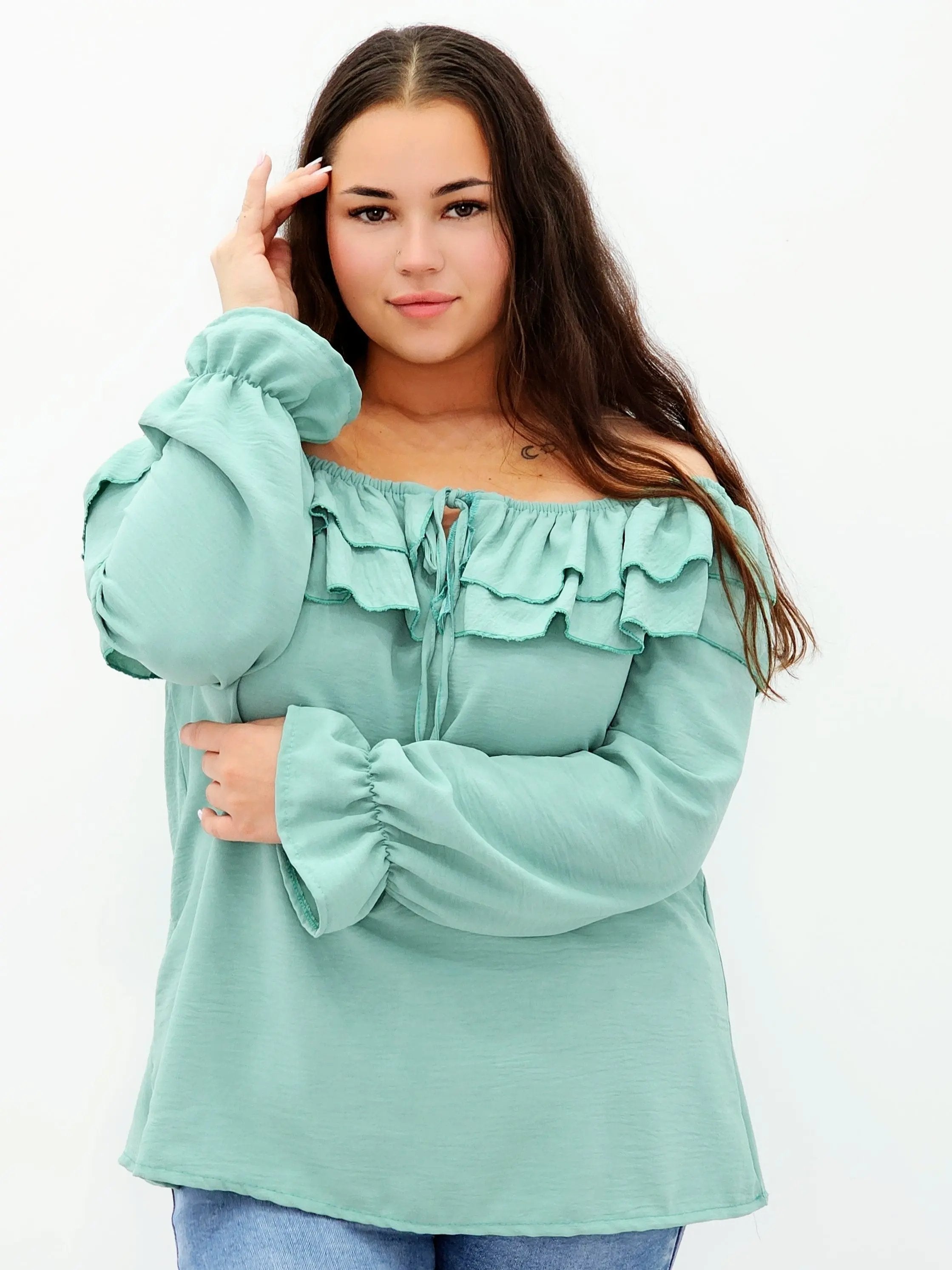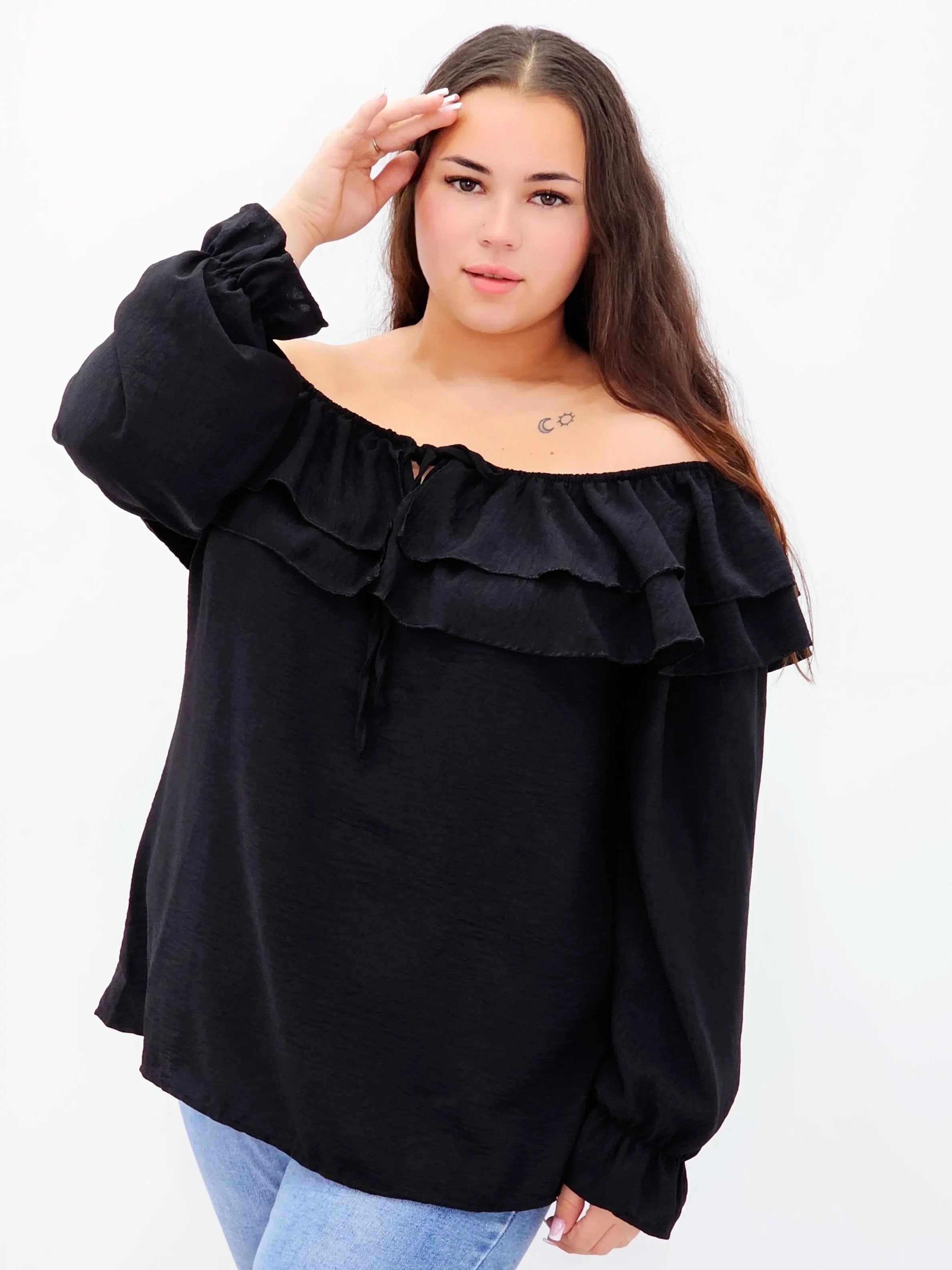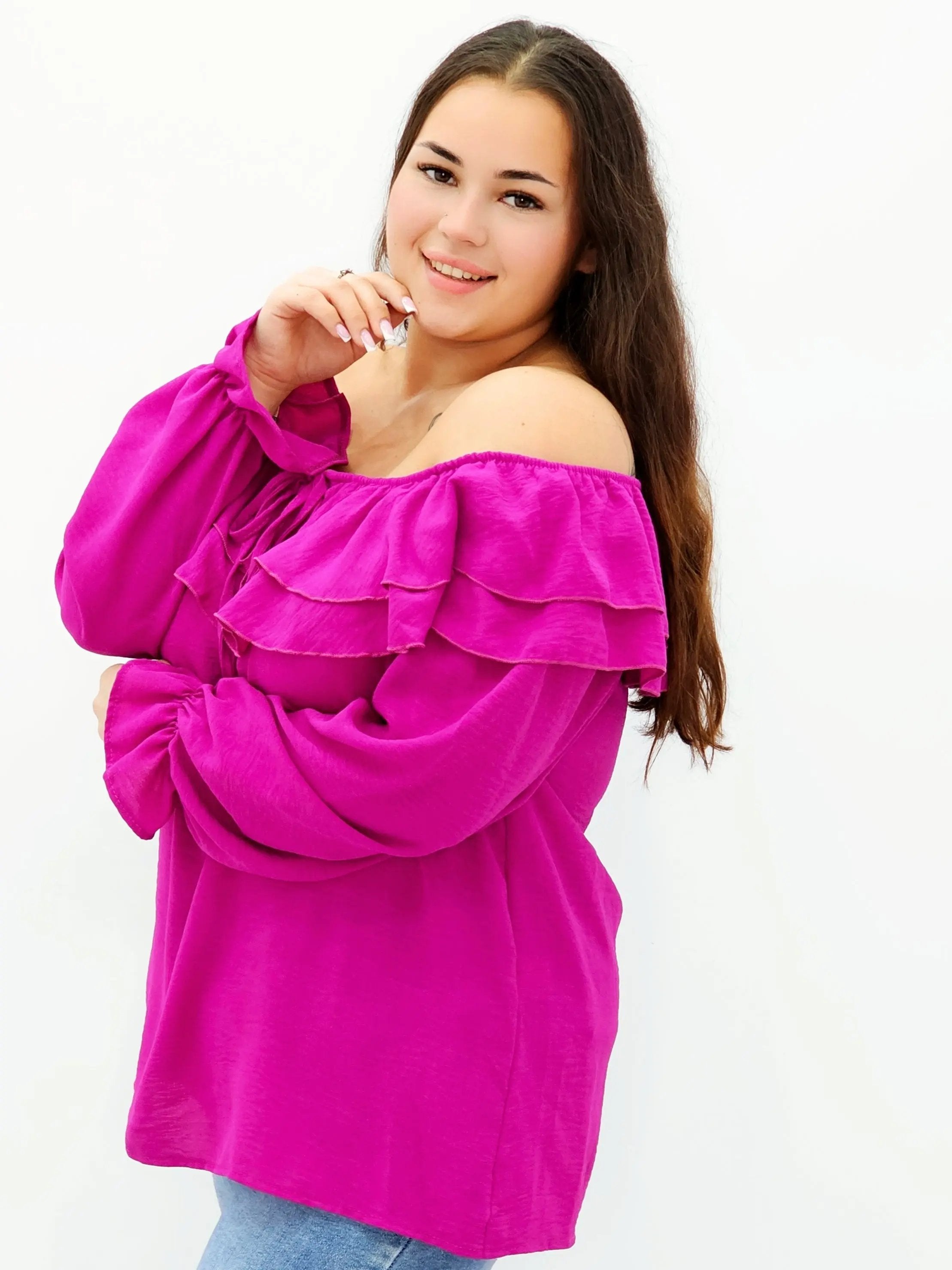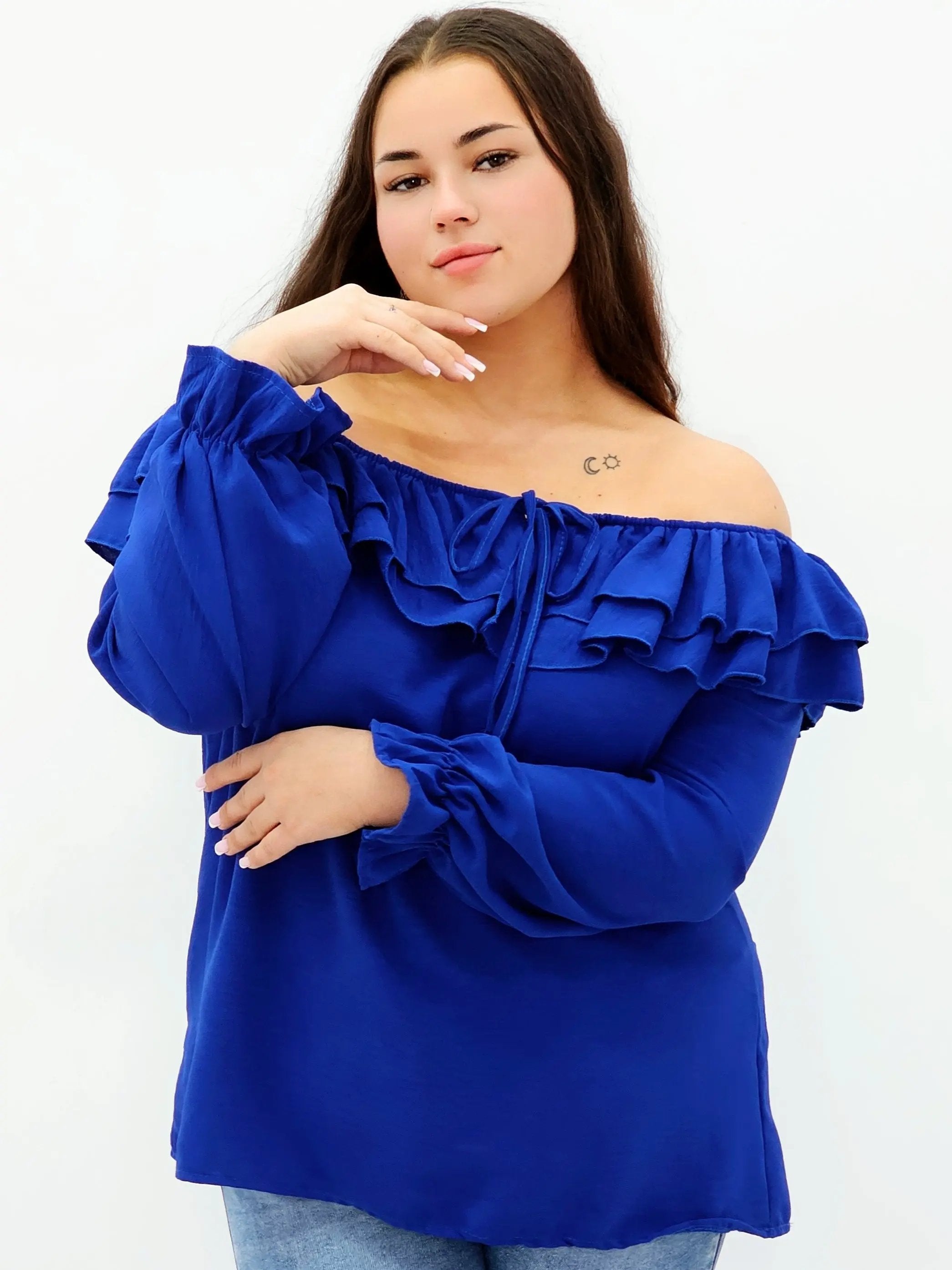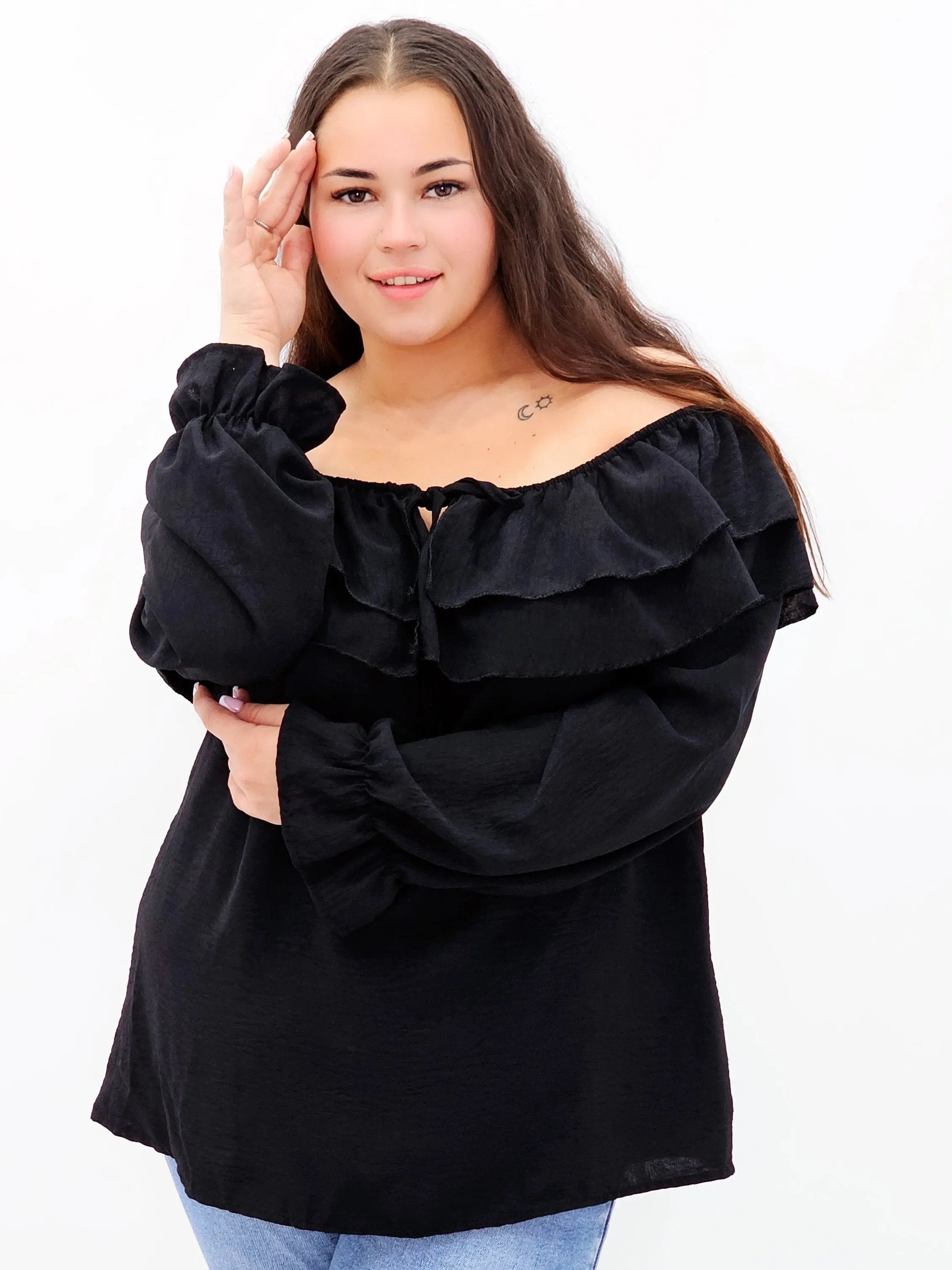 Stylowa bluzka z falbanami i odkrytymi ramionami