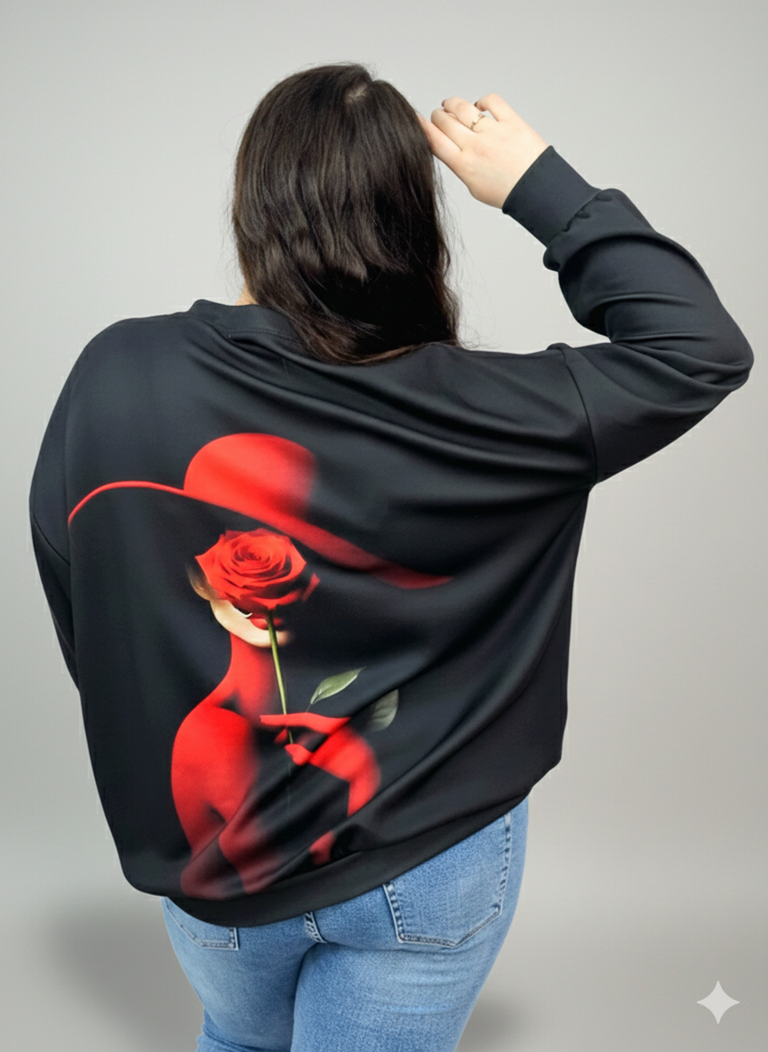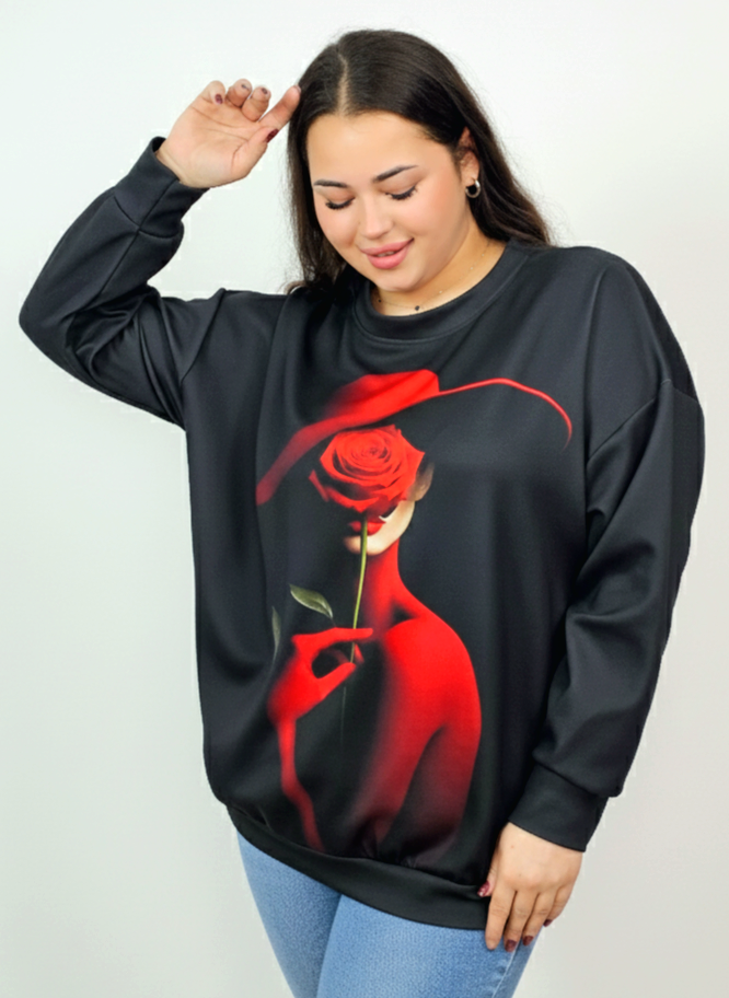 Bluza plus size wyróżnia się spektakularnym nadrukiem przedstawiającym kobiecą sylwetkę w czerwonym kapeluszu z różą zasłaniającą twarz. Kontrast czerwieni z czarnym tłem nadaje bluzie eleganckiego, zmysłowego charakteru i sprawia, że model przyciąga uwagę zarówno z przodu, jak i z tyłu. Masełkowa tkanina jest elastyczna, miękka i komfortowa w noszeniu przez cały dzień.