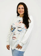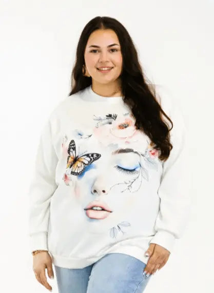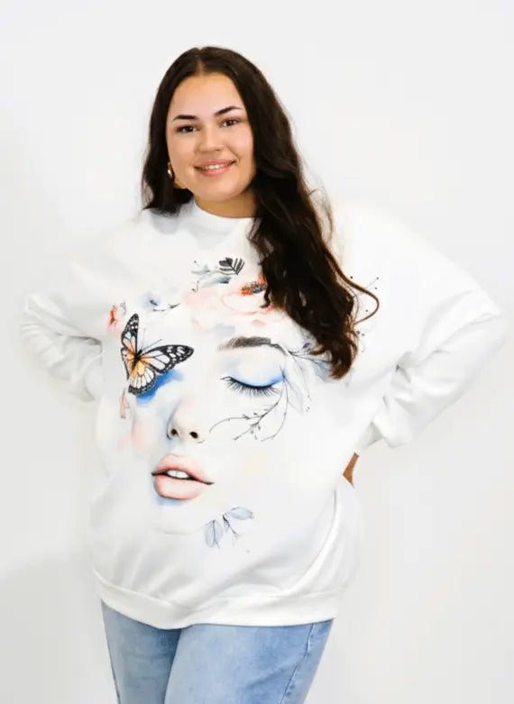 Bluza plus size o miękkim, „masełkowym” wykończeniu to idealna propozycja dla kobiet, które cenią wygodę, ale nie rezygnują z efektownego wyglądu. Model wyróżnia się dużym, artystycznym nadrukiem twarzy z motywami kwiatów i motyla, który przyciąga wzrok i nadaje stylizacji wyjątkowego charakteru. Ta bluza plus size świetnie sprawdzi się w codziennych zestawach XXL.