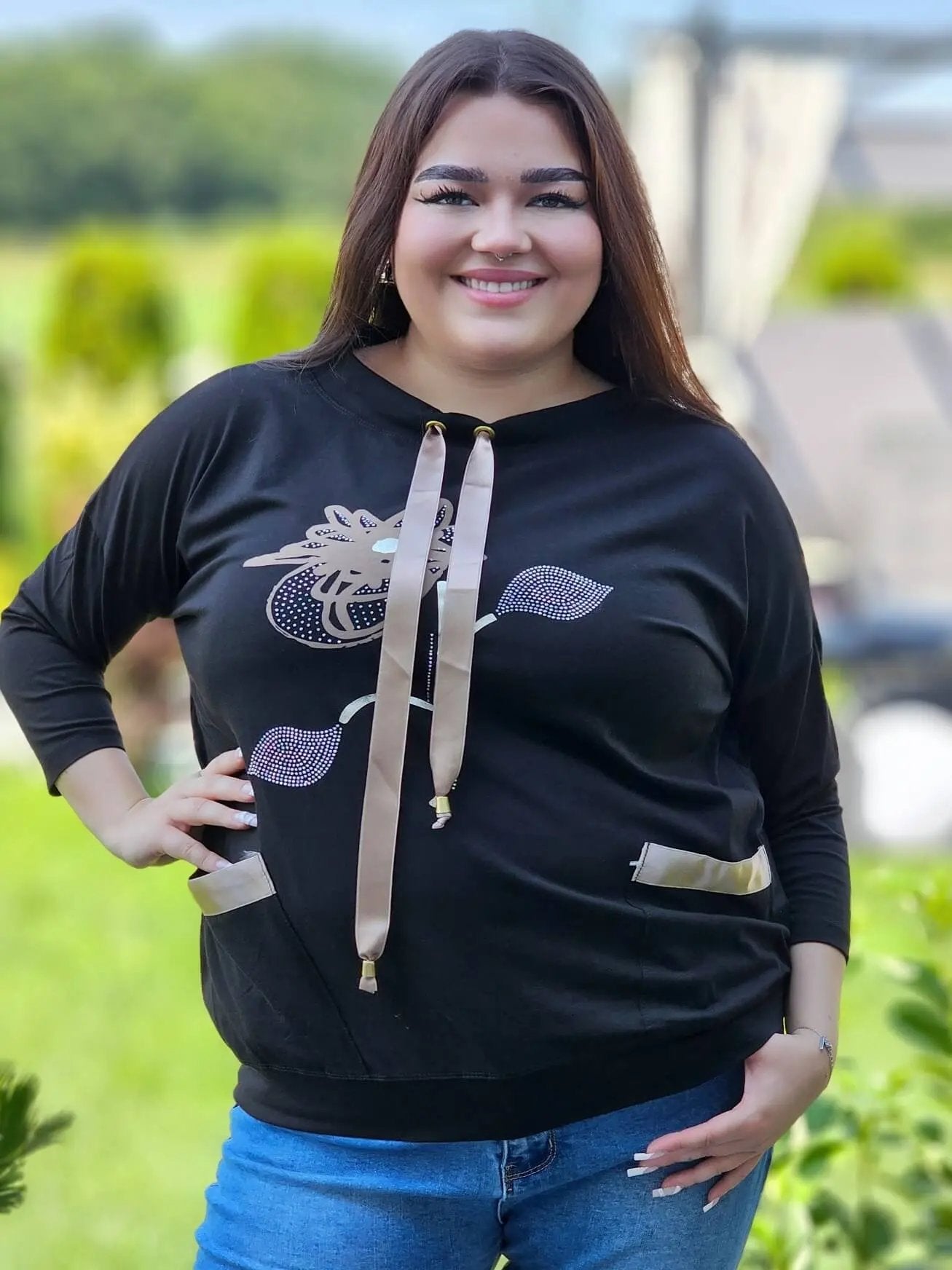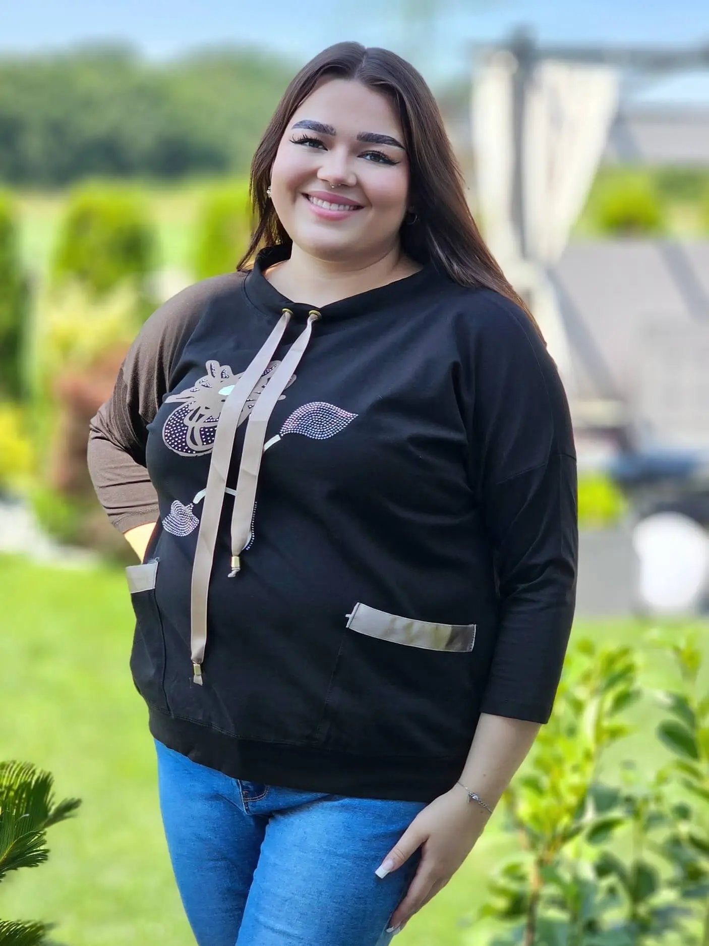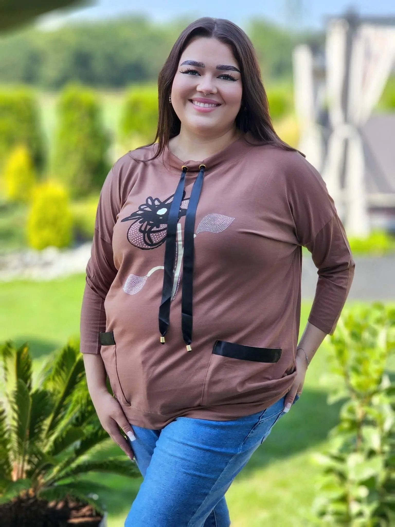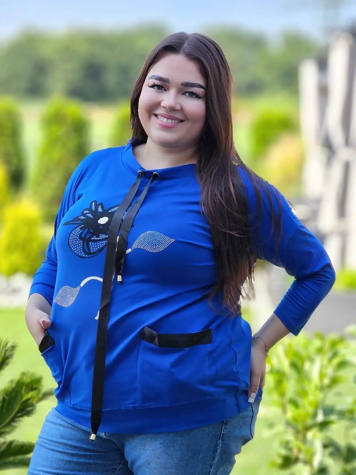 Jeśli lubisz połączenie wygody i kobiecych detali, ta bluza jest dla Ciebie! Ozdobny nadruk z kwiatem, subtelny połysk dżetów i satynowe wykończenia przy kieszeniach oraz dekolcie sprawiają, że każda stylizacja nabiera wyjątkowego charakteru.