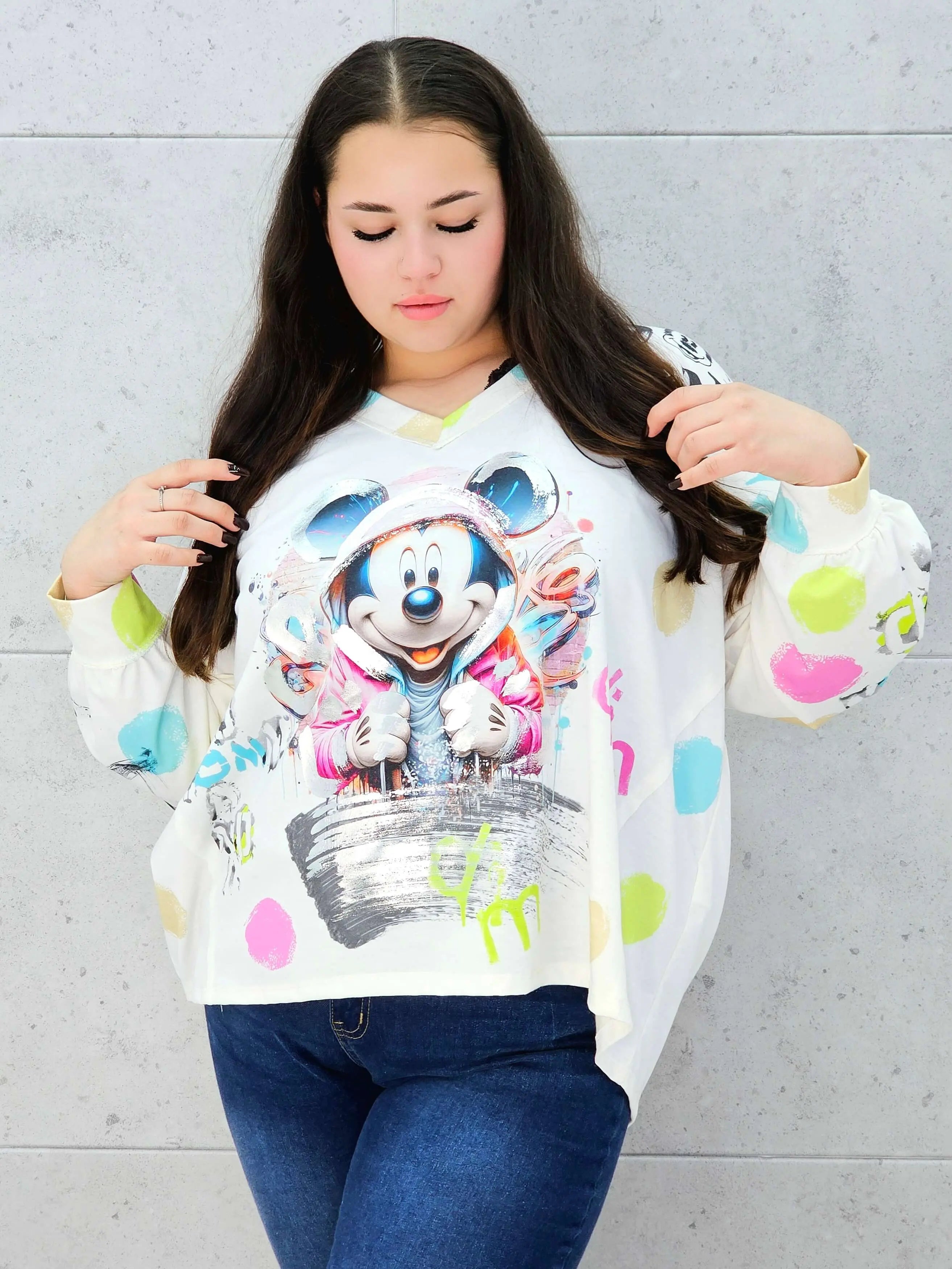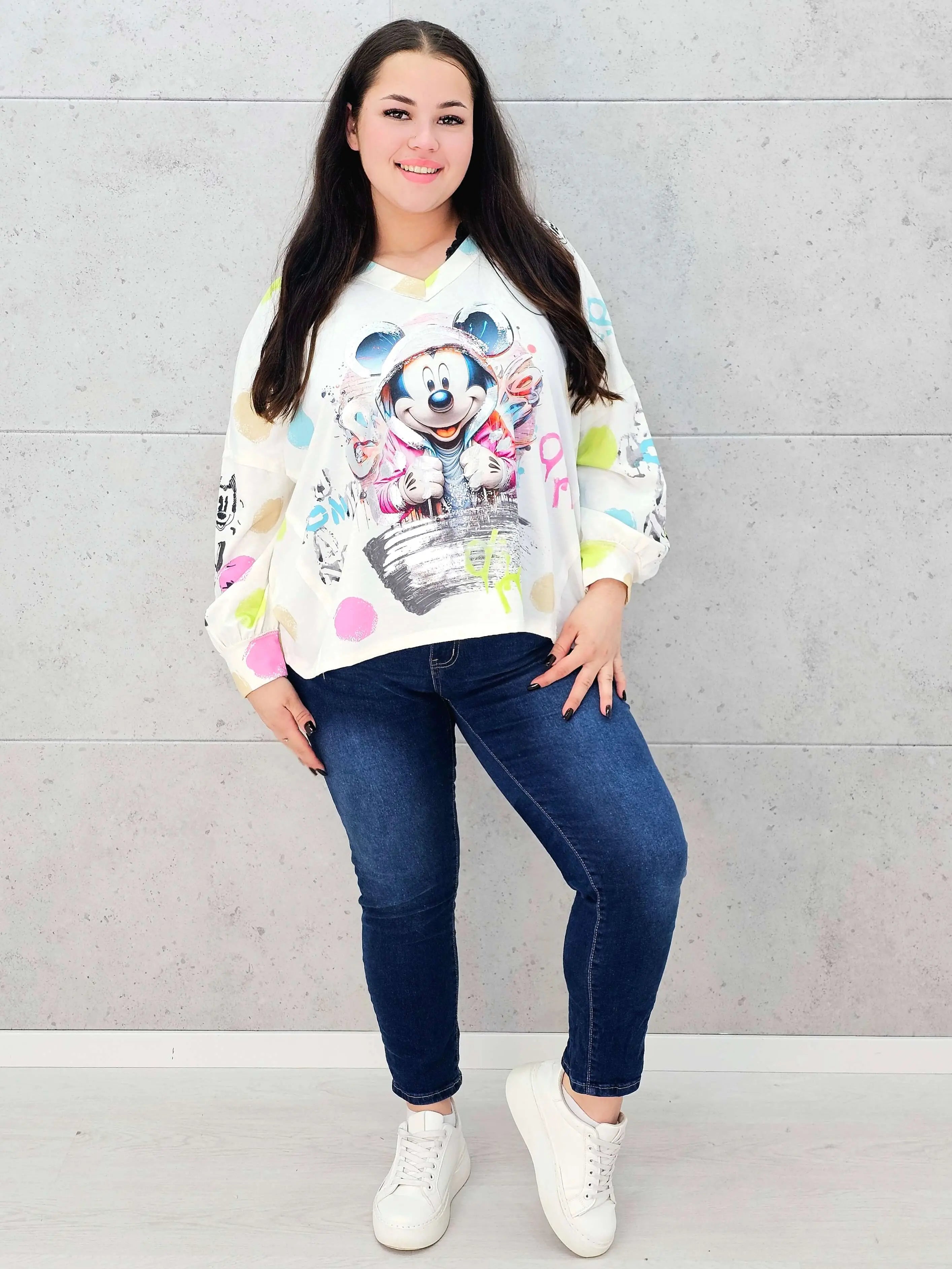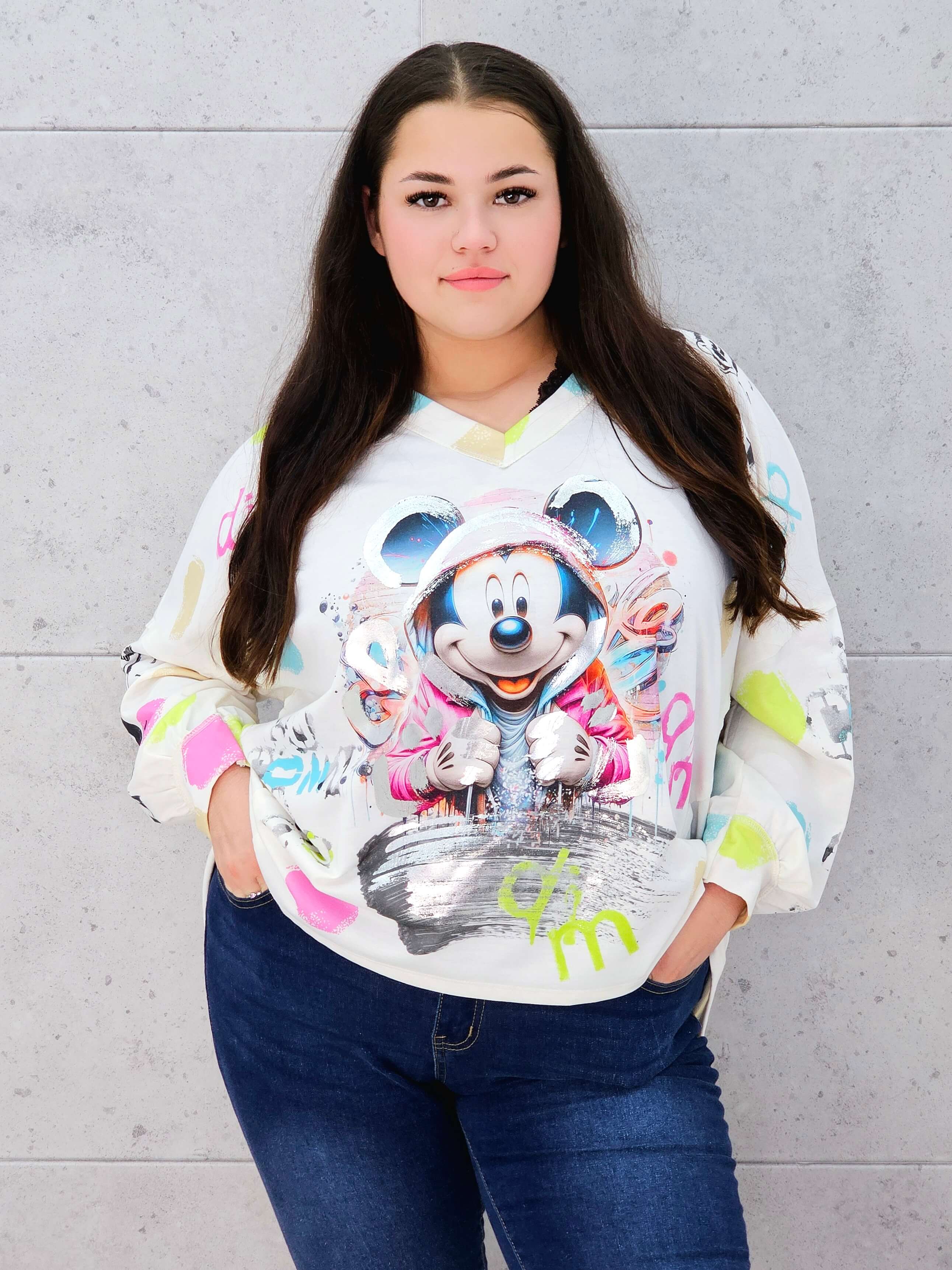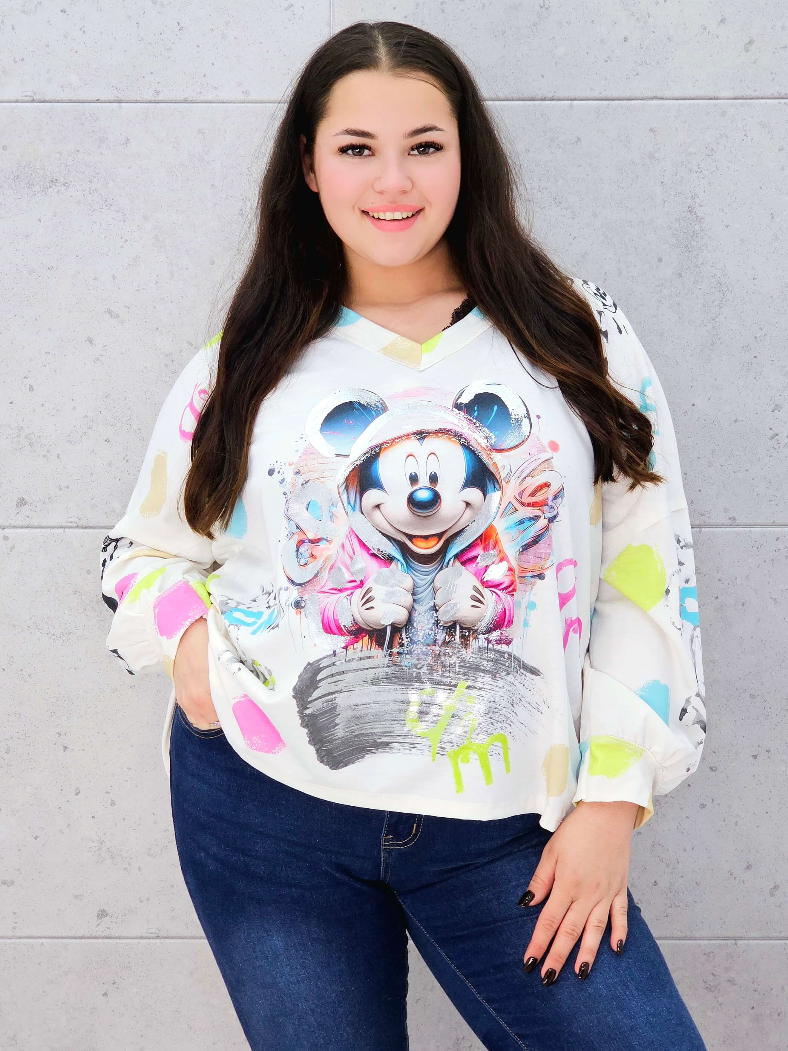 Damska bluzka oversize z nadrukiem- miki w kapturze