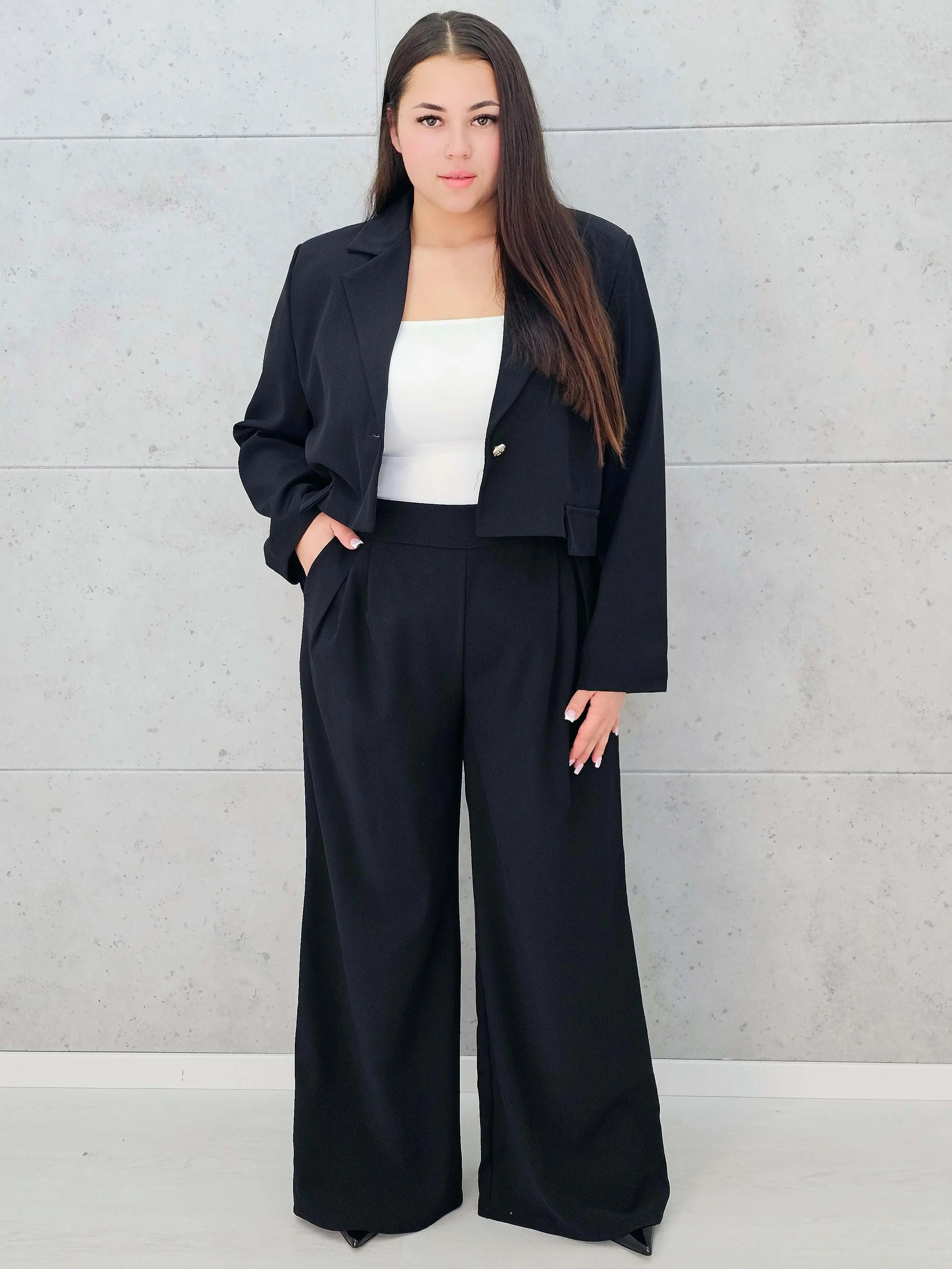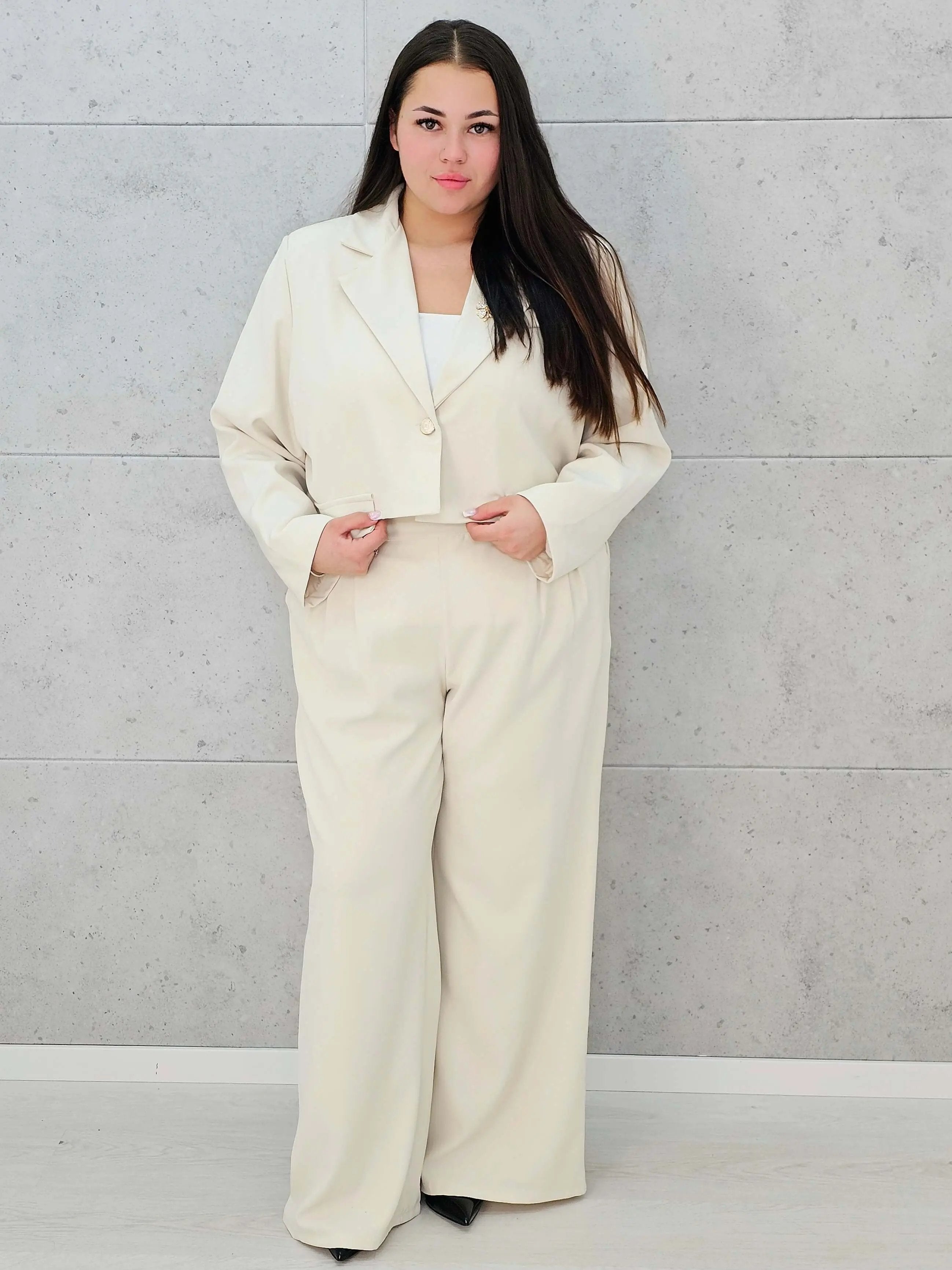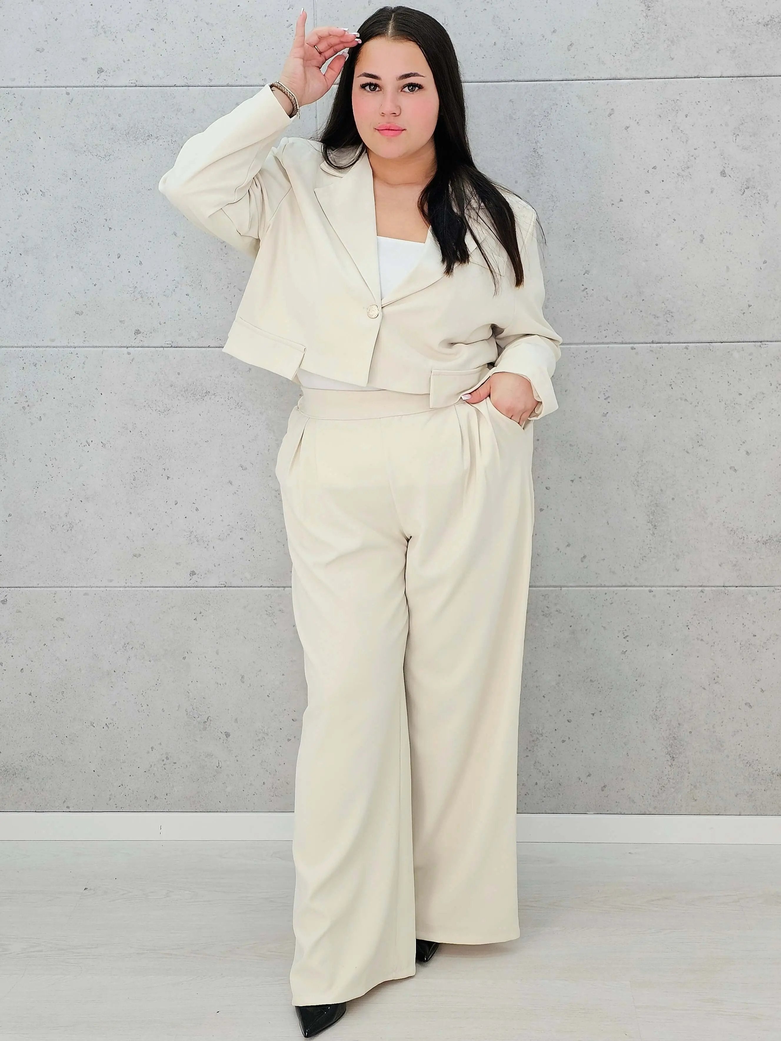 Spodnie: Luźny, prosty krój z delikatnym plisowaniem z przodu, które optycznie wydłuża sylwetkę i zapewnia lekkość ruchów. Elastyczny pas z tyłu gwarantuje wygodę i idealne dopasowanie do każdej sylwetki. Spodnie są lekko lejące, dzięki czemu pięknie układają się podczas chodzenia.