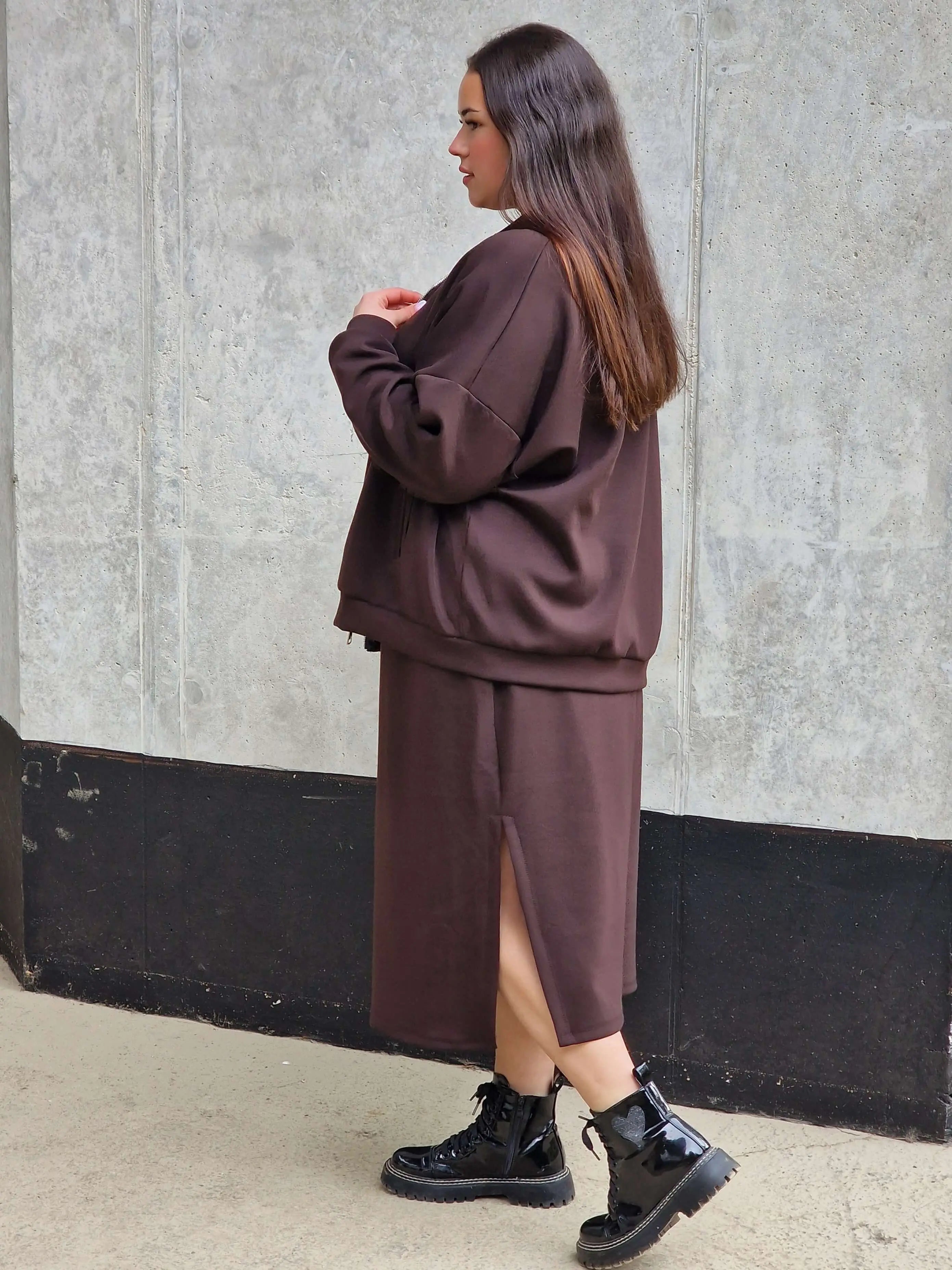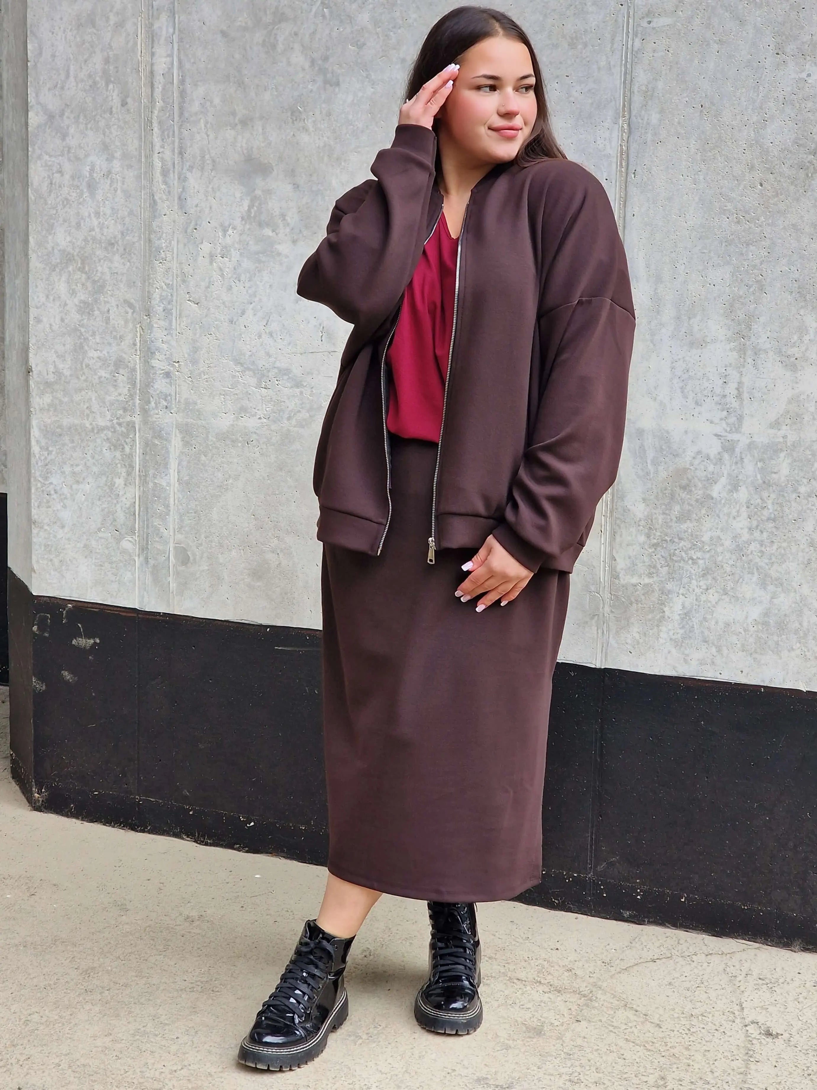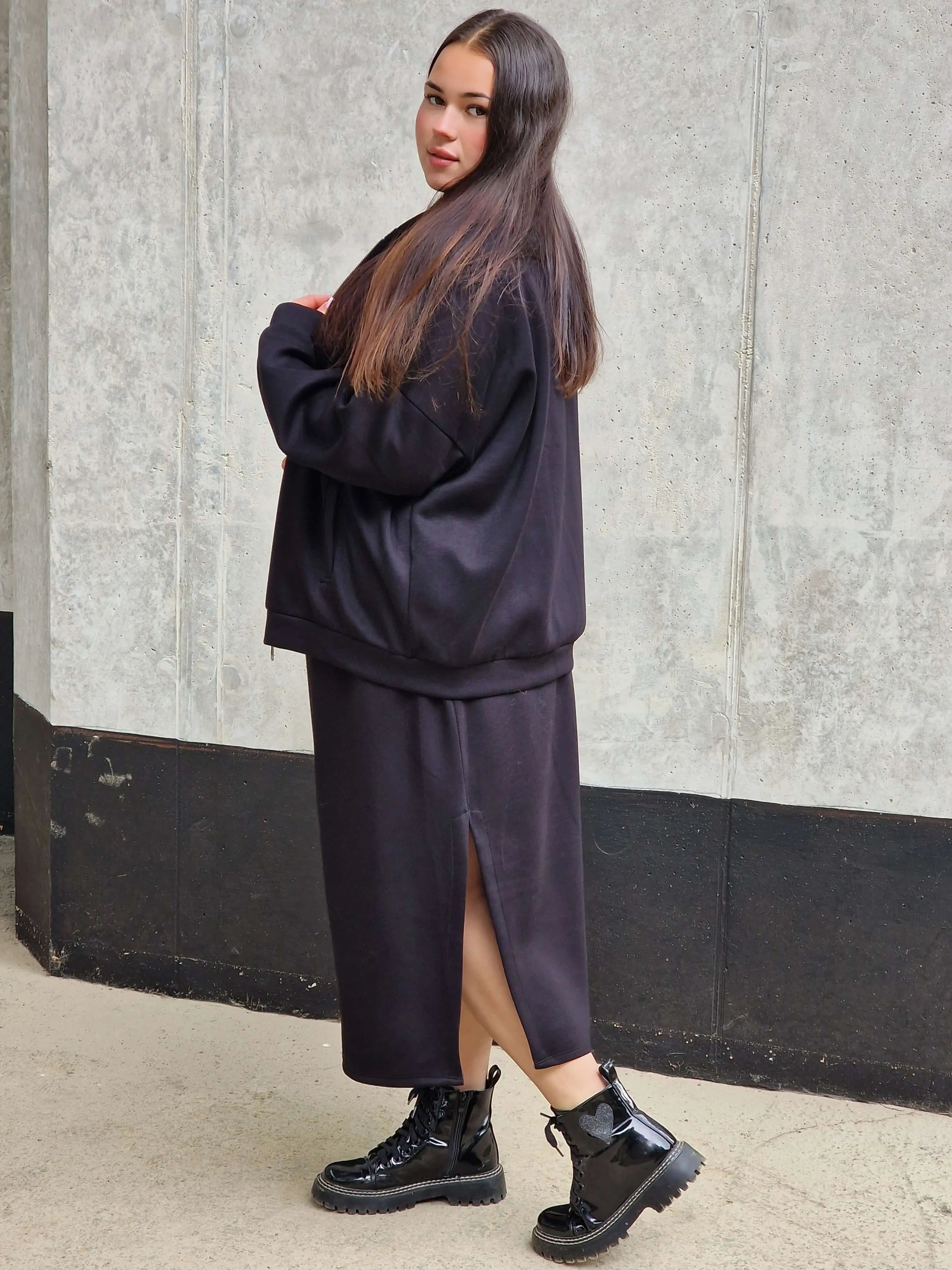 Ten komplet plus size to idealne rozwiązanie na co dzień, na spacer, spotkanie z przyjaciółkami lub wieczorne wyjście.  Można go nosić razem jako spójną stylizację lub osobno – łącząc bluzę z jeansami, a spódnicę z koszulą lub T-shirtem. Minimalistyczny, nowoczesny design sprawia, że ten zestaw pasuje zarówno do sportowych, jak i eleganckich stylizacji.