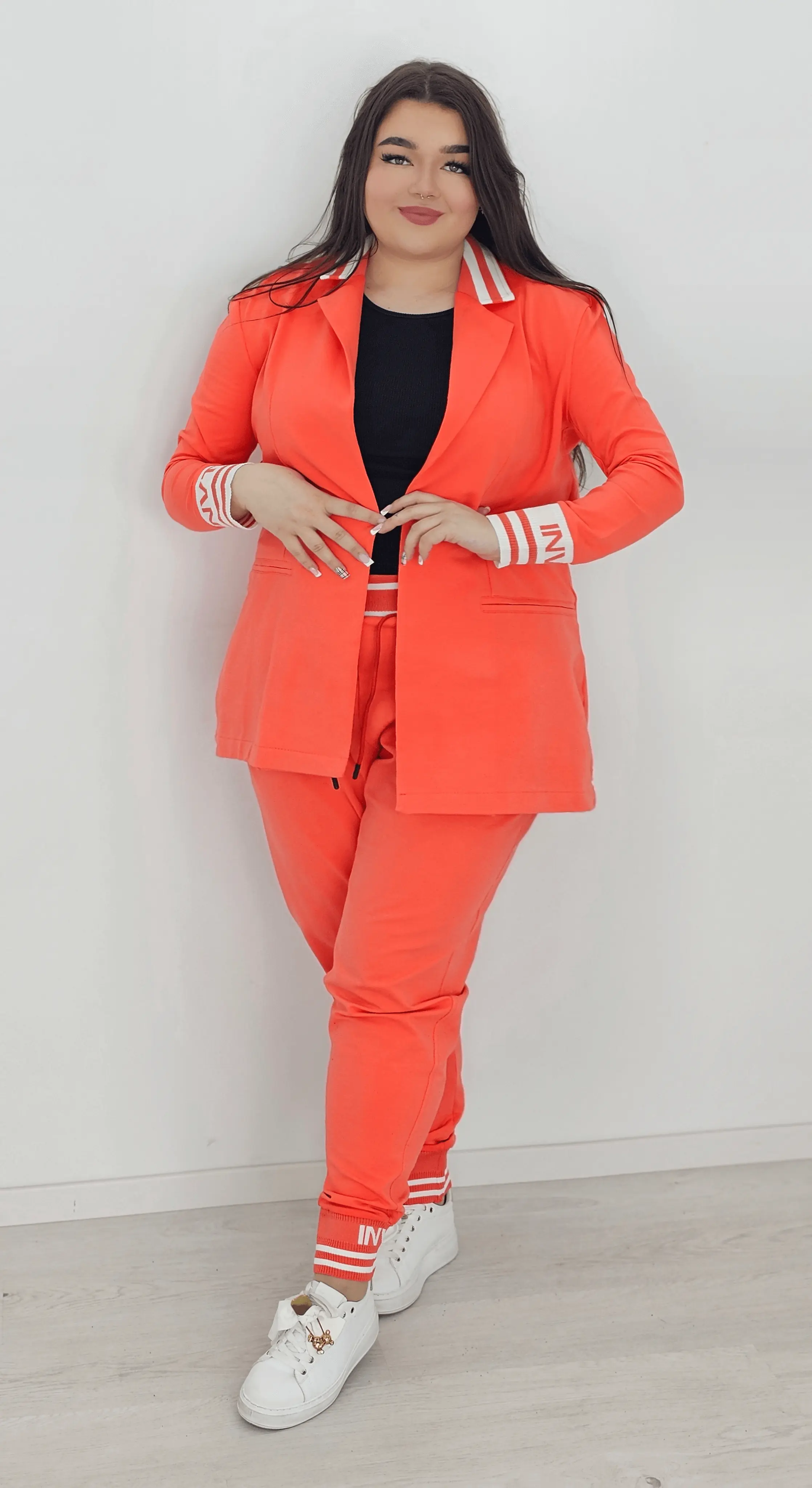 Ten zestaw to idealna propozycja dla kobiet, które cenią komfort i nowoczesny look. Intensywny, koralowy kolor przyciąga uwagę i dodaje energii, a sportowe detale sprawiają, że całość wygląda trendy i na luzie. Możesz go nosić zarówno na co dzień, jak i na spotkania w sportowo-eleganckim klimacie