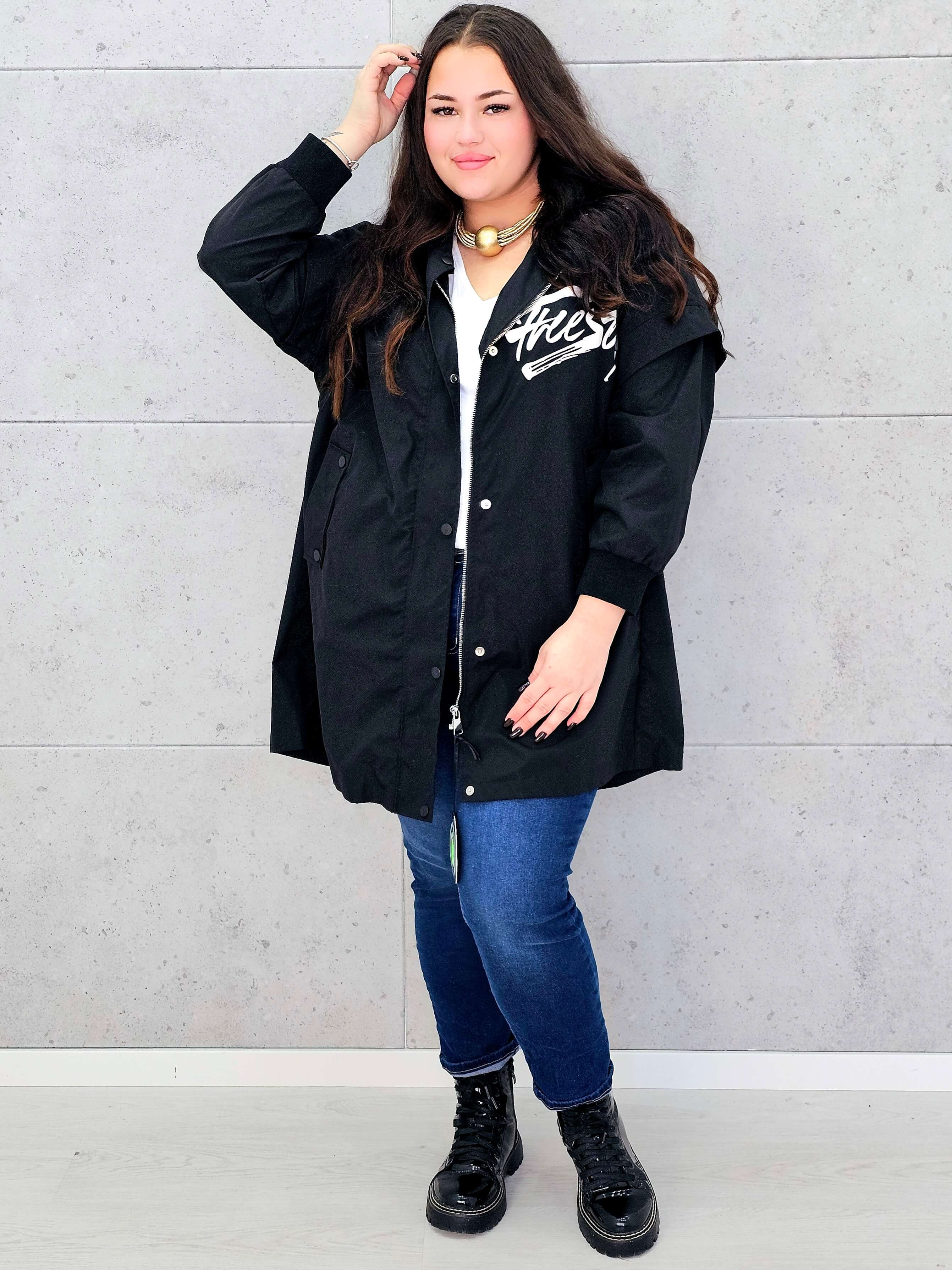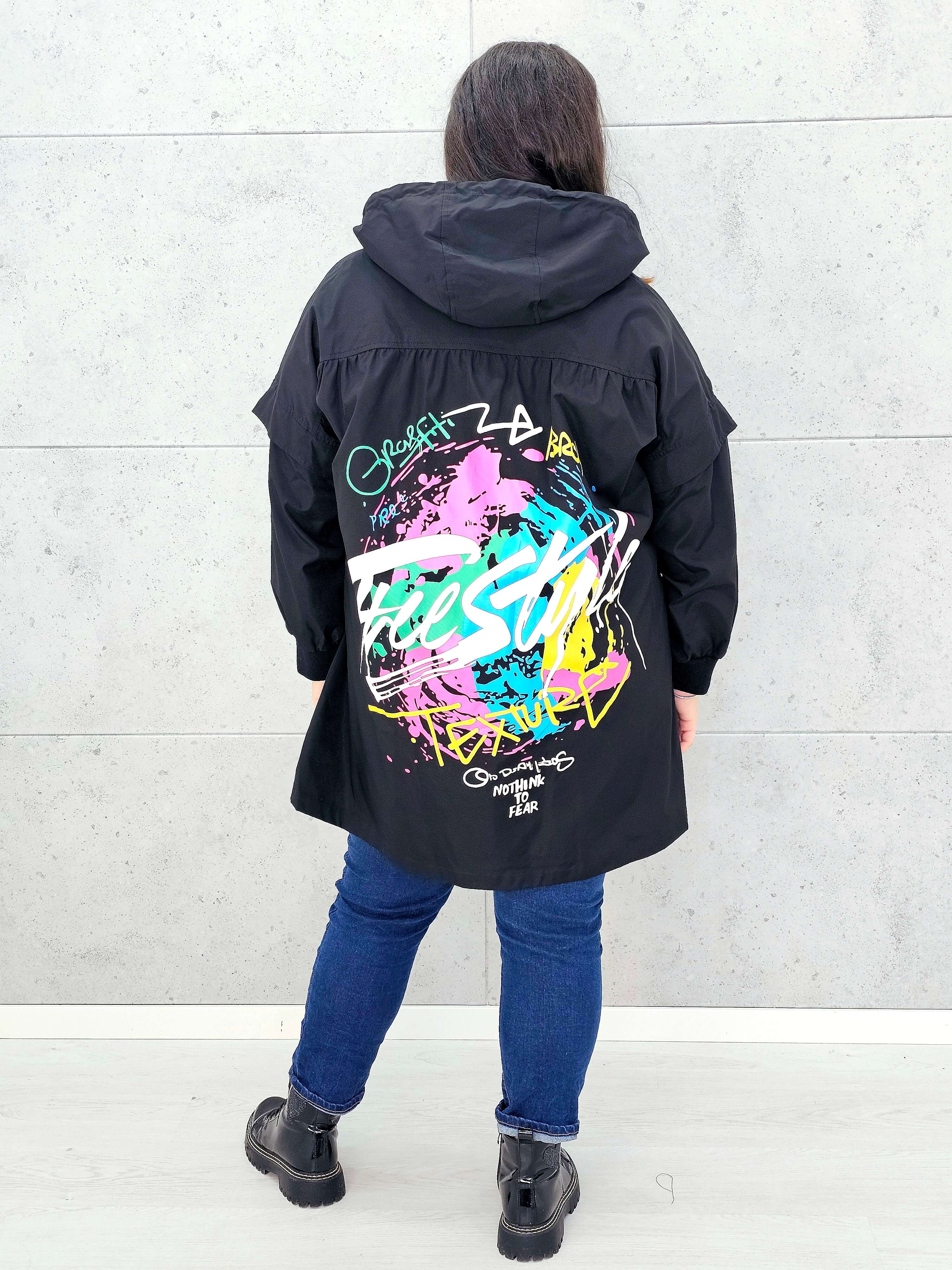 Gładki przód w połączeniu z efektownym, kolorowym nadrukiem na plecach tworzy nowoczesny, przyciągający wzrok look. To kurtka damska XXL, która łączy wygodę ze stylem – idealna do jeansów, legginsów czy sportowych butów. Kaptur chroni przed wiatrem, a praktyczne kieszenie dodają jej funkcjonalności, dzięki czemu doskonale sprawdzi się w sezonie przejściowym.