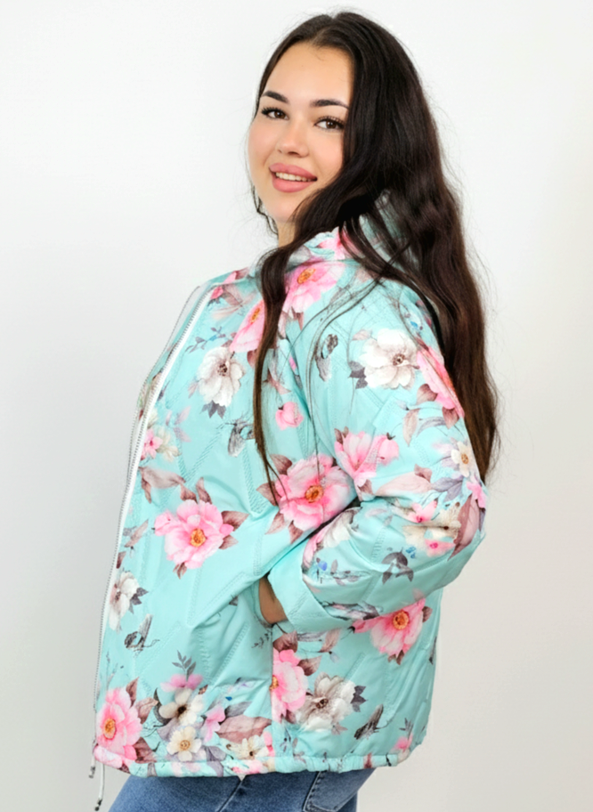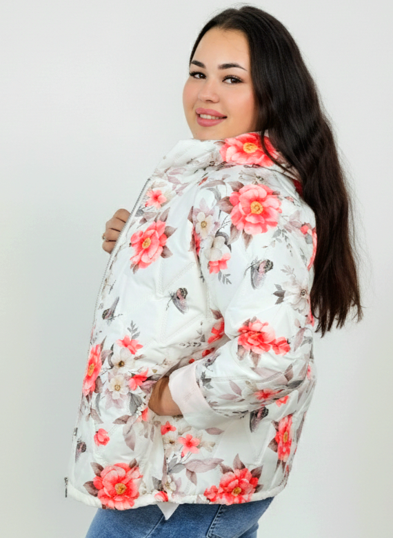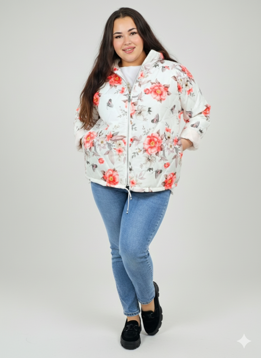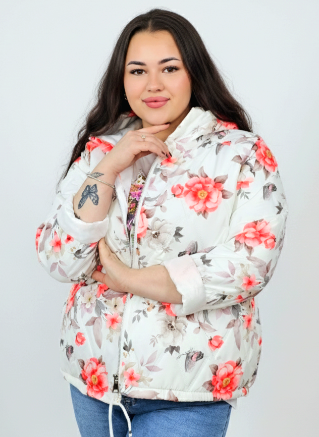 Kurtka plus size – krótka pikowana kurtka XXL na zamek z florystycznym nadrukiem