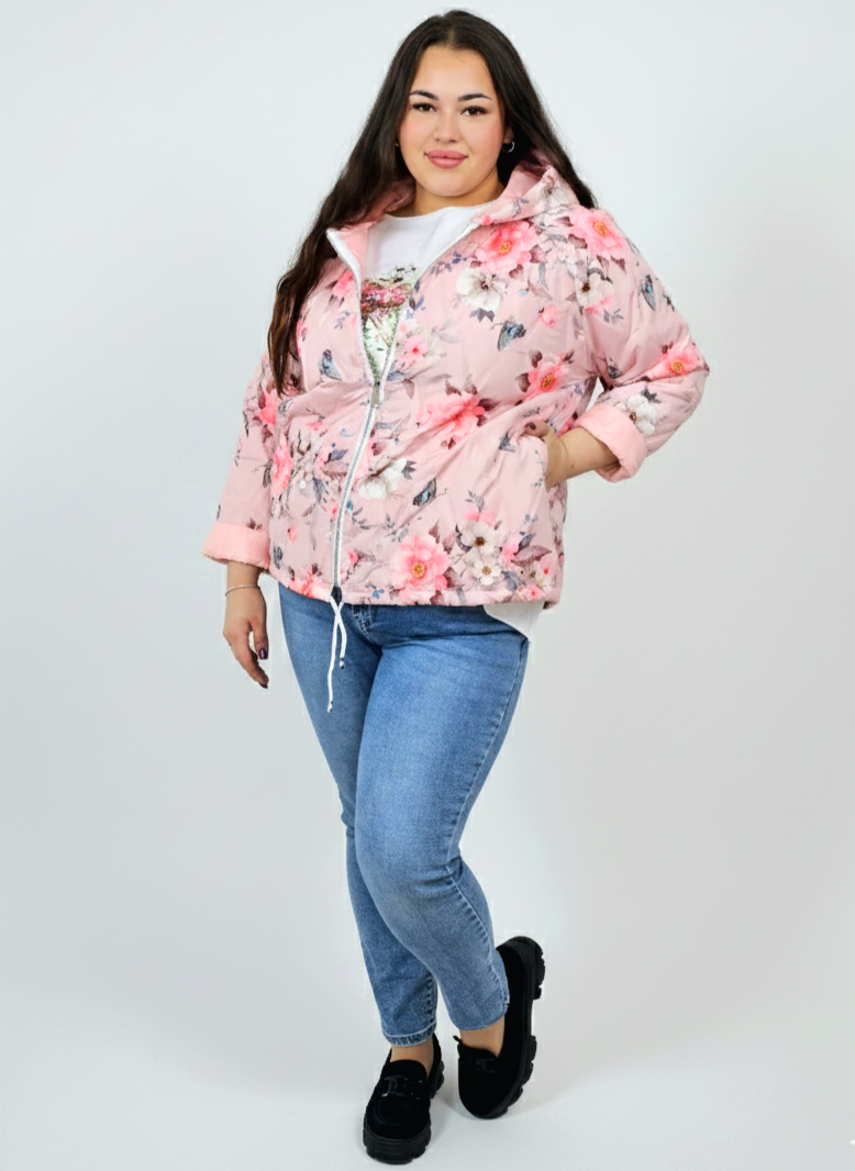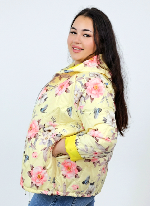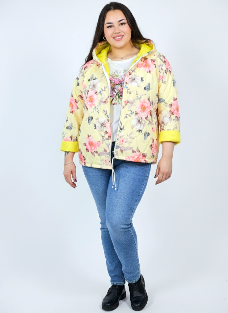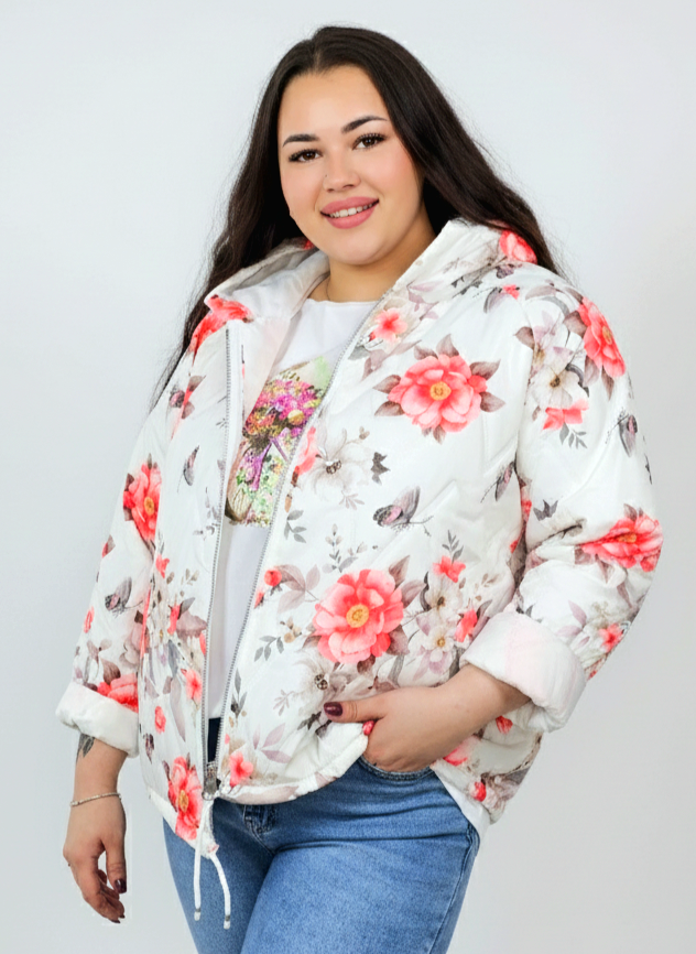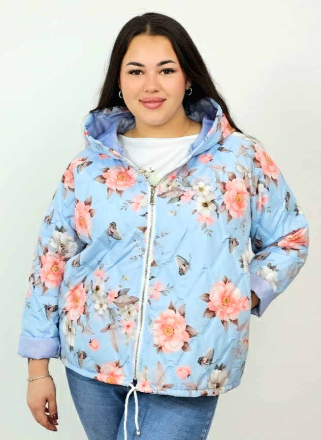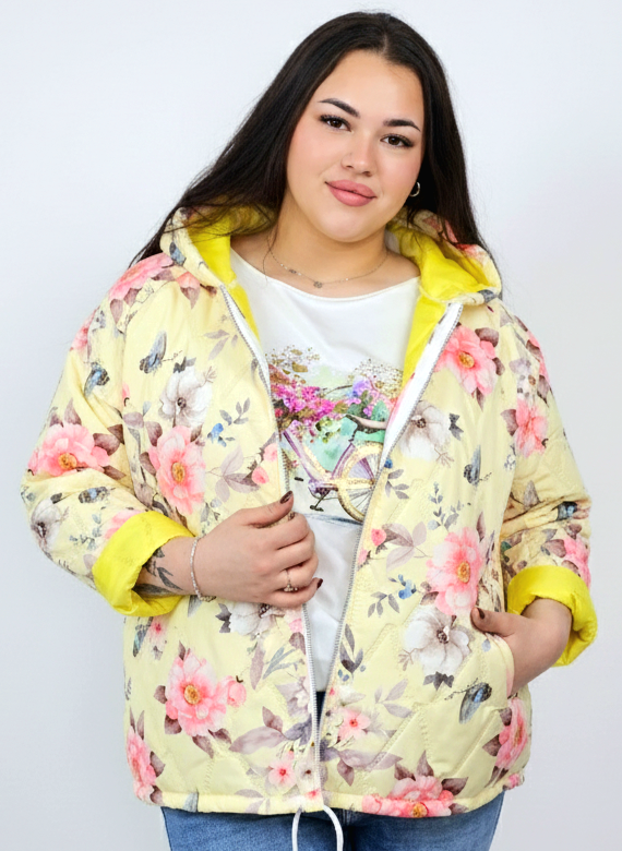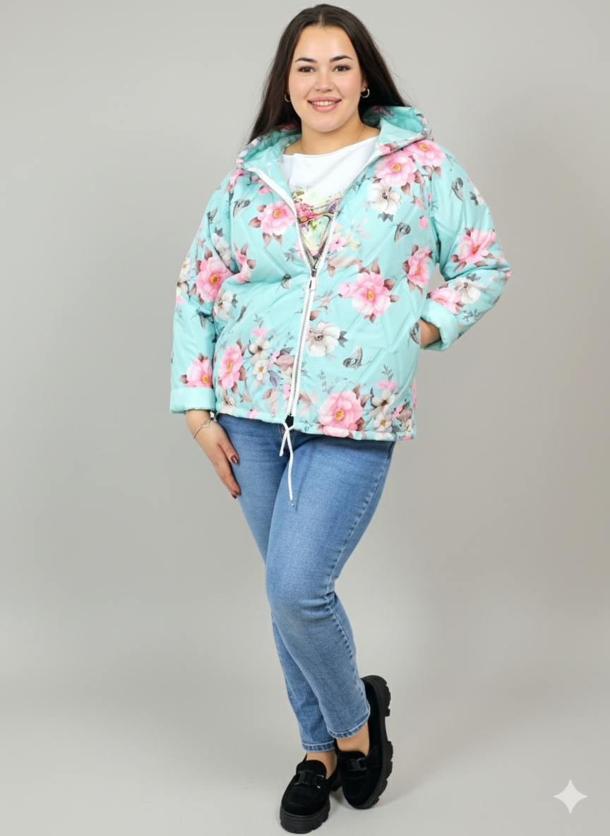 Kurtka plus size wyróżnia się kobiecym nadrukiem w kwiaty i delikatnym pikowaniem, które dodaje jej lekkości oraz nowoczesnego charakteru. Kaptur zapewnia dodatkową osłonę, a możliwość wywinięcia rękawów pozwala dopasować styl do pogody i własnych preferencji. To model, który łączy praktyczność z modą plus size, dlatego świetnie sprawdzi się w sezonie przejściowym.