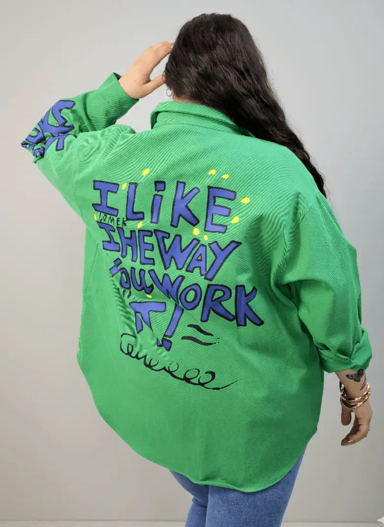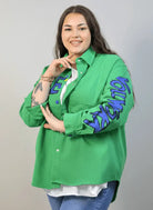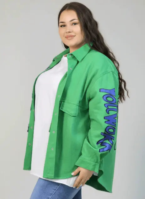 Kurtka plus size zielona koszulowa z nadrukiem i napisami
