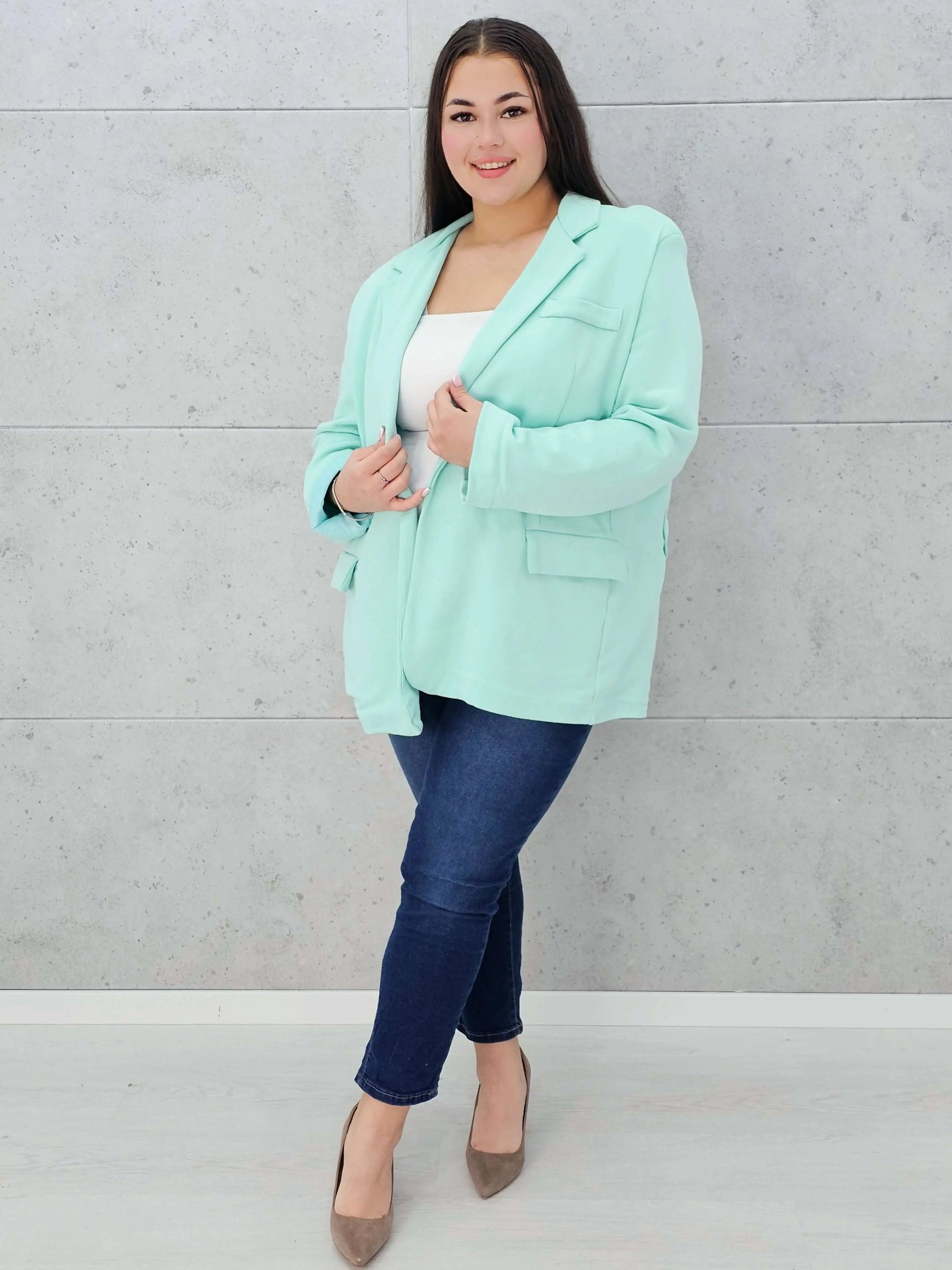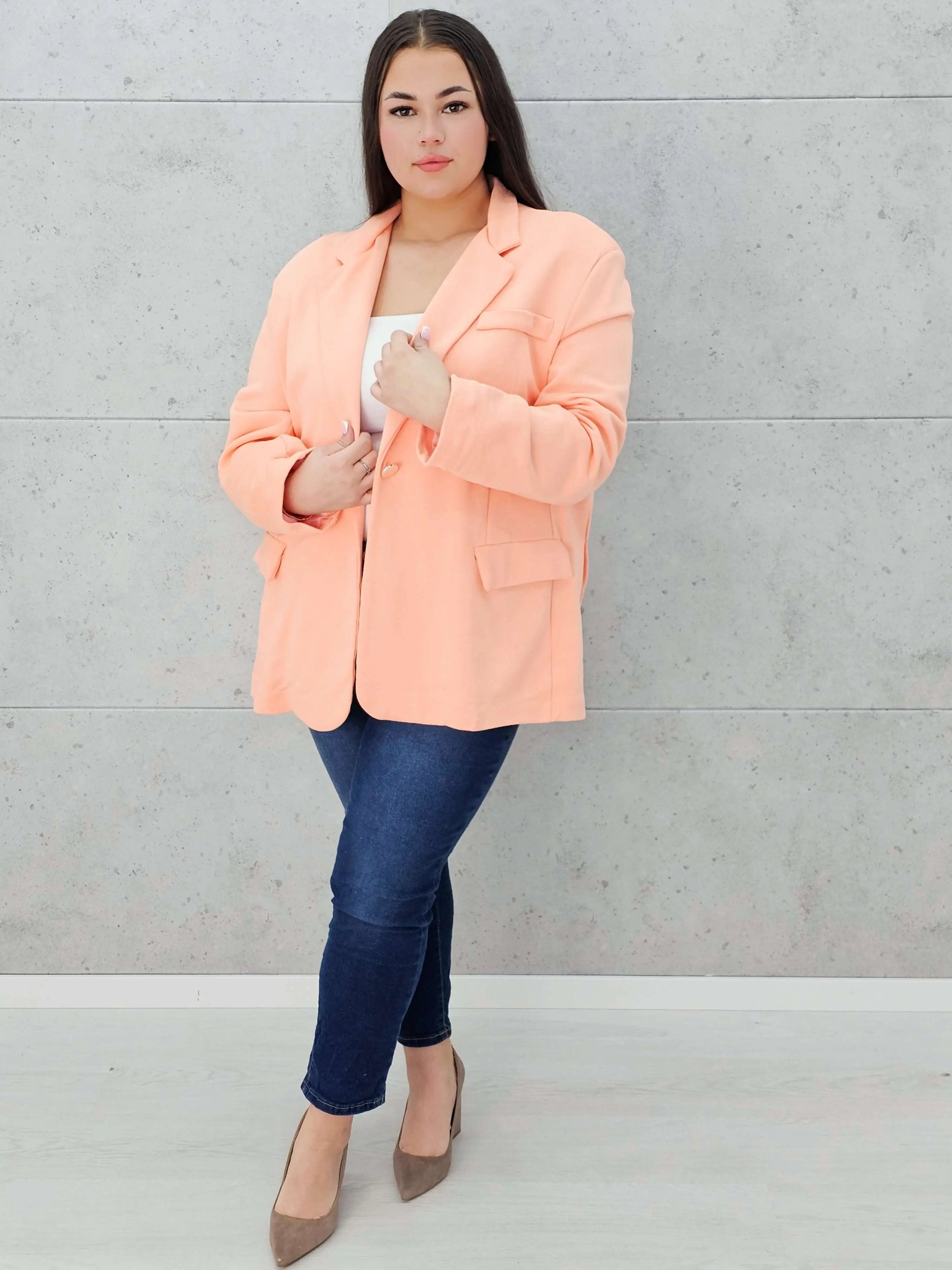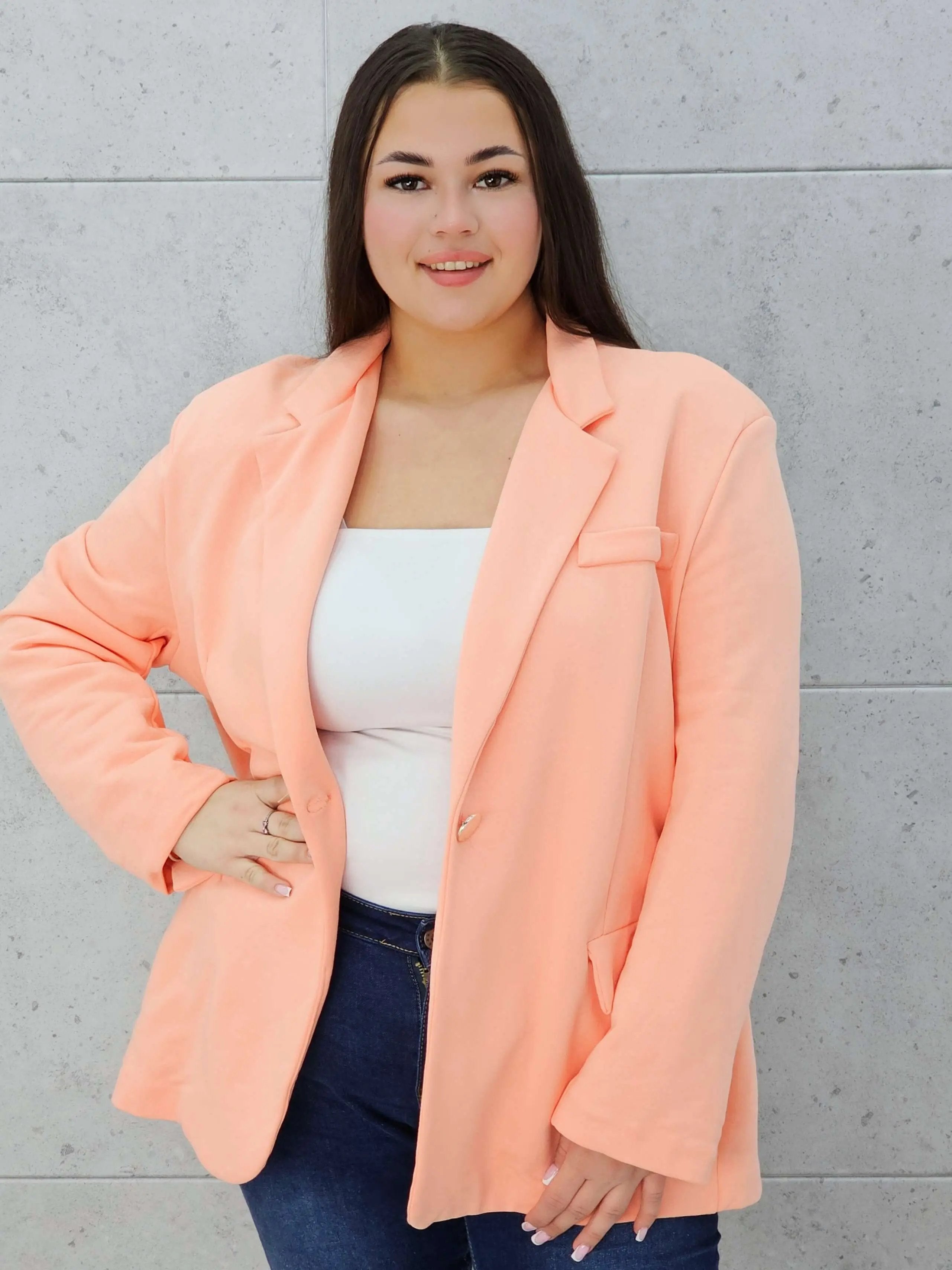 Swobodny krój gwarantuje komfort noszenia, a pojedyncze zapięcie na guzik dodaje elegancji.