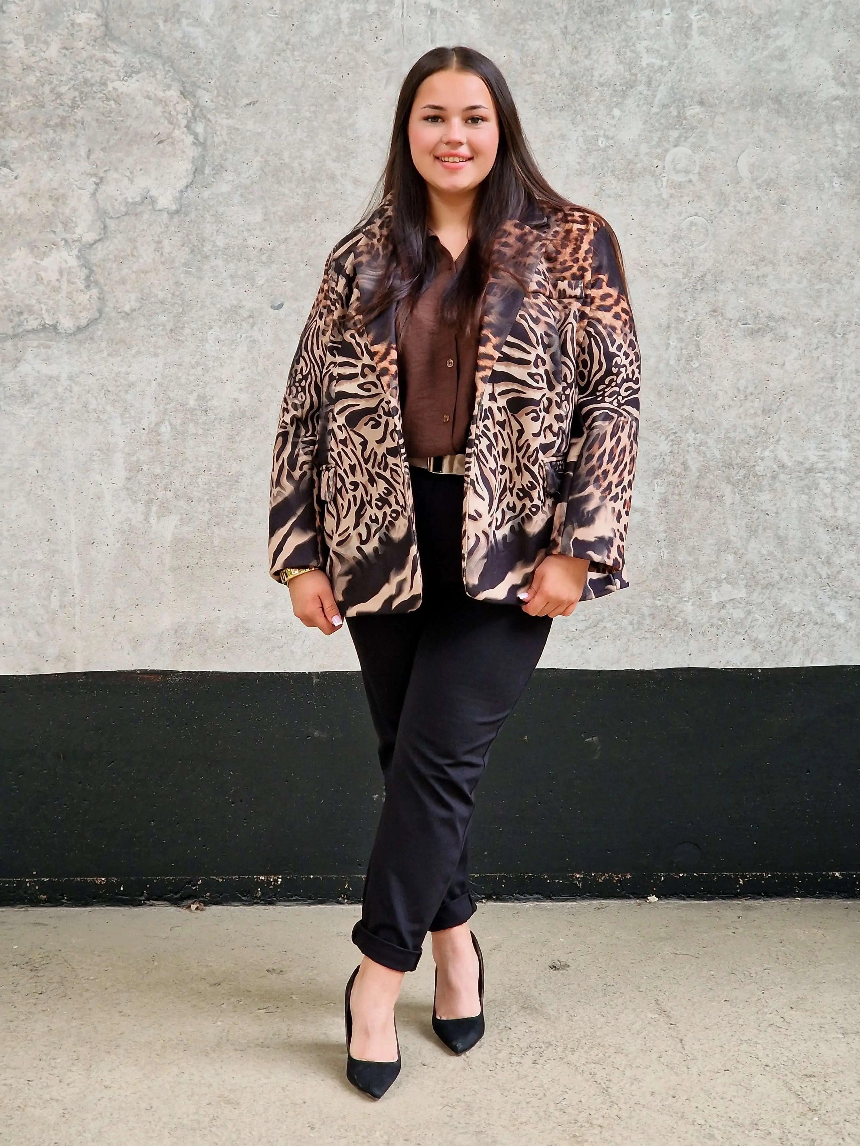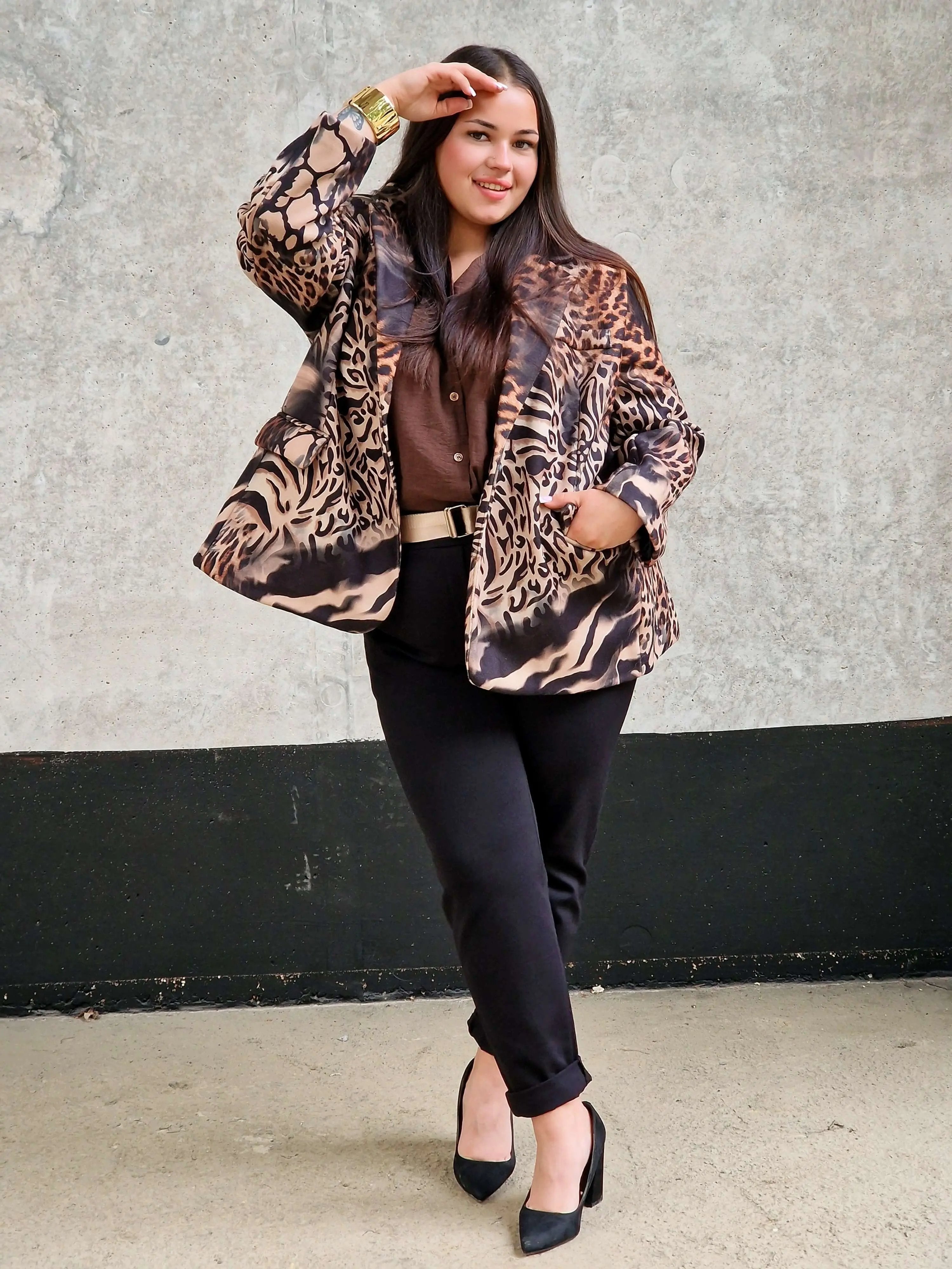 Wyraź swój charakter dzięki tej wyjątkowej marynarce w wyrazisty wzór zwierzęcy! Doskonale skomponowana mieszanka motywów, takich jak leopard i zebra, sprawia, że ta marynarka przyciągnie uwagę w każdej stylizacji. Idealna na wyjątkowe okazje, wieczorne wyjścia, a także na co dzień, kiedy chcesz wyglądać stylowo i pewnie. Luźny krój zapewnia komfort noszenia, a klasyczny kołnierz dodaje elegancji. W zestawieniu z modnym kapeluszem tworzy pełen wdzięku, przykuwający uwagę look.