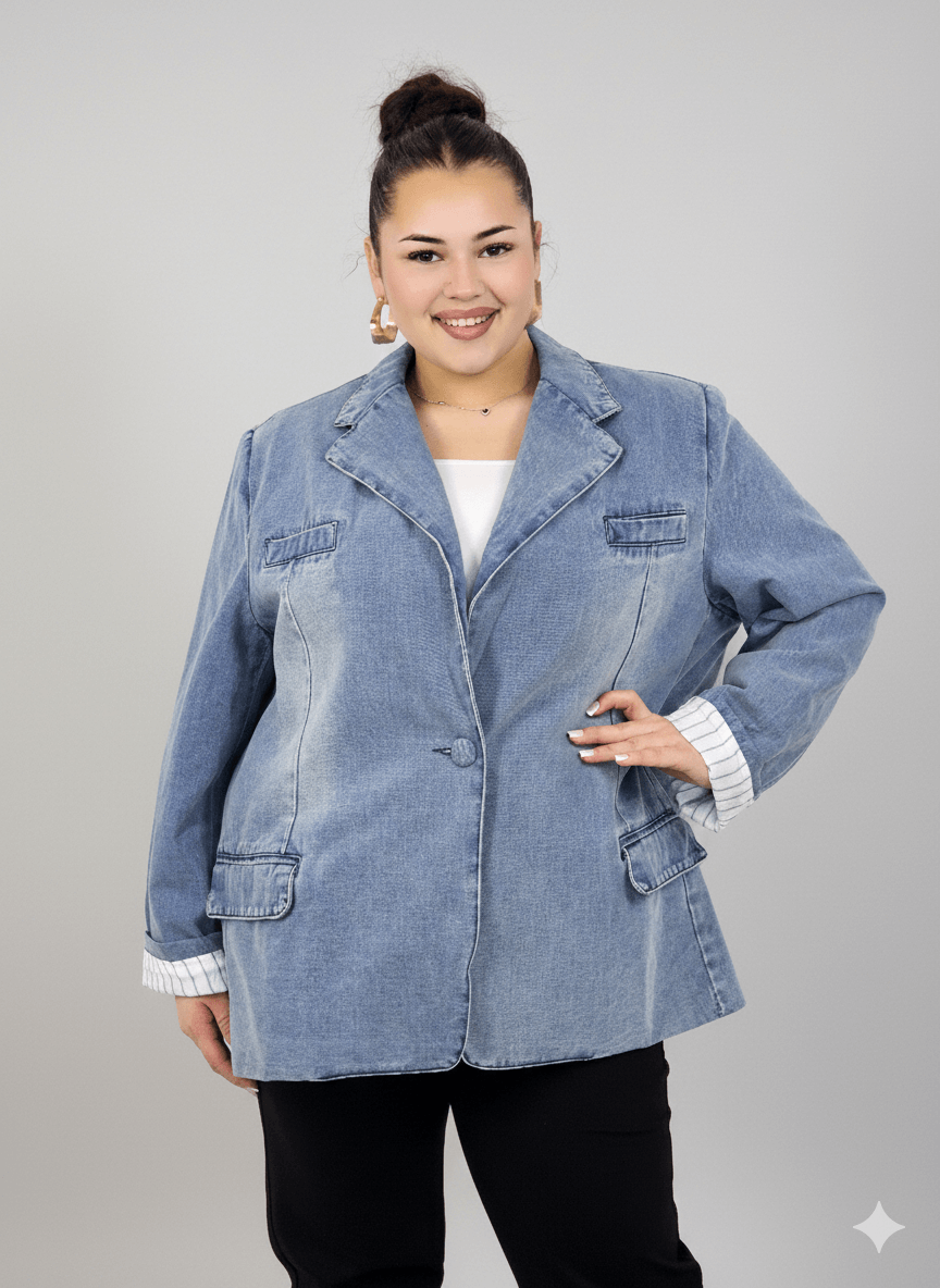 Marynarka plus size to doskonałe połączenie klasyki z nowoczesną modą XXL. Wykonana z miękkiego, przyjemnego w dotyku denimu, świetnie układa się na sylwetce i zapewnia komfort noszenia przez cały dzień. Fason inspirowany klasyczną marynarką sprawia, że marynarka plus size pasuje zarówno do stylizacji casualowych, jak i bardziej eleganckich – do pracy, na spotkania czy wyjścia.