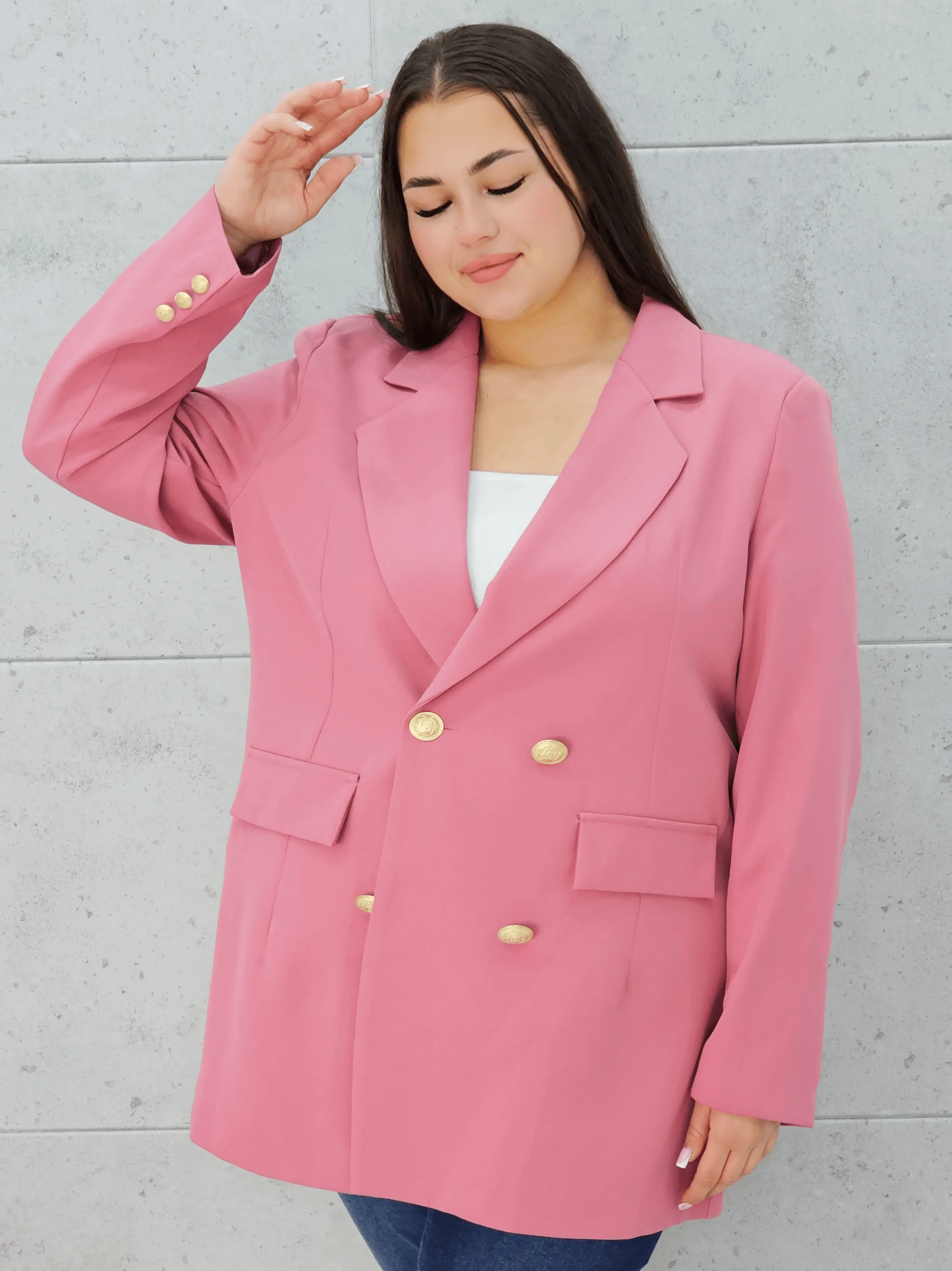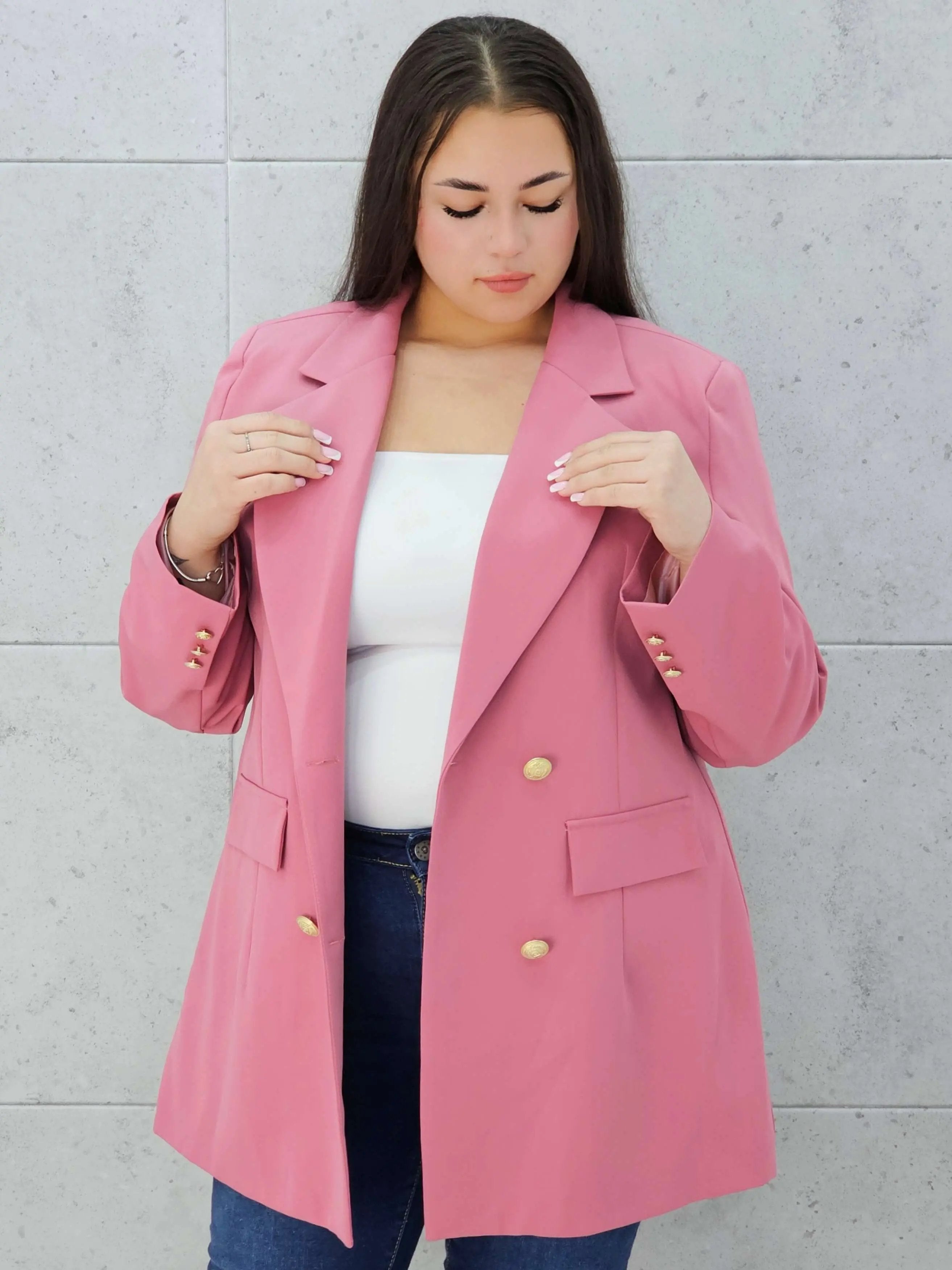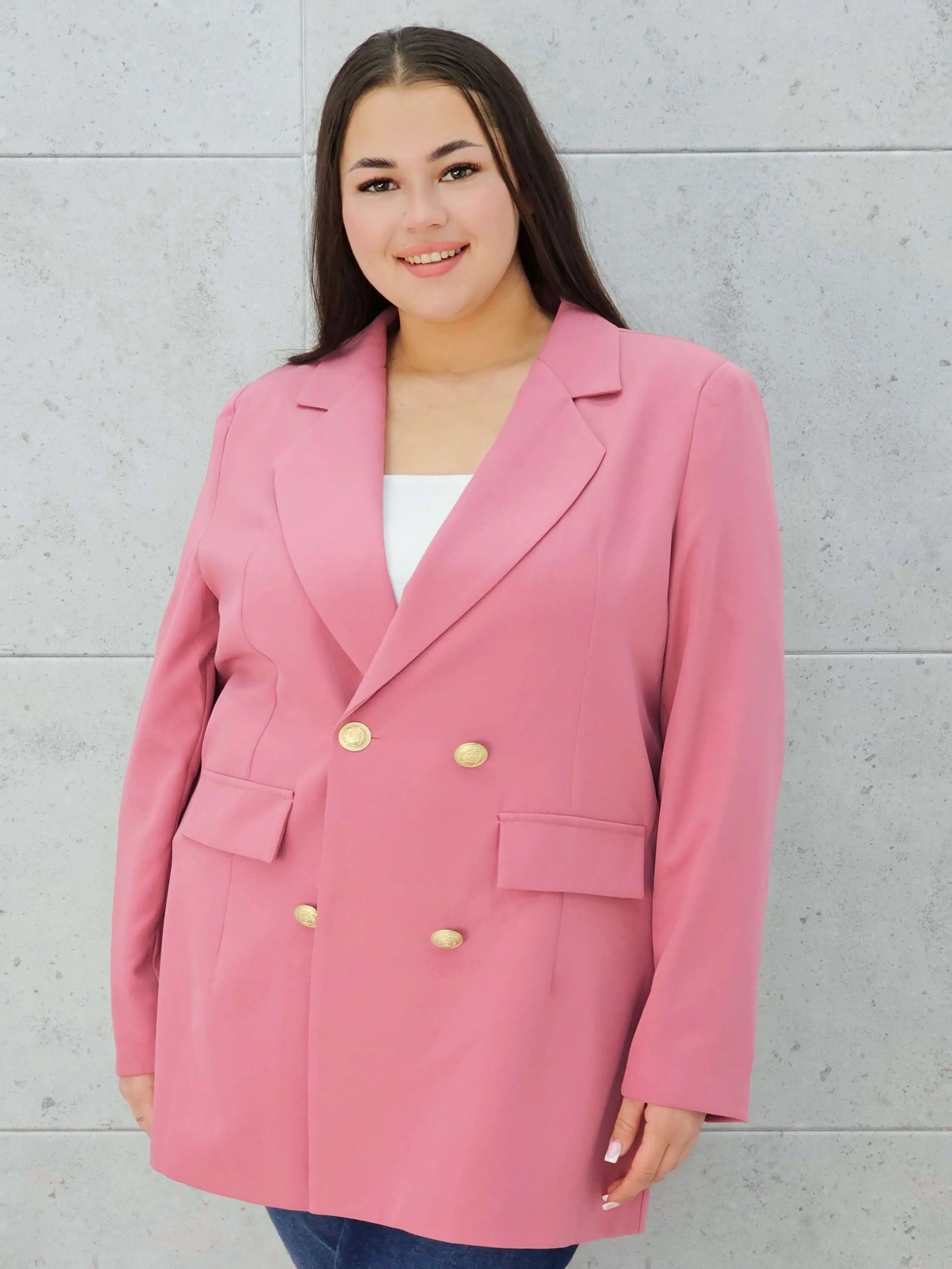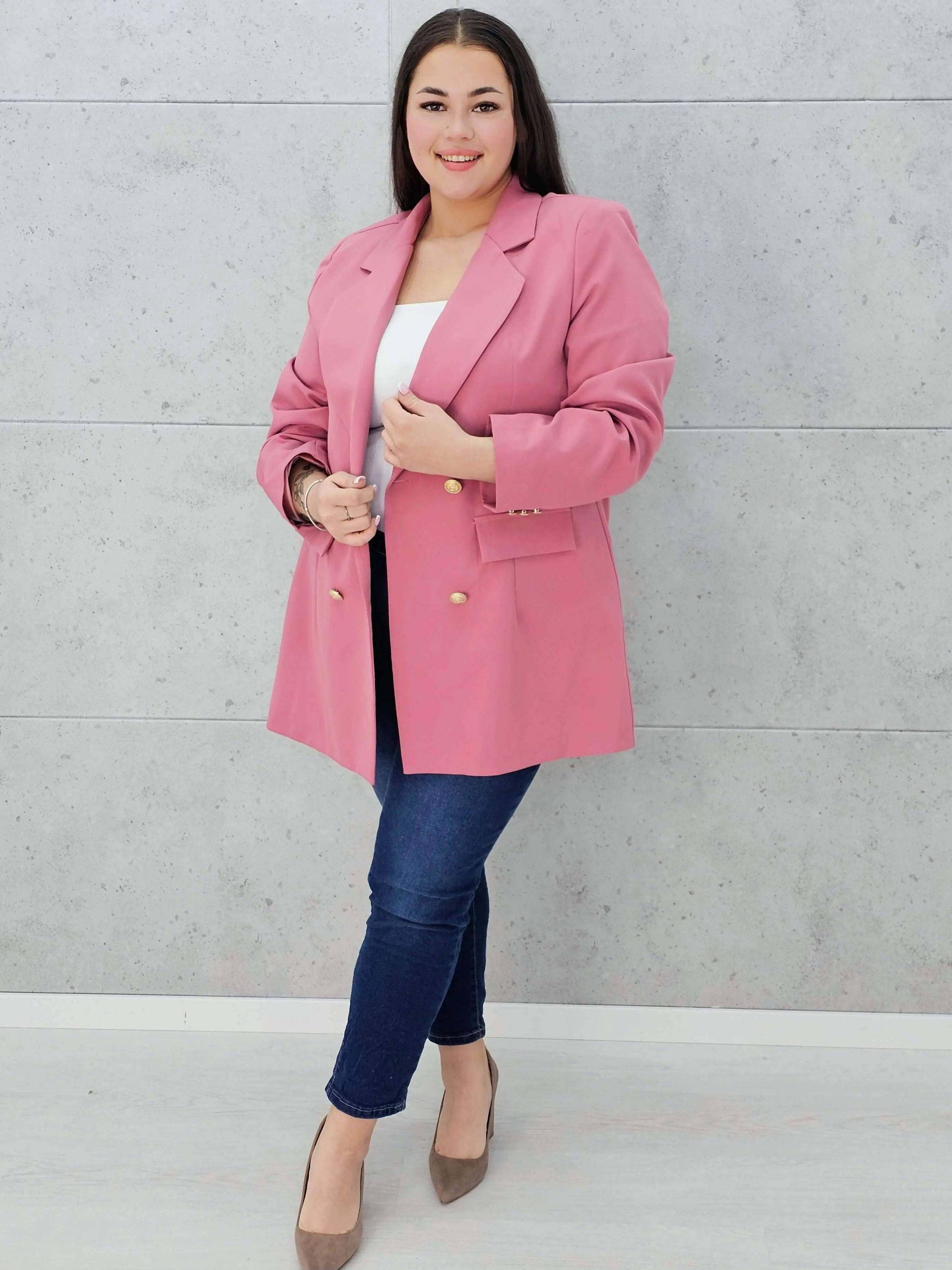 Marynarka z guzikami plus size w pudrowym różu – elegancja i kobiecy styl