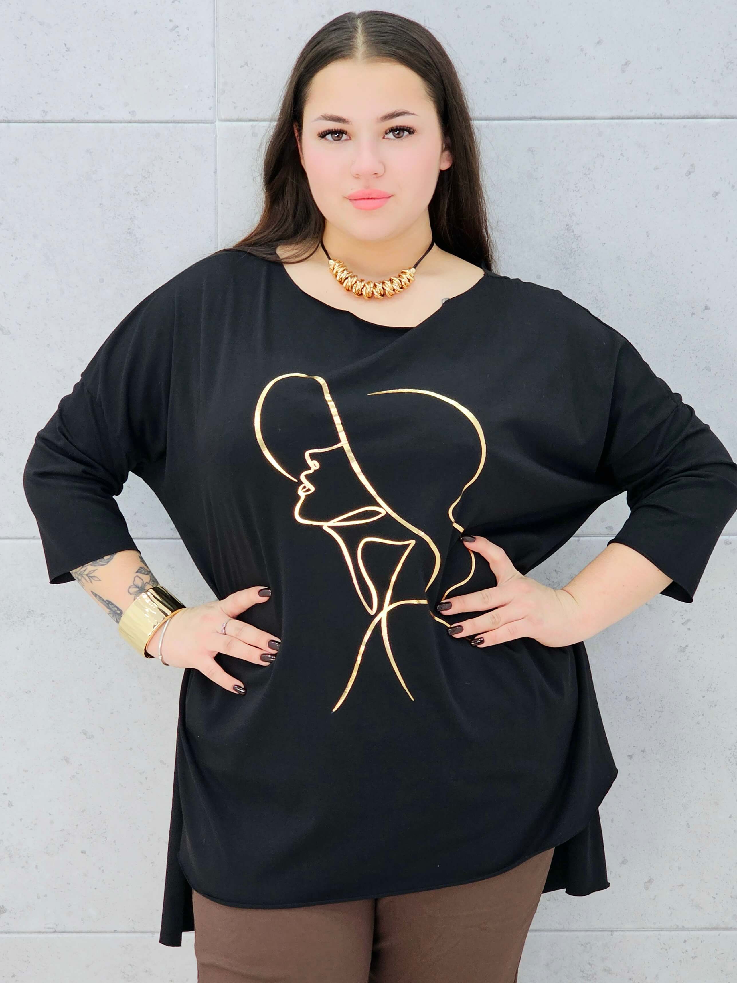 Złoty nadruk kobiety w kapeluszu dodaje szyku, a dłuższy tył bluzki zapewnia komfort i swobodę ruchów.