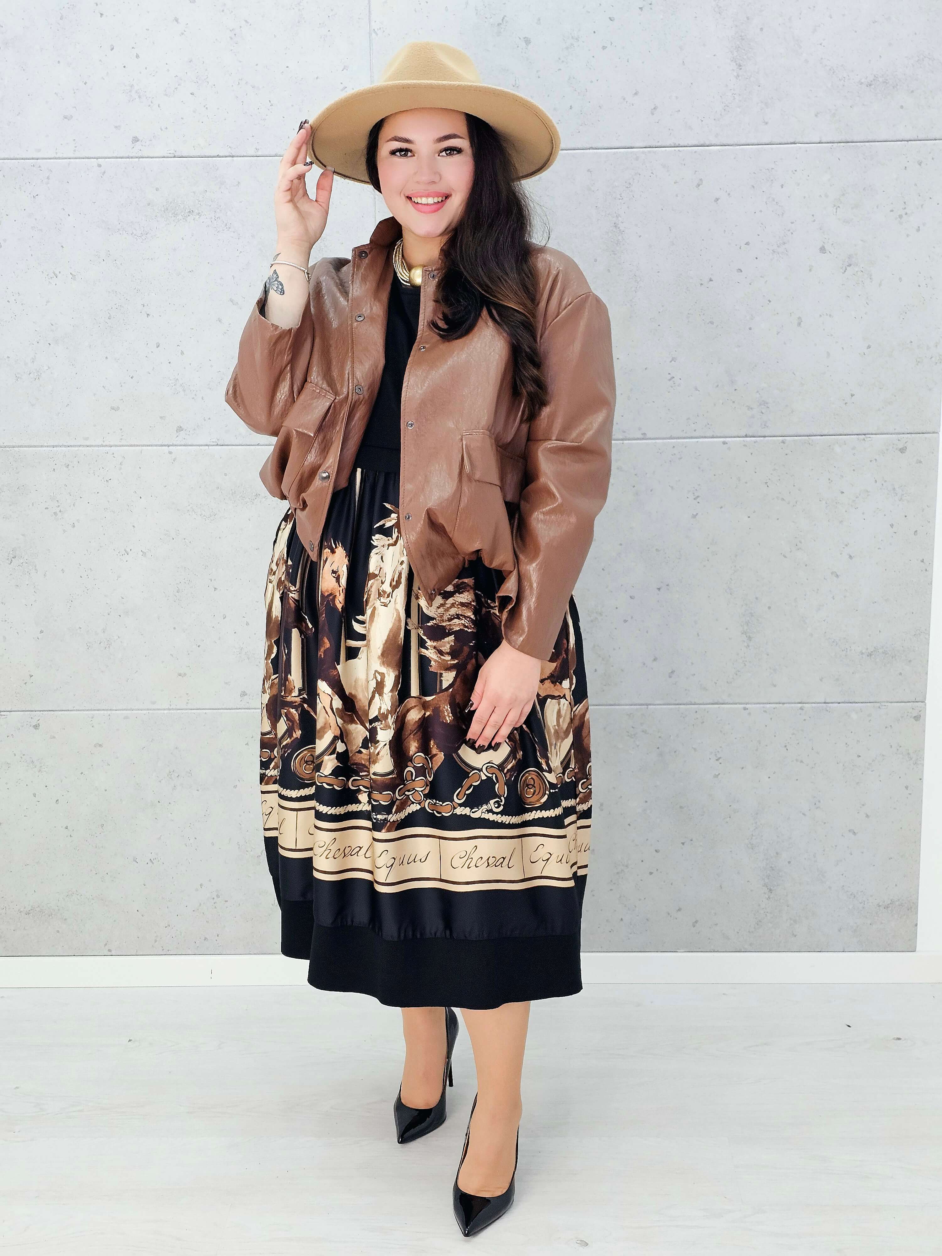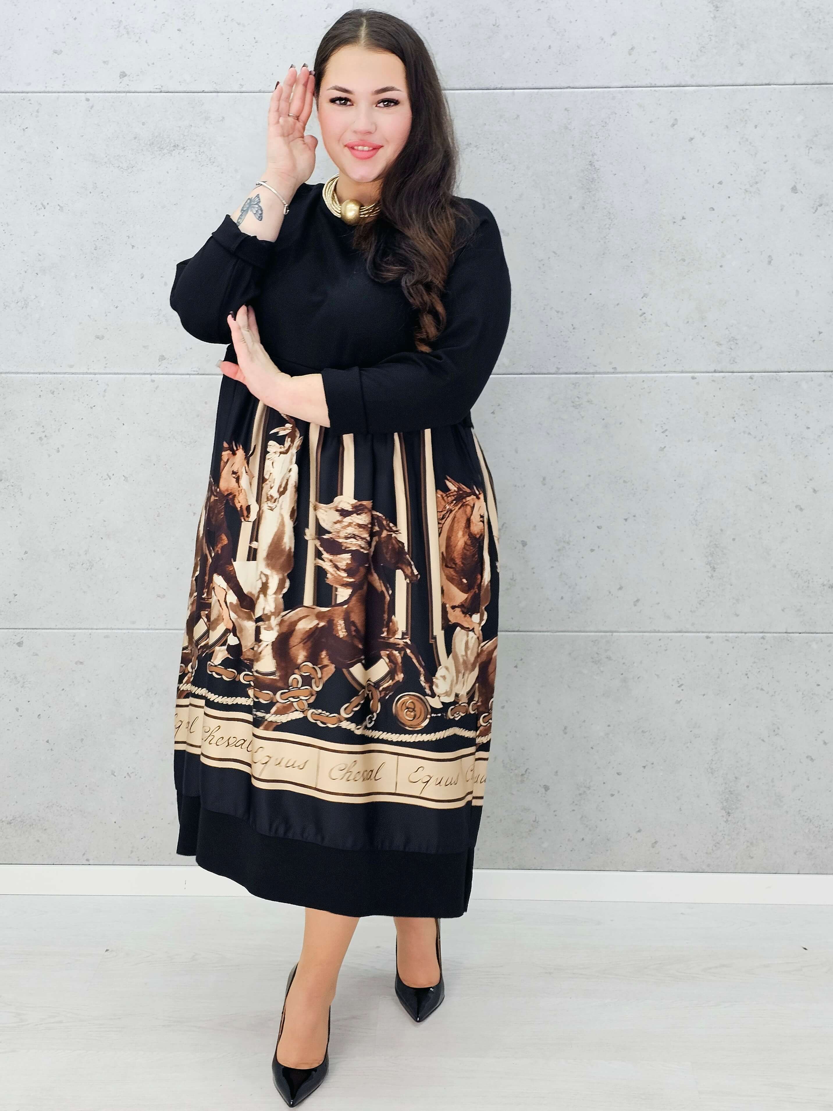 Wyjątkowa czarna sukienka midi plus size z motywem koni to połączenie elegancji, wygody i stylu, który przyciąga spojrzenia.