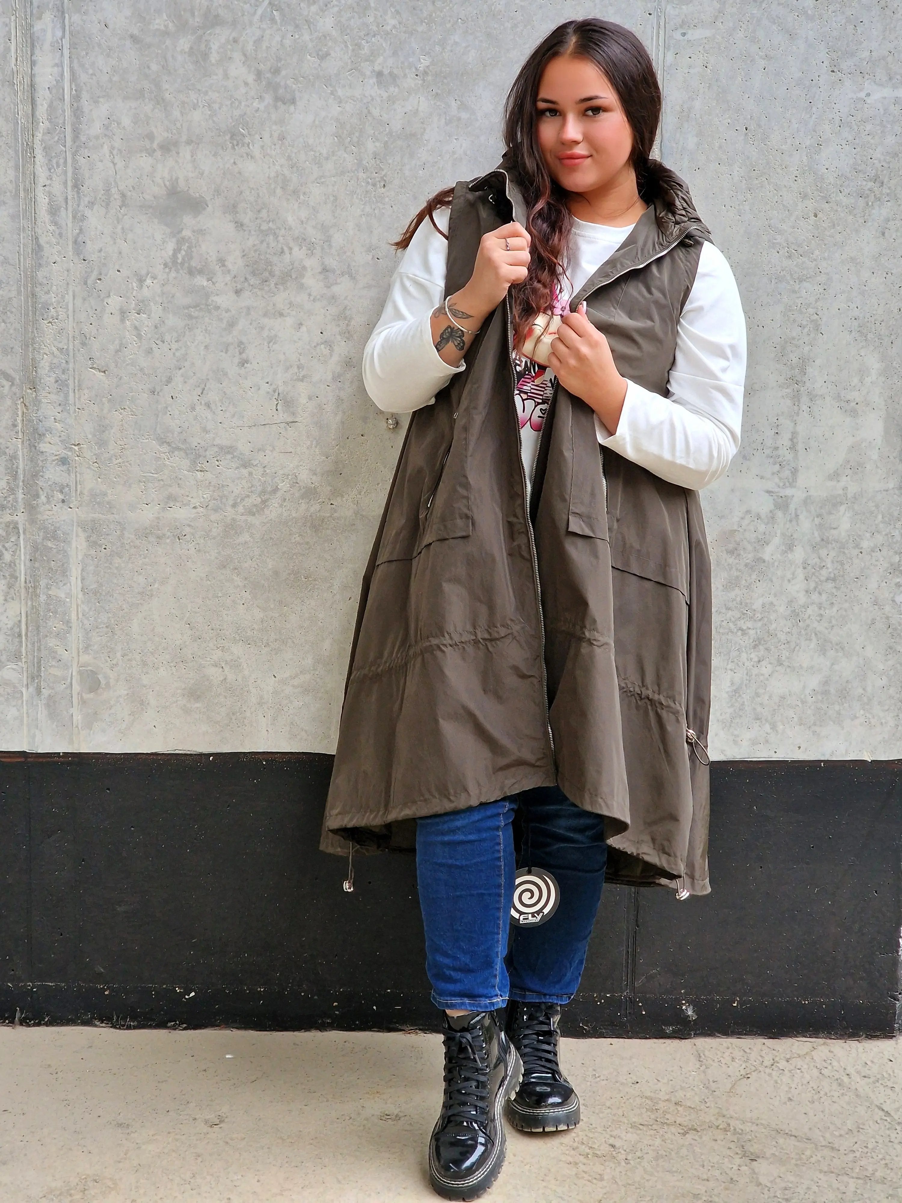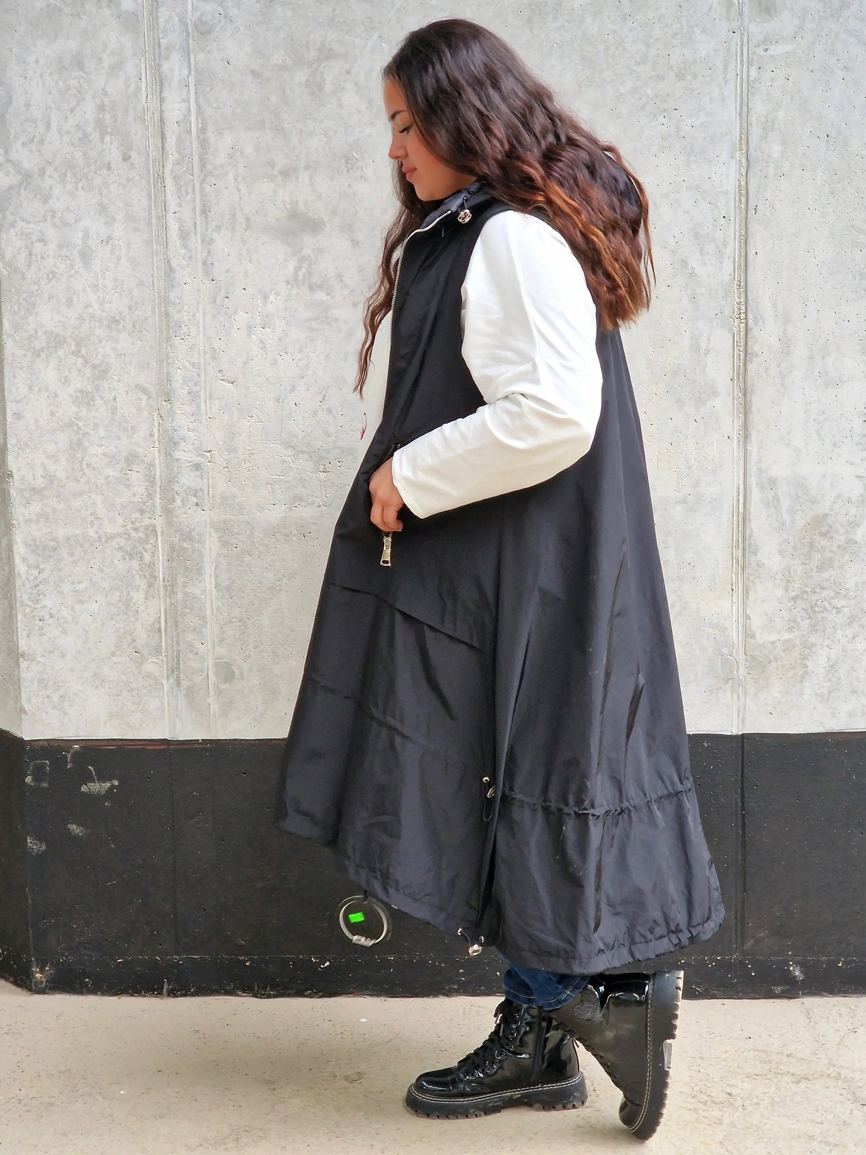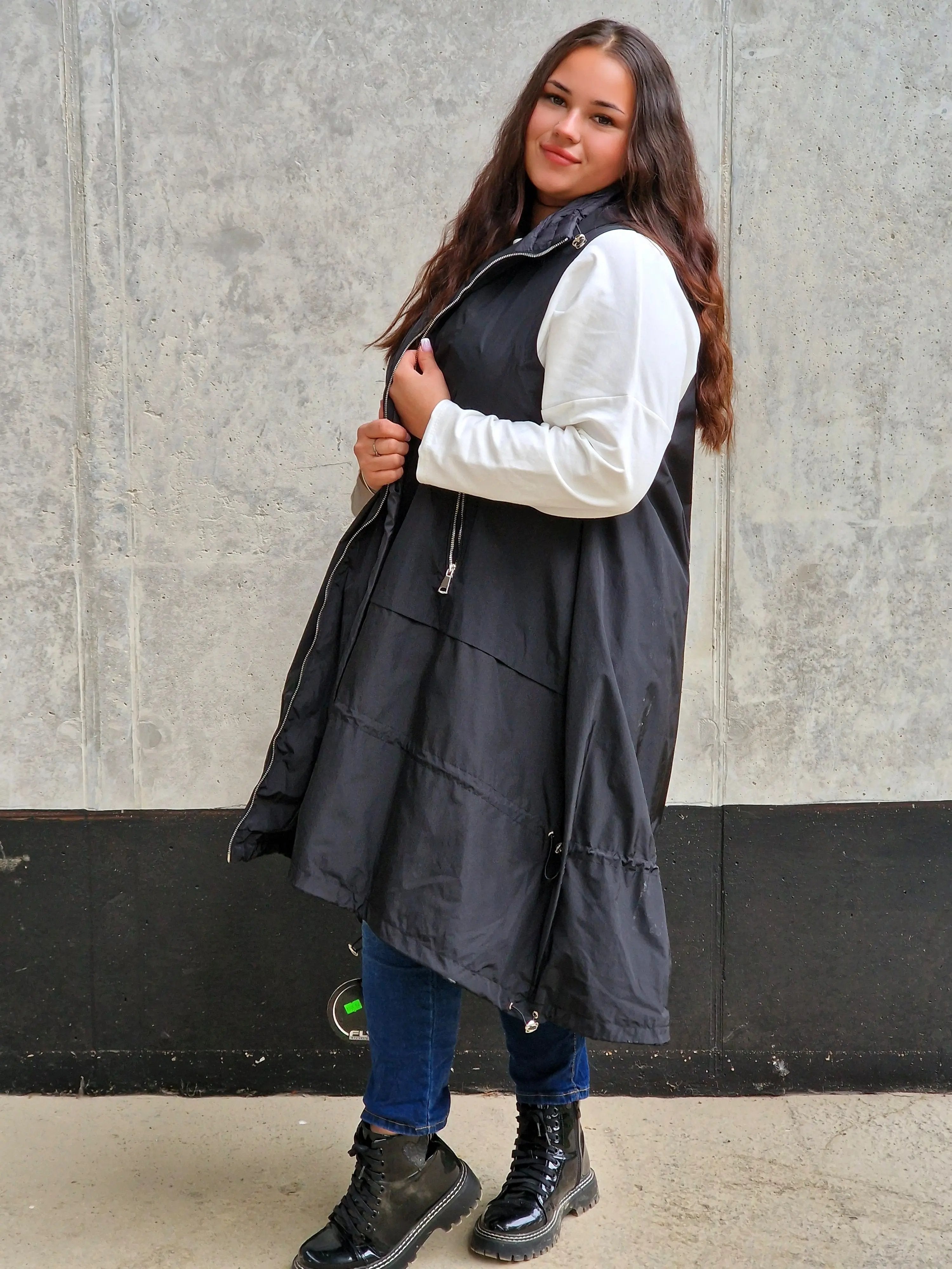 Uszyta z lekkiego, przyjemnego w dotyku materiału, kamizelka zapewnia wygodę i idealne dopasowanie do sylwetki plus size. Długość do bioder oraz lekko przedłużony tył nadają całości nowoczesnego charakteru, a praktyczny kaptur chroni przed chłodem i wiatrem. Dwie pojemne kieszenie to nie tylko wygoda, ale i funkcjonalny detal, który doceni każda kobieta.