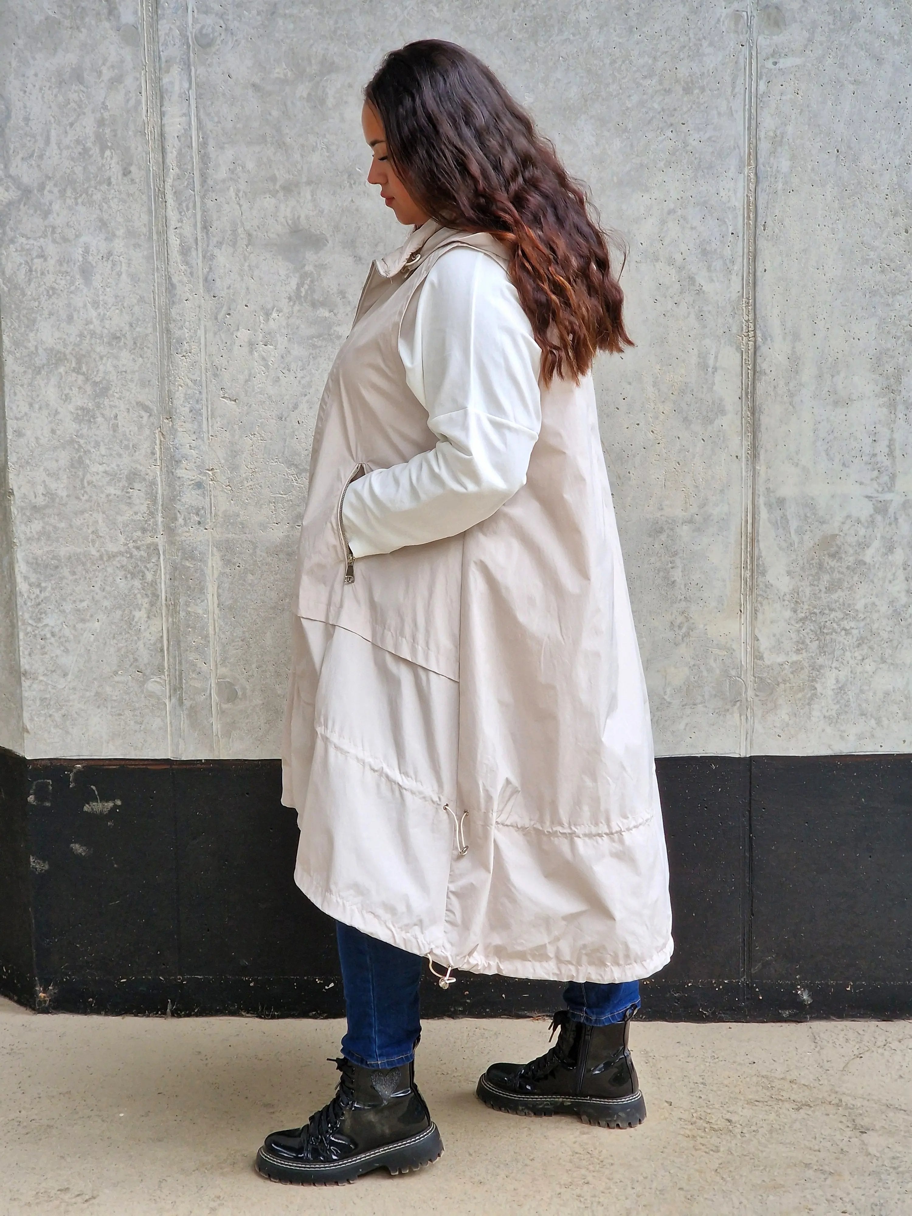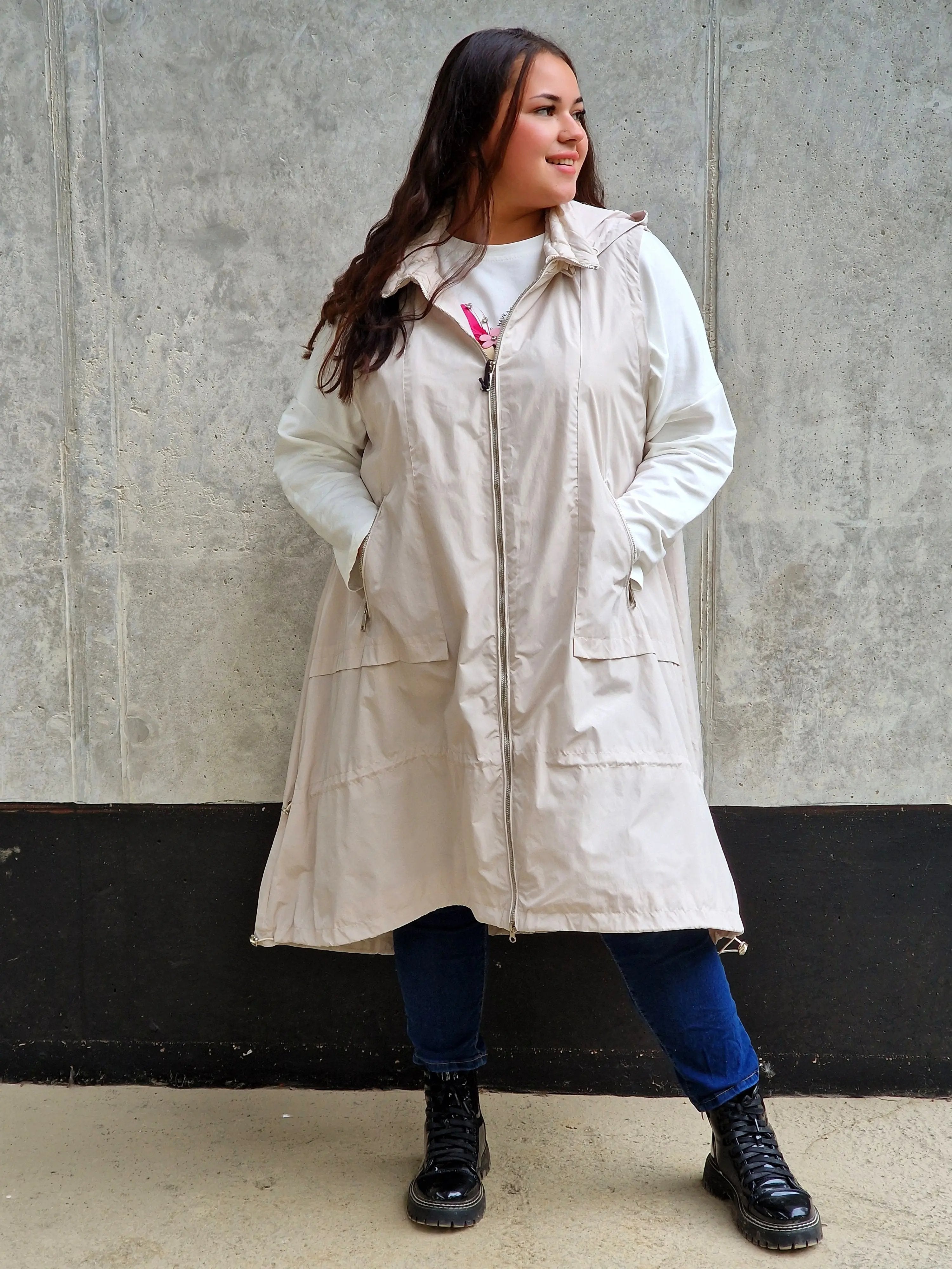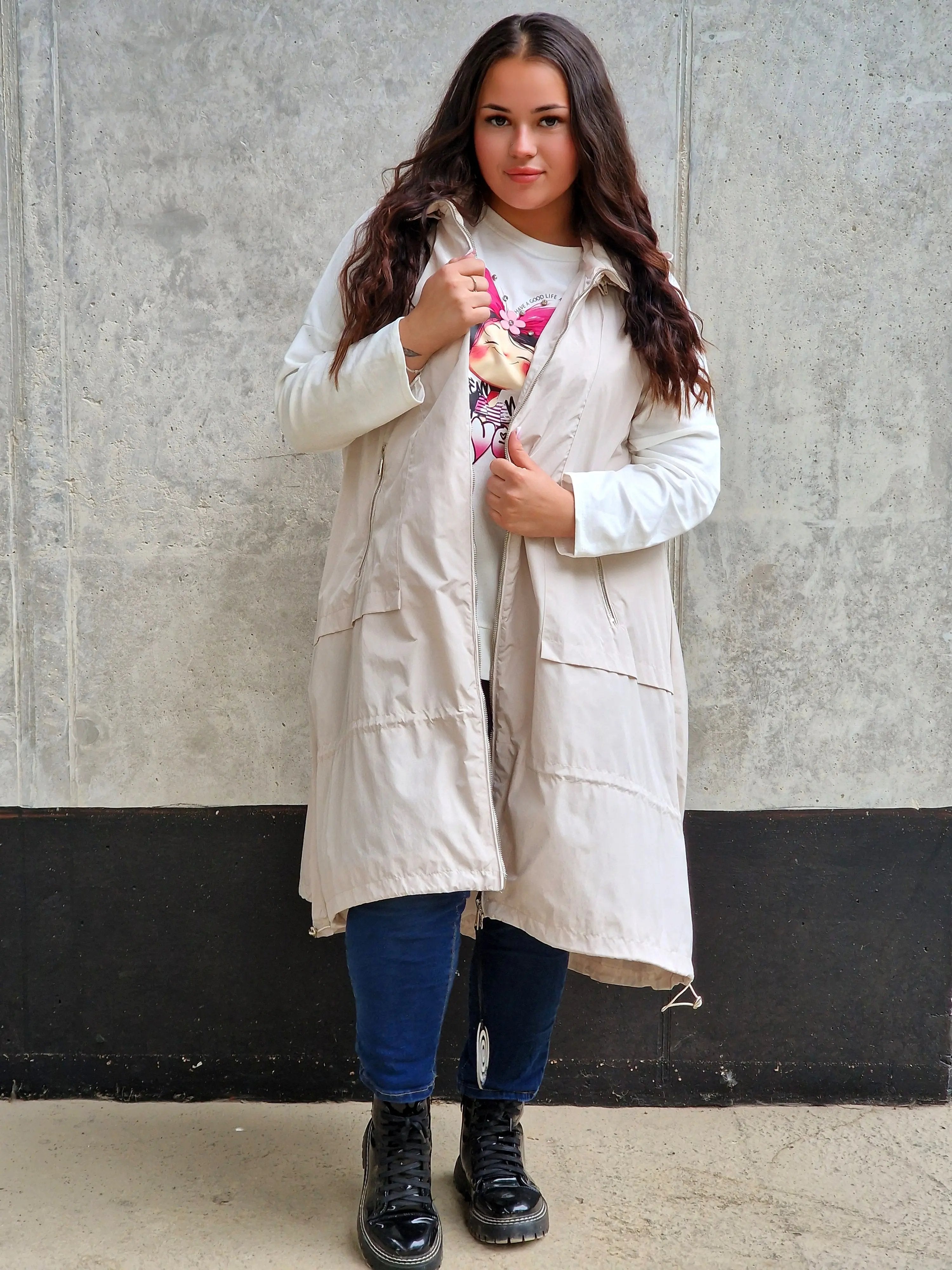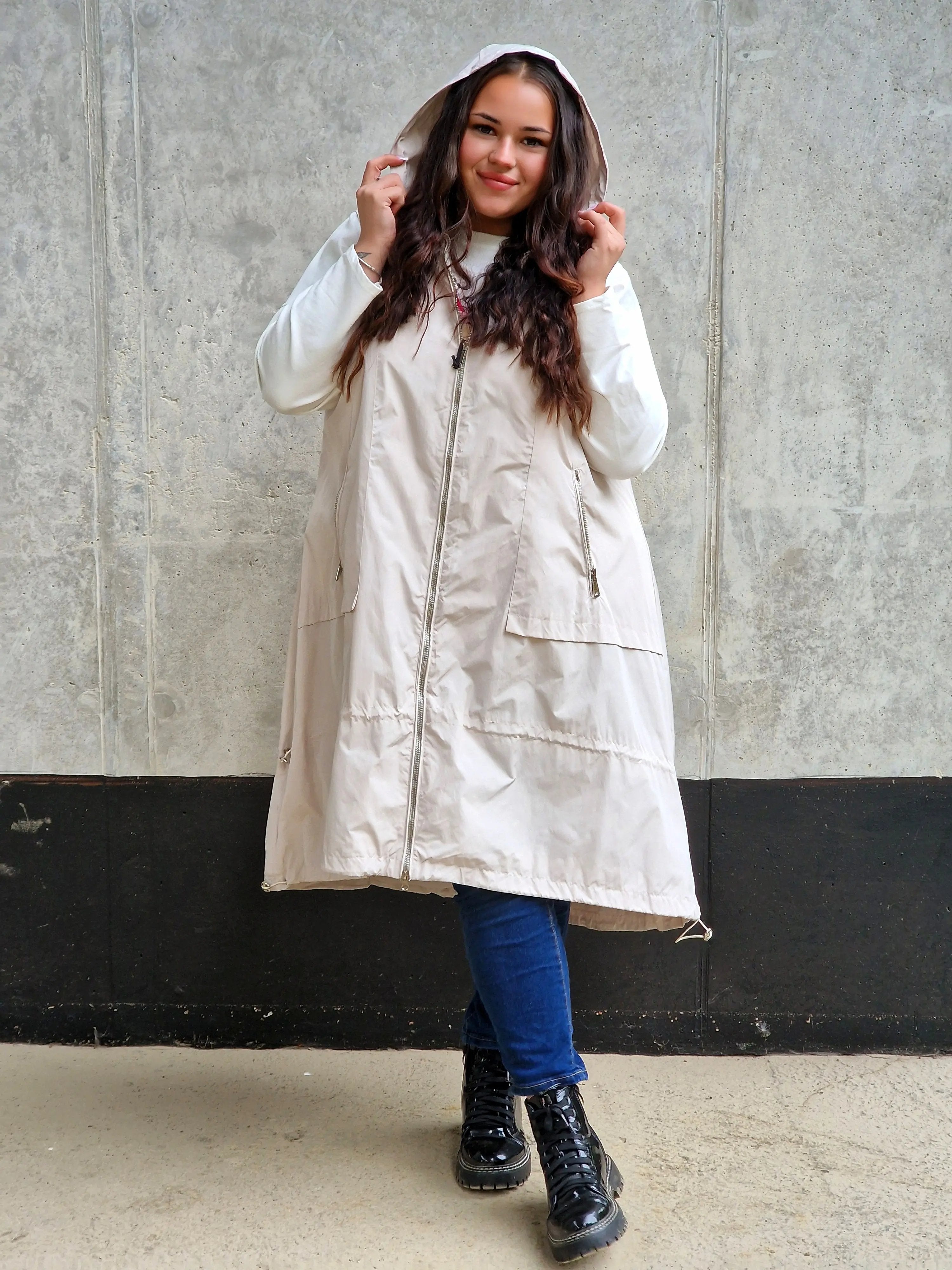 • Modny, wydłużony fason z kapturem