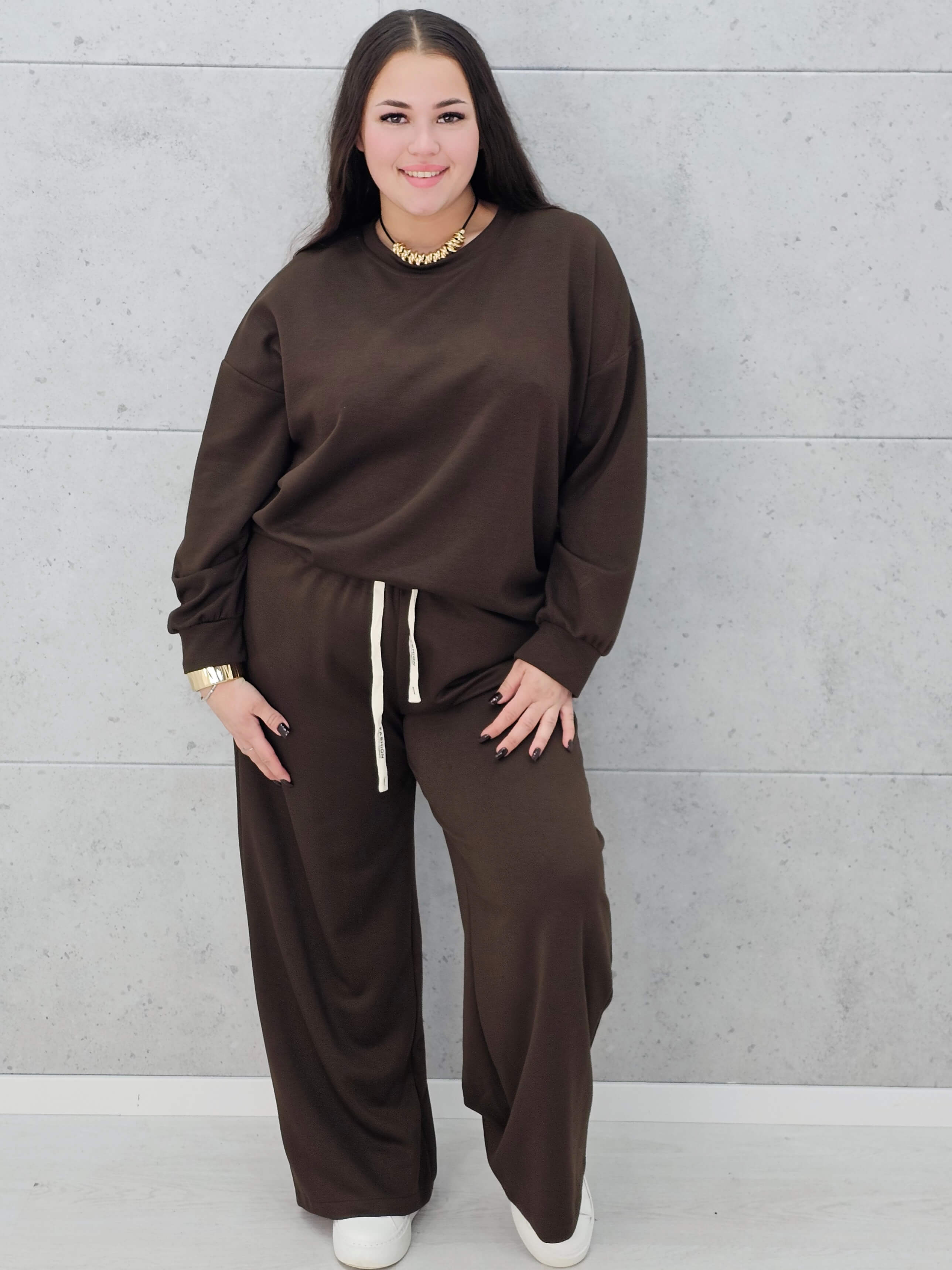 Luźna bluza i szerokie spodnie tworzą nowoczesny, lekko oversize’owy komplet, który doskonale wpisuje się w aktualne trendy mody plus size.