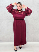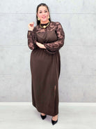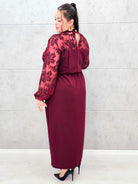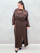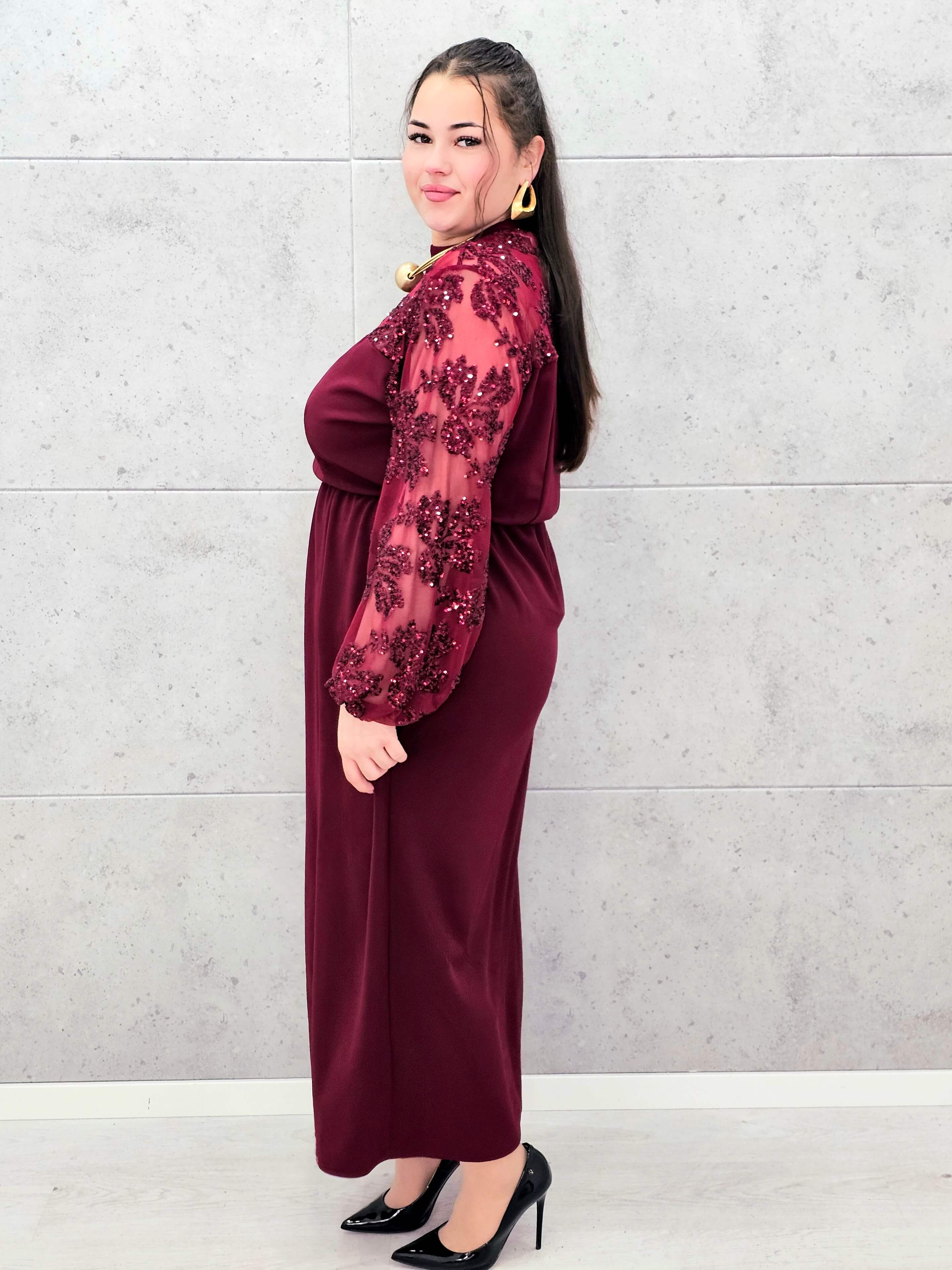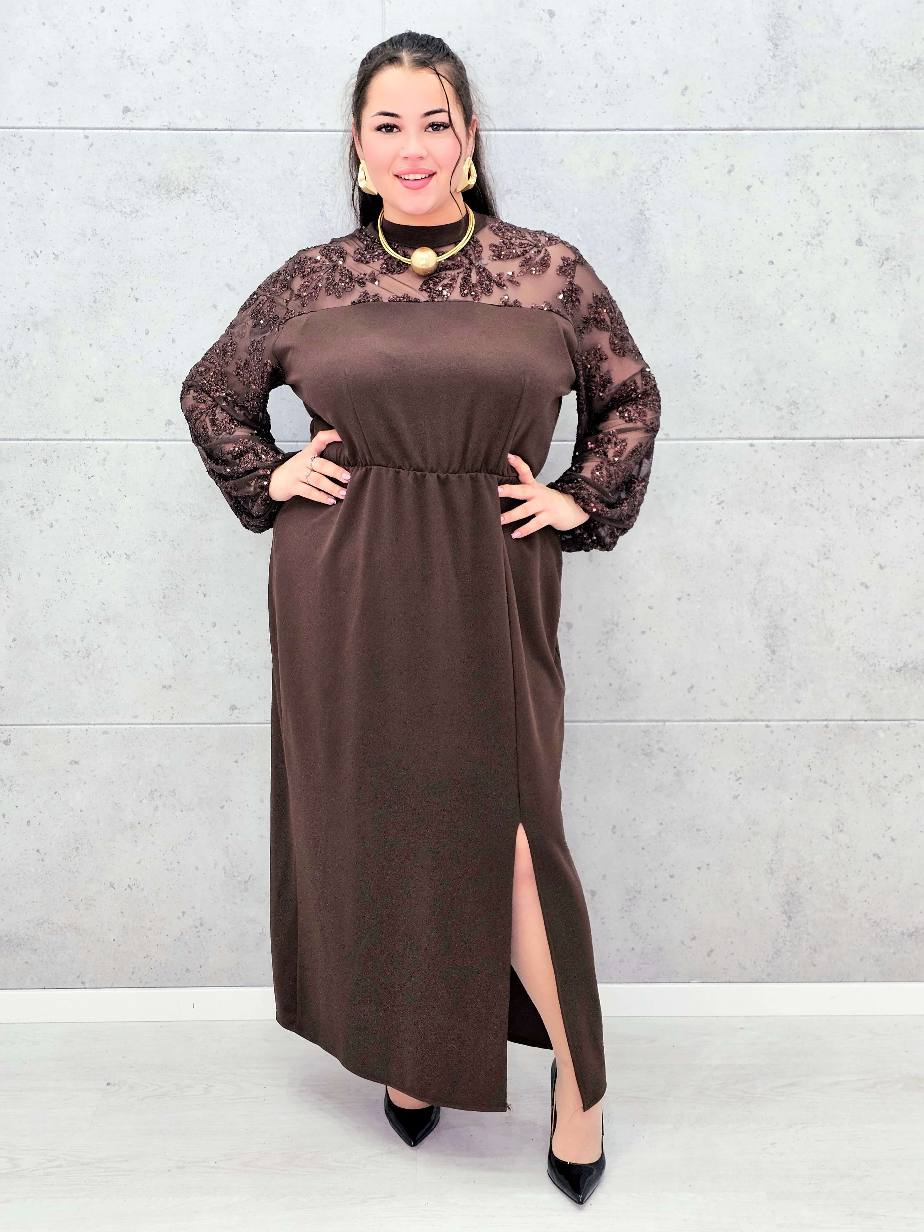 Całość zdobi misternie haftowana koronka pokryta mieniącymi się cekinami, które subtelnie odbijają światło i dodają kreacji niezwykłej elegancji. Dół sukienki wykonany jest z delikatnie lejącego materiału, który pięknie pracuje podczas chodzenia, optycznie wysmuklając sylwetkę. Model posiada elastyczną talię, dzięki czemu świetnie dopasowuje się do różnych wymiarów w obrębie rozmiarów plus size. To jeden z najbardziej reprezentacyjnych modeli w kategorii eleganckich sukienek XXL – daje efekt WOW bez wysiłku.