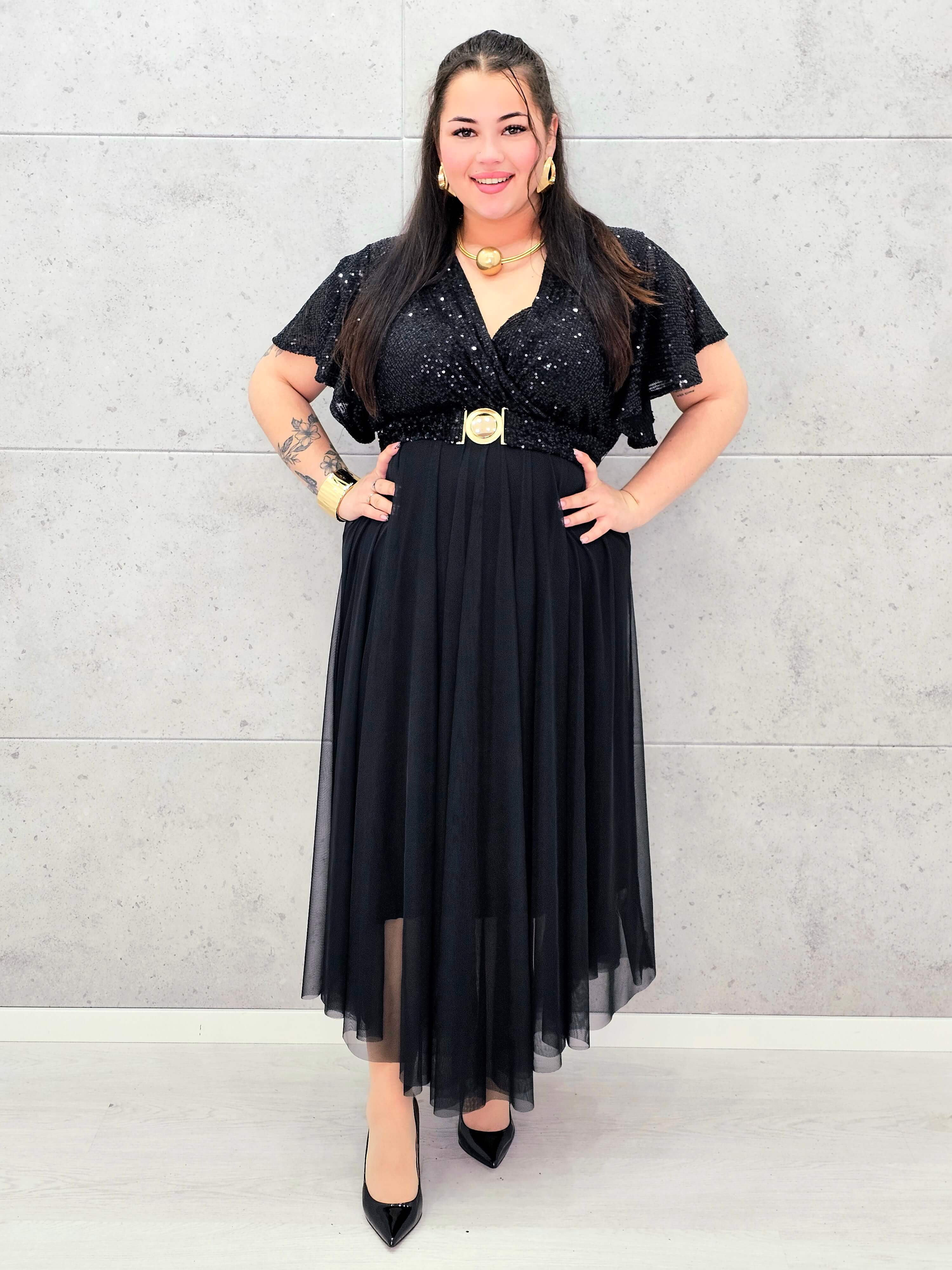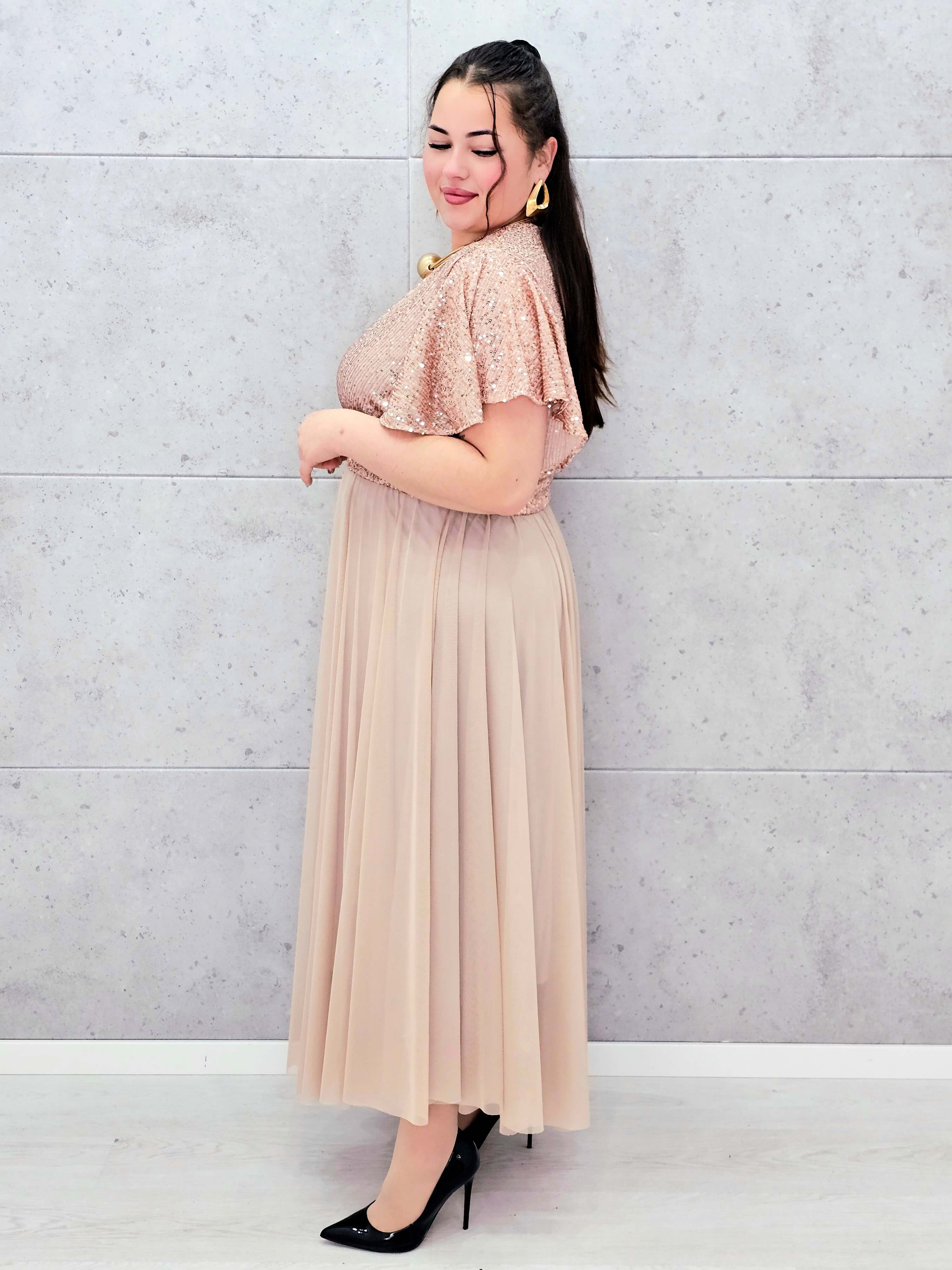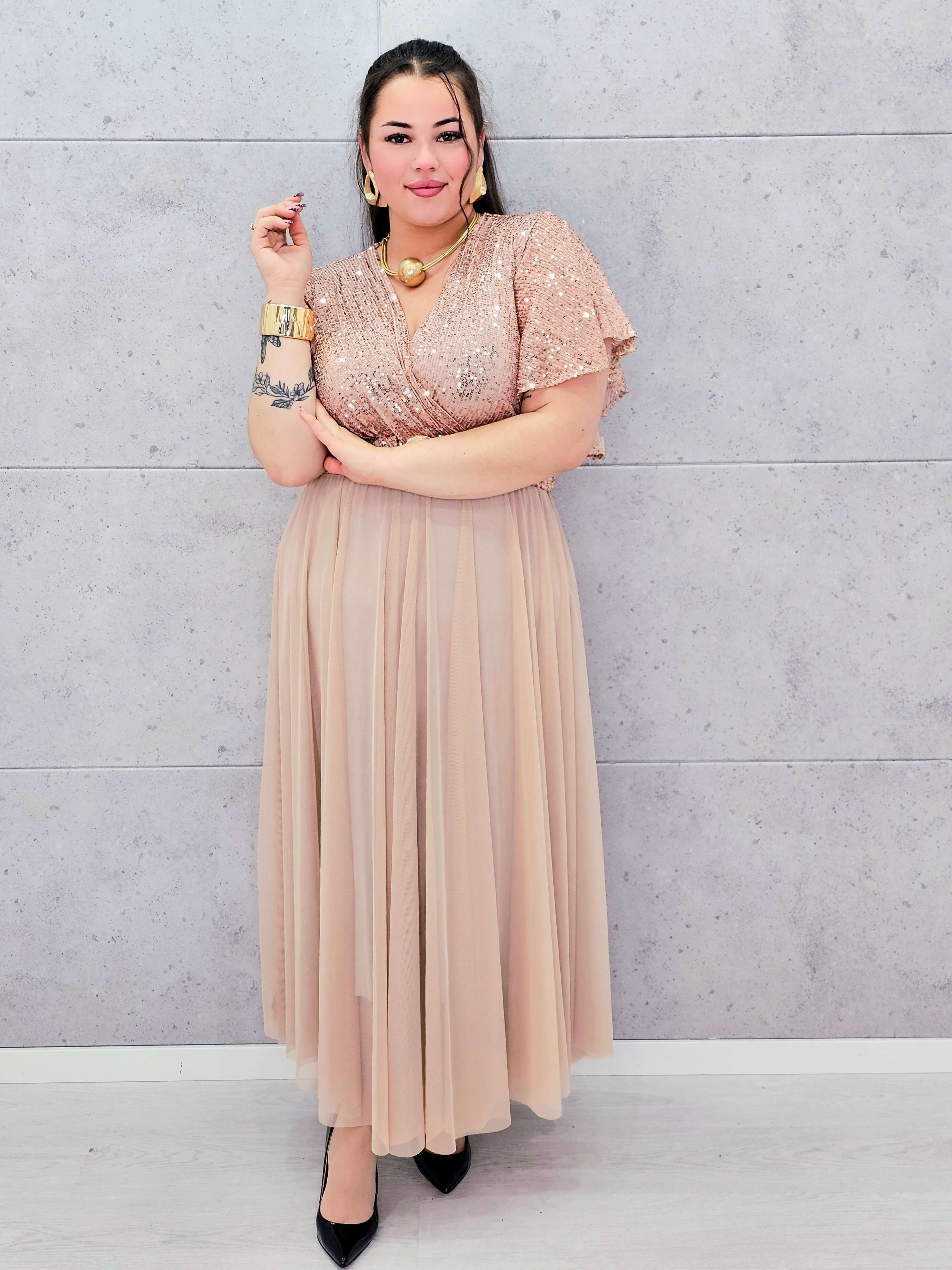 Elegancka sukienka XXL z cekinową górą i plisowanym dołem – wyjątkowa kolekcja plus size