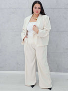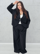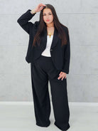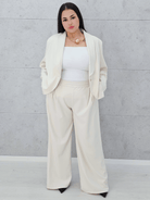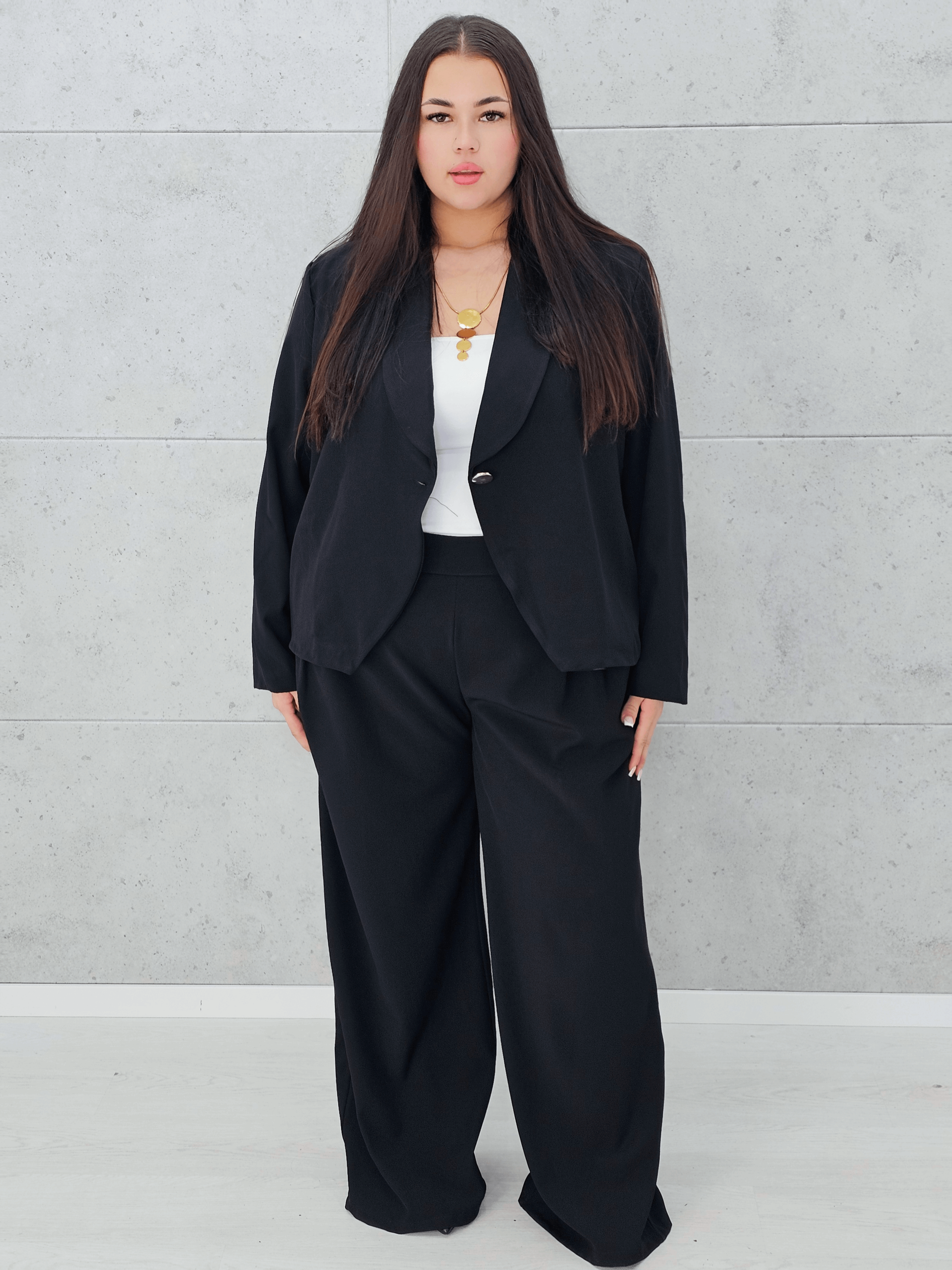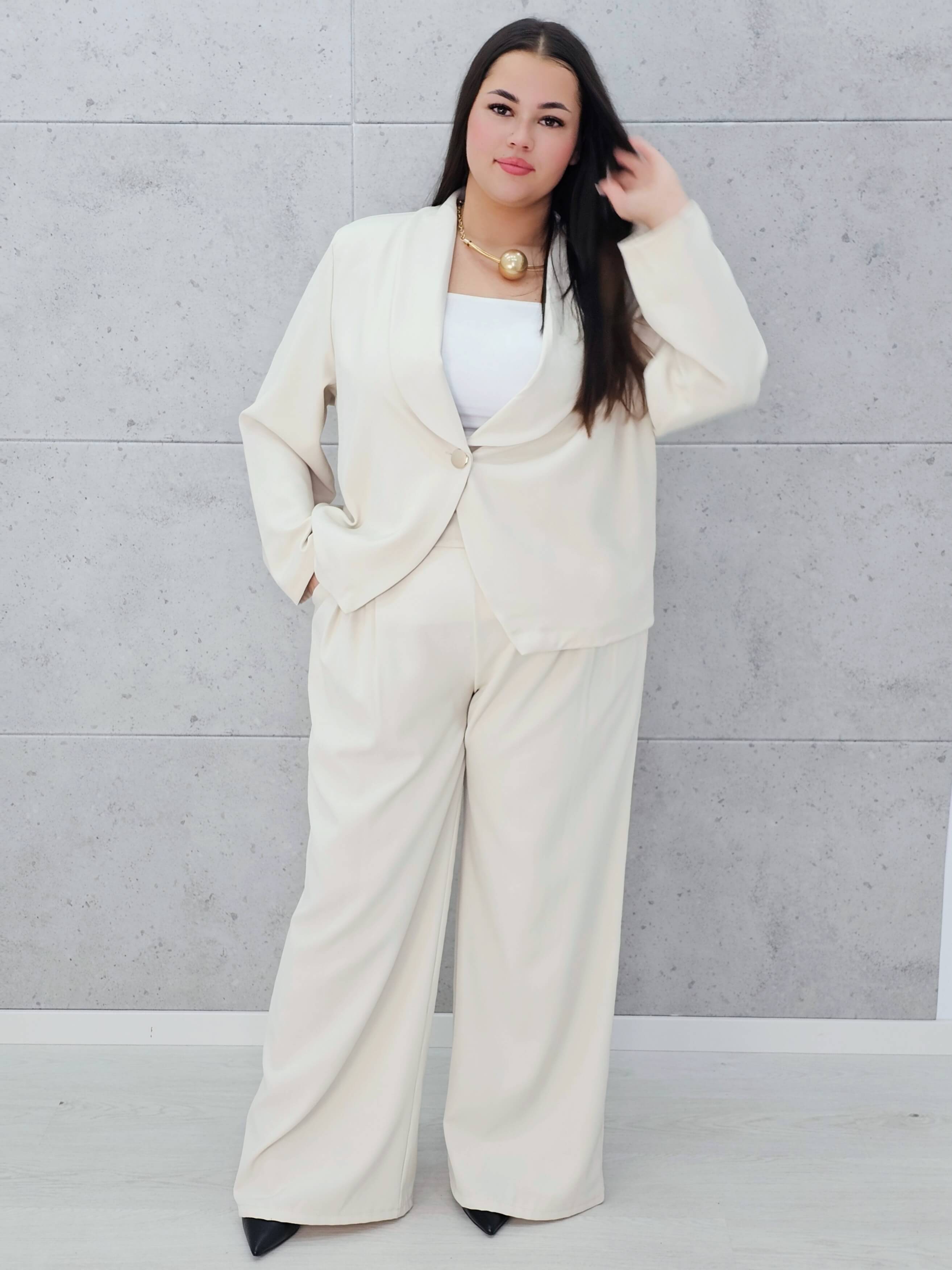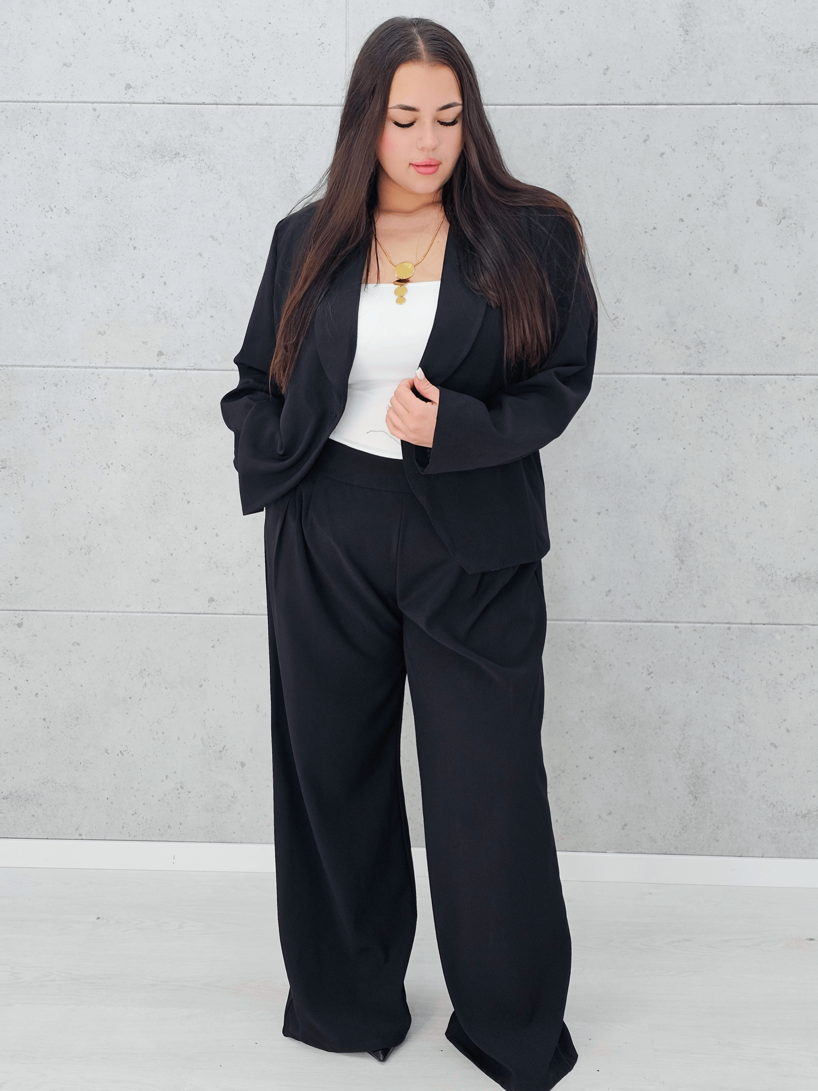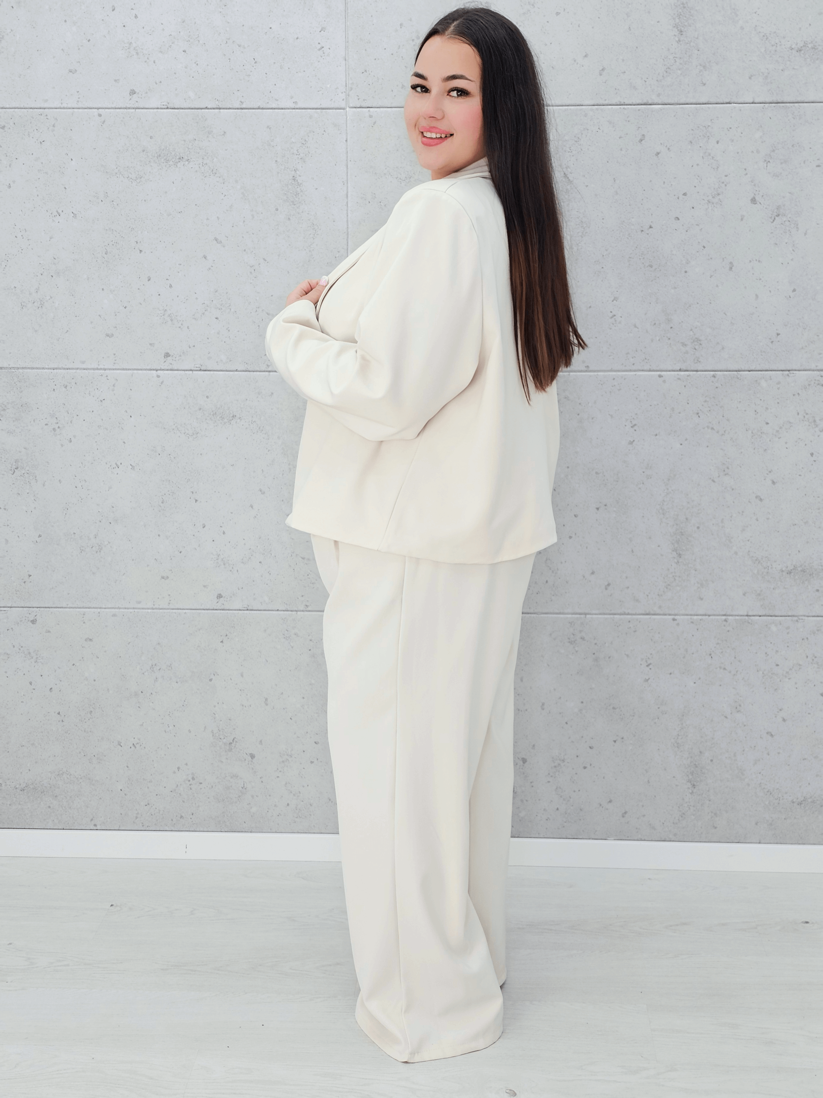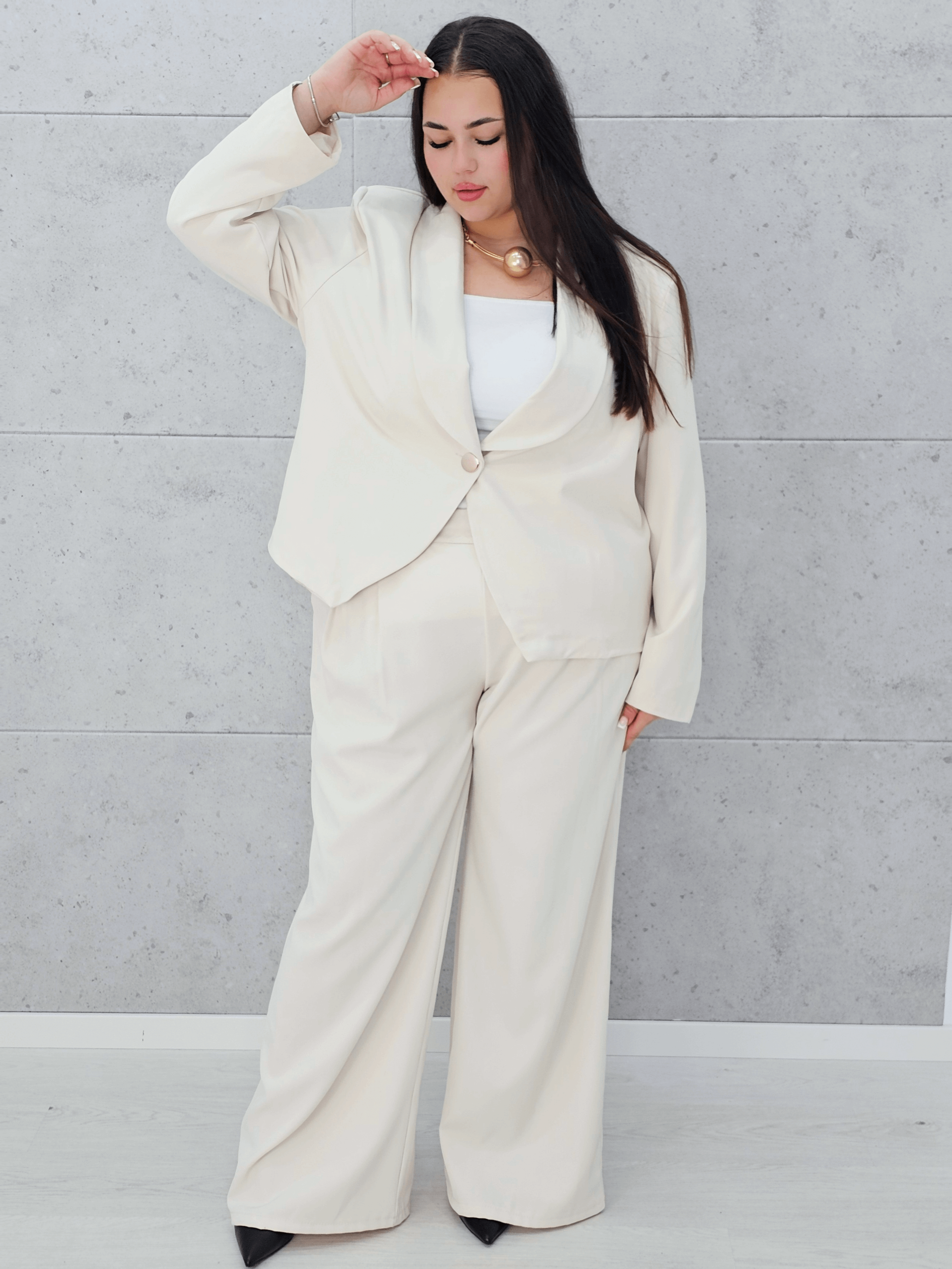 Ten komplet to kwintesencja klasy i pewności siebie Luźniejsza marynarka o modnym kroju oversize pięknie układa się na sylwetce, a spodnie z szeroką nogawką nadają całości lekkości i szyku. Idealny zarówno do pracy, jak i na wyjątkowe okazje