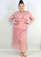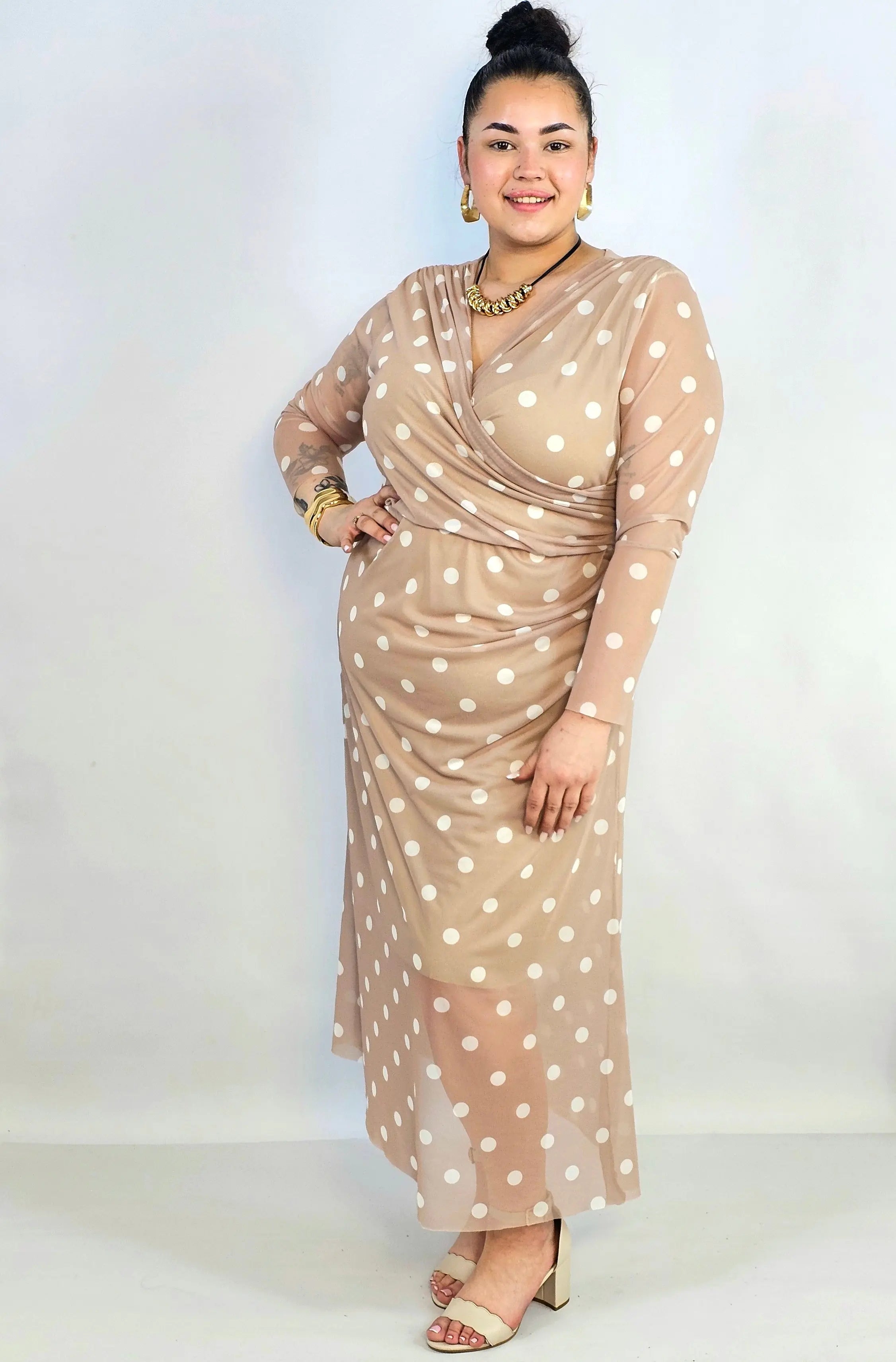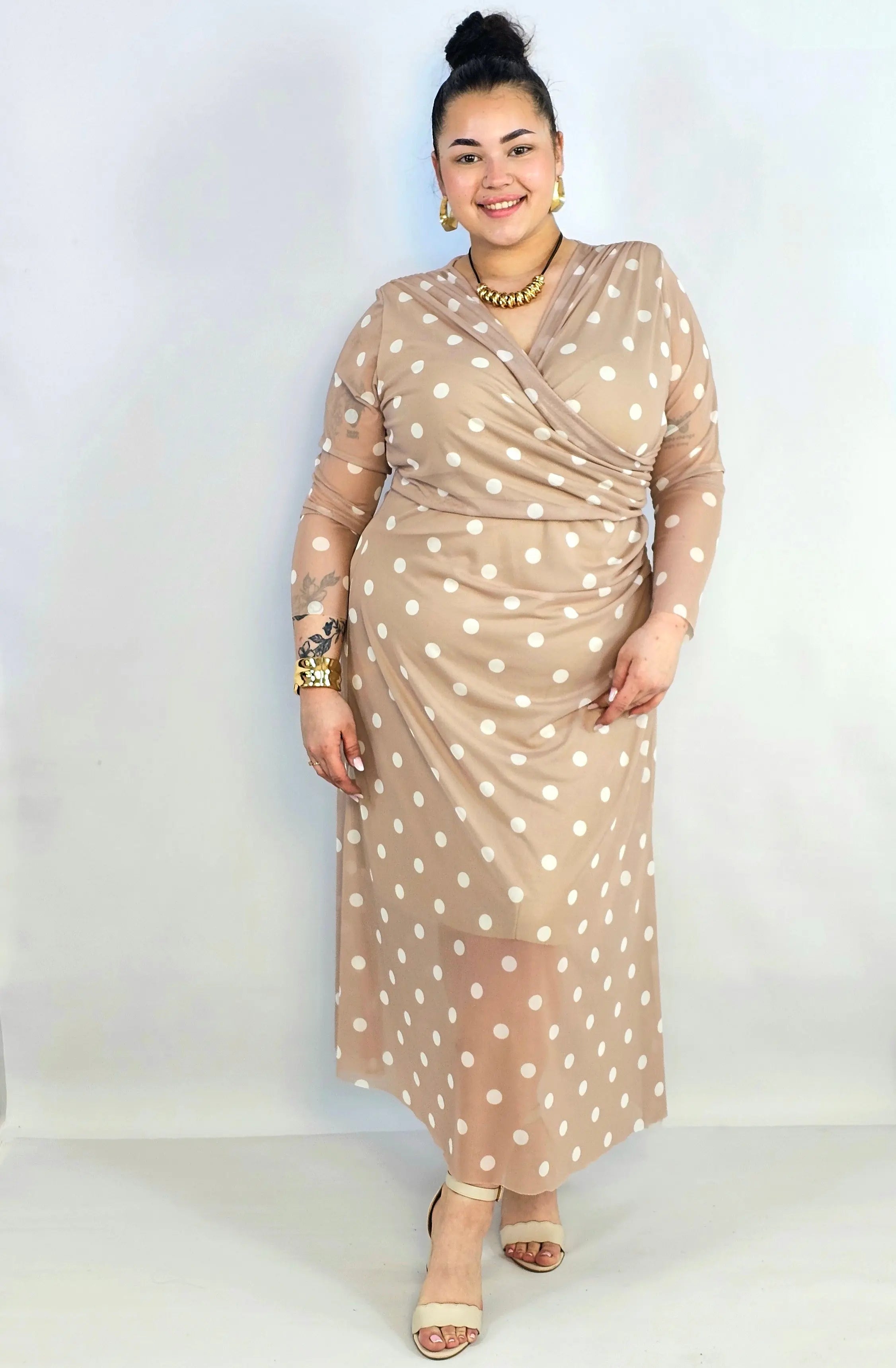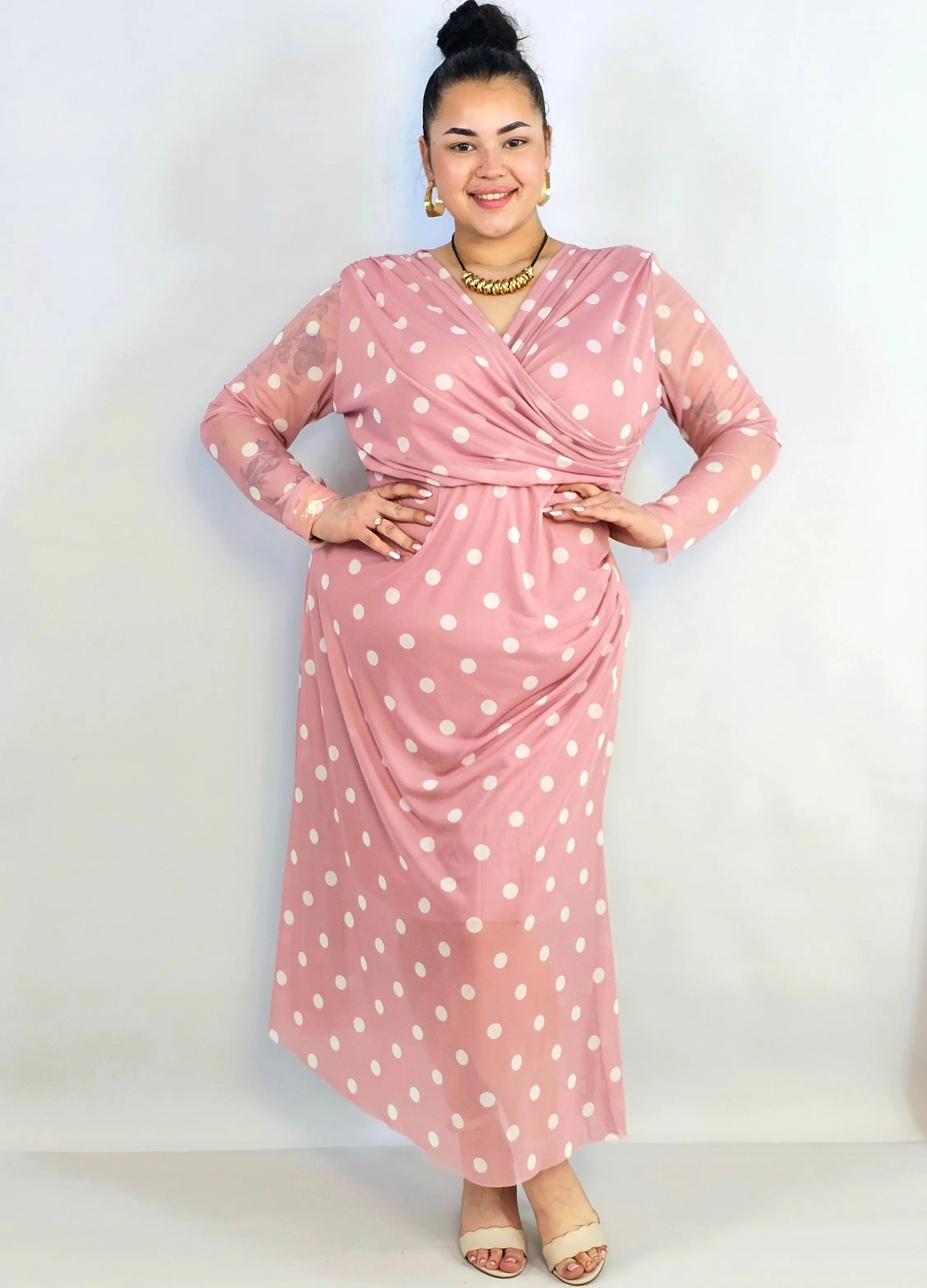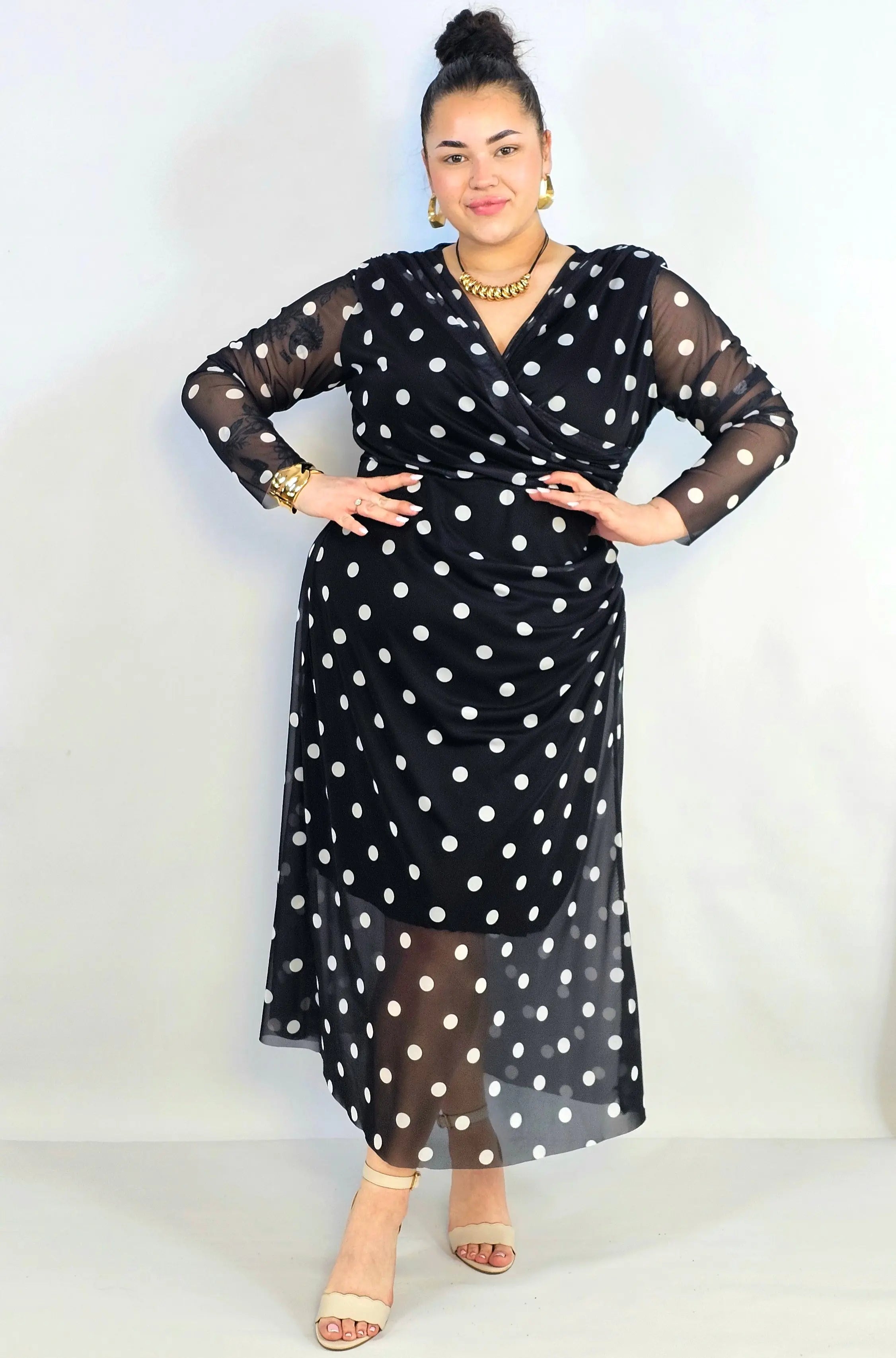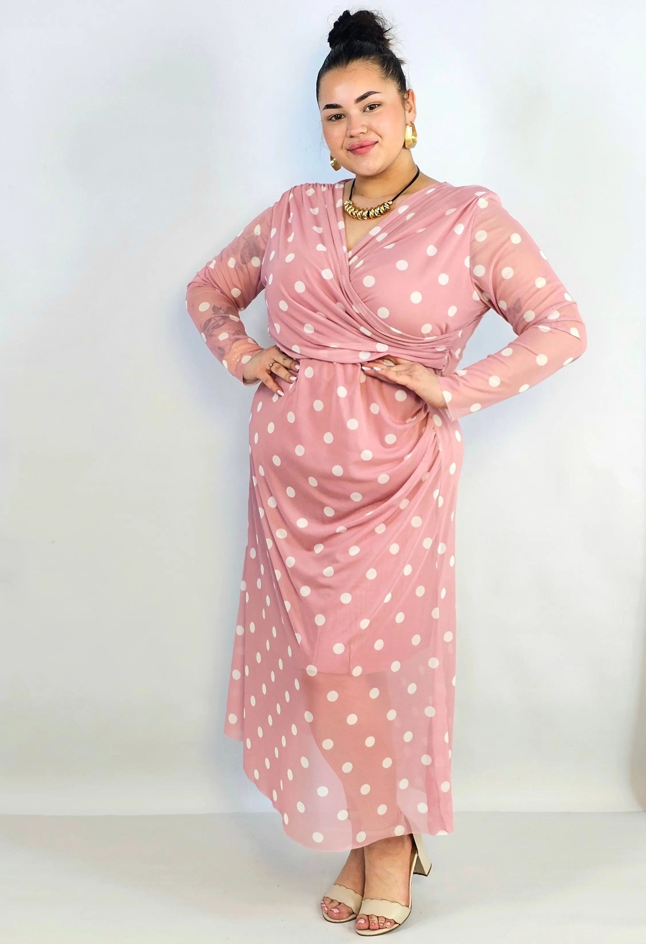 Jeśli szukasz stylowej propozycji w kategorii sukienka plus size, ten model w czerni, pudrowym różu lub beżu będzie doskonałym wyborem. Grochy dodają lekkości i francuskiego charakteru, a długi rękaw sprawia, że to świetna opcja także na chłodniejsze dni.