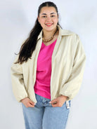 Kurtka plus size została wykończona klasycznym kołnierzem, który nadaje jej bardziej elegancki charakter i sprawia, że model pasuje zarówno do stylizacji casualowych, jak i smart casual. Elastyczne wykończenie u dołu delikatnie dopasowuje się do bioder, tworząc harmonijną linię sylwetki.