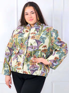 Kurtka plus size w kwiatowy wzór to wyjątkowa propozycja dla kobiet noszących większe rozmiary, które szukają stylowej, a jednocześnie wygodnej odzieży plus size. Model wyróżnia się efektownym, roślinnym wzorem oraz krótszym fasonem, który pięknie układa się na sylwetce XXL.