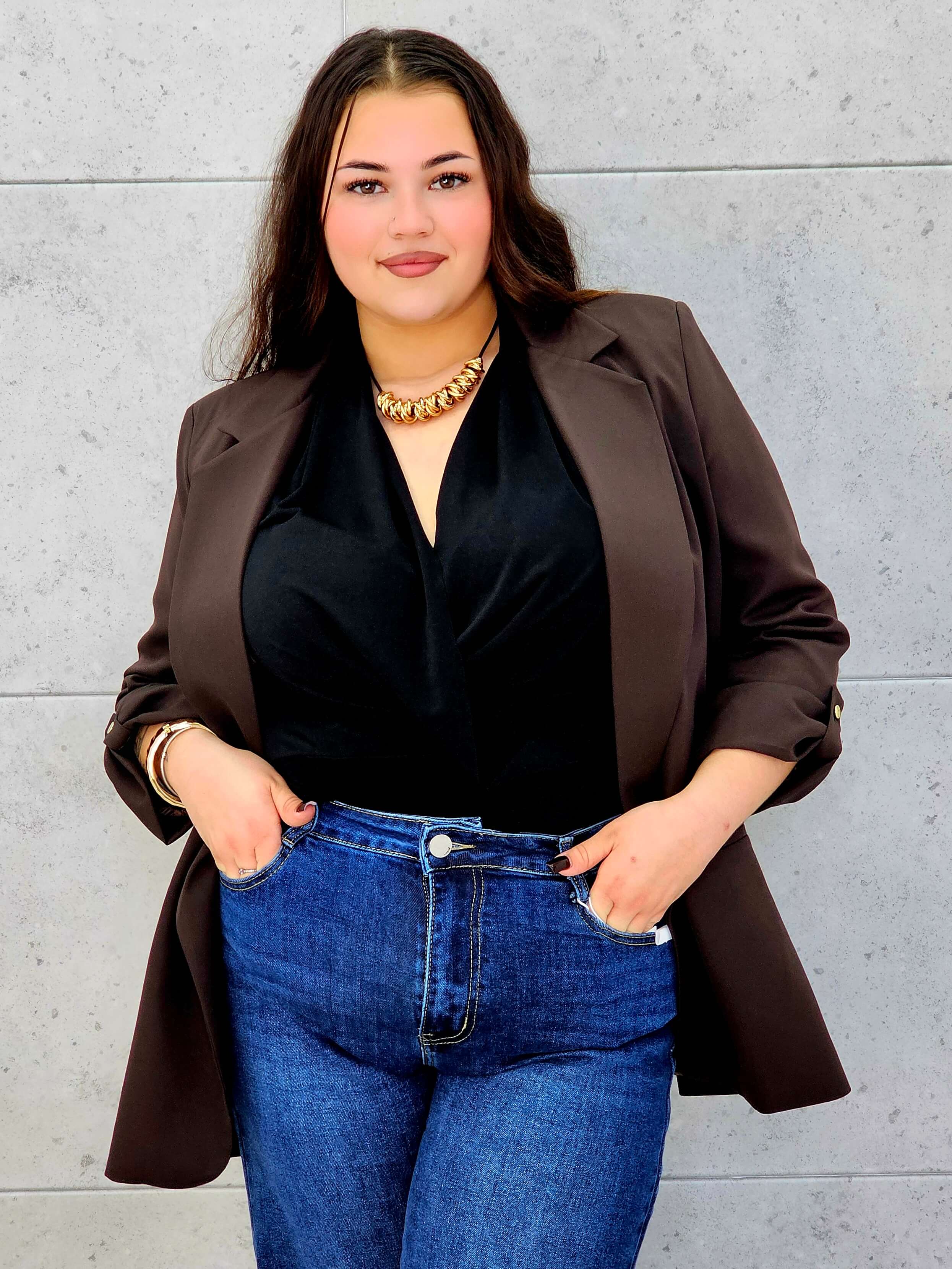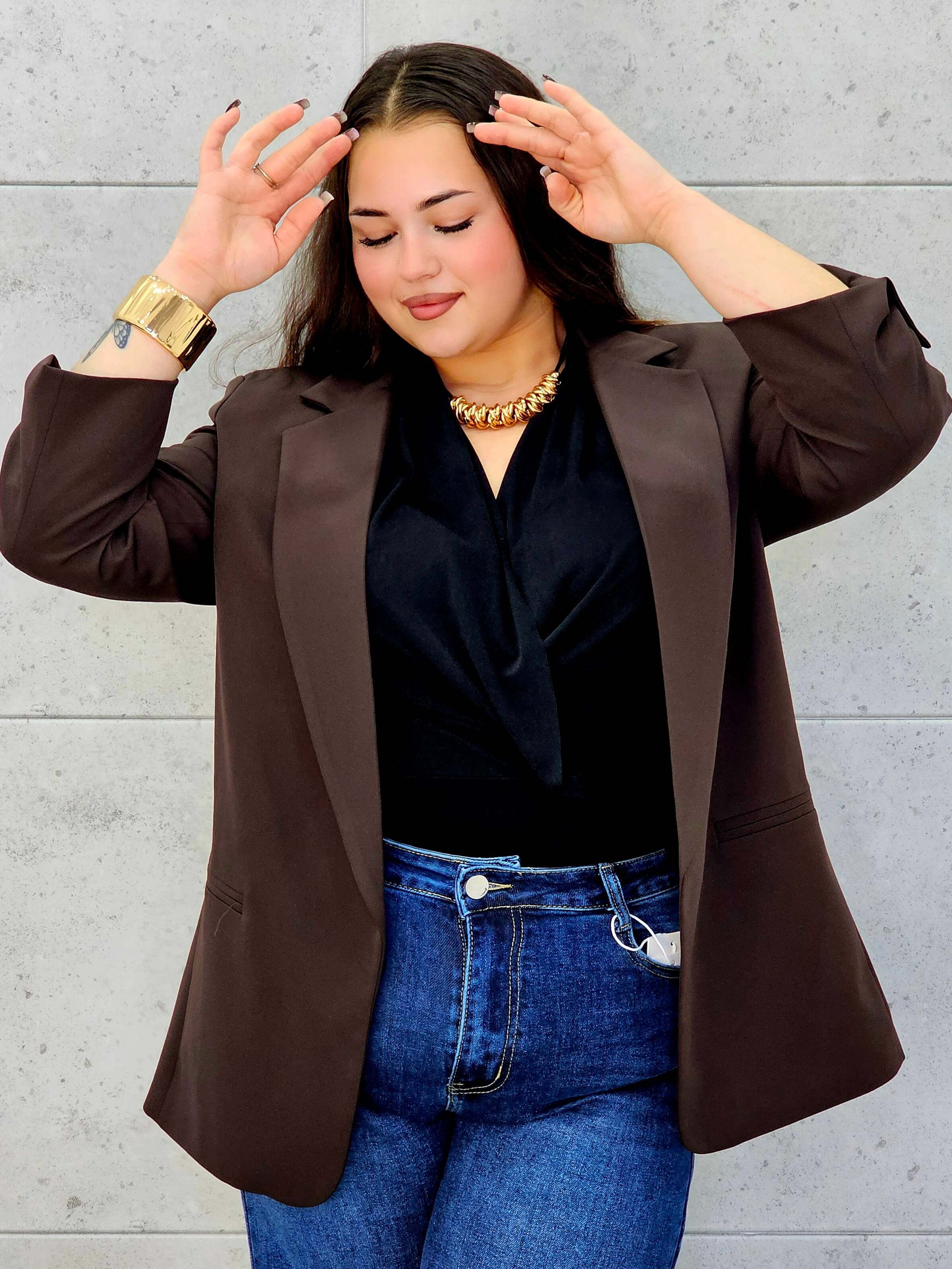 Marynarka plus size, która świetnie wygląda zarówno w duecie z jeansami, jak i eleganckimi spodniami lub sukienką.