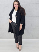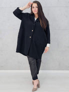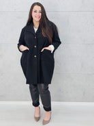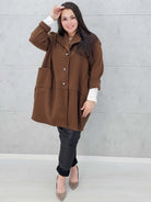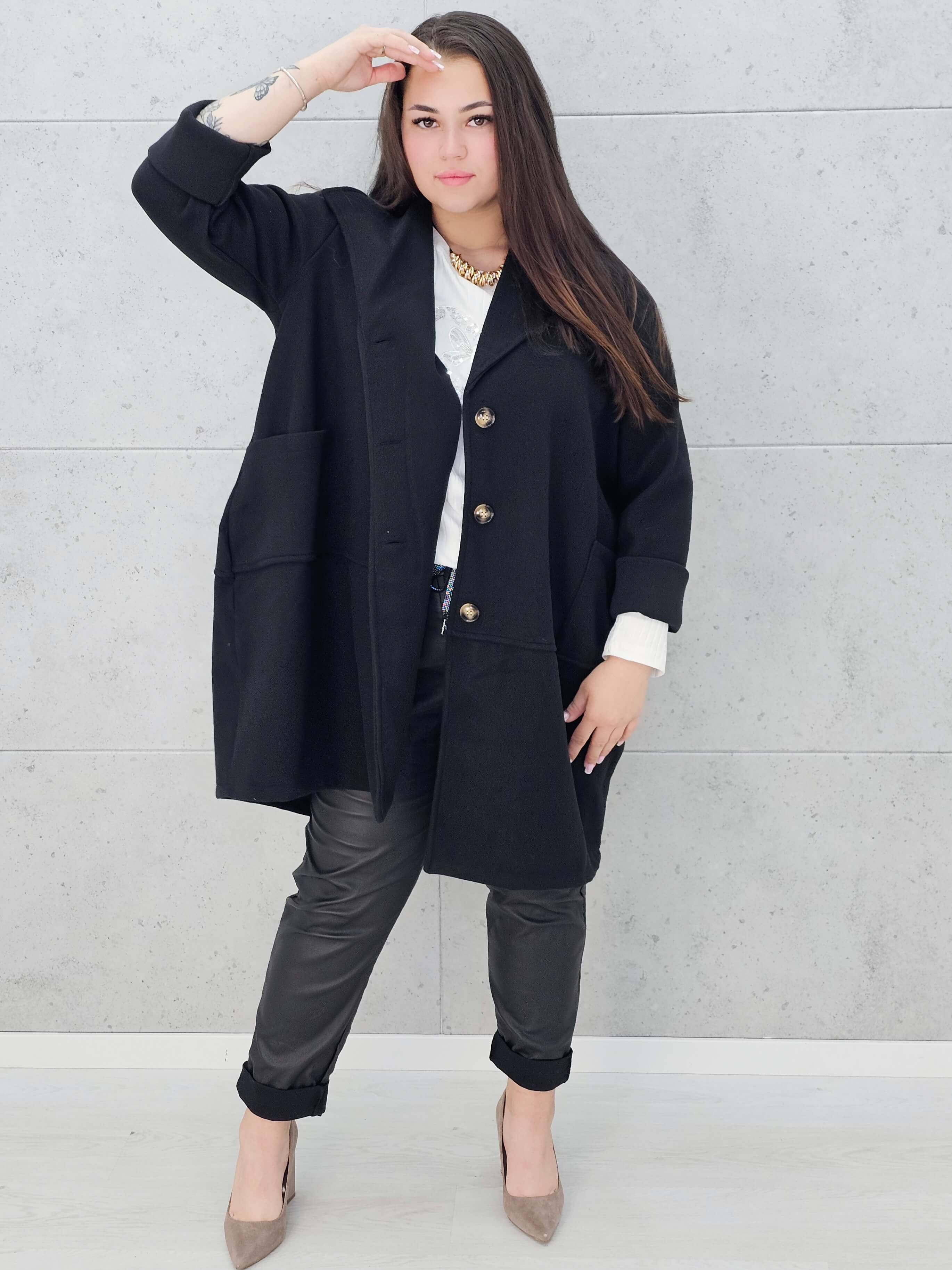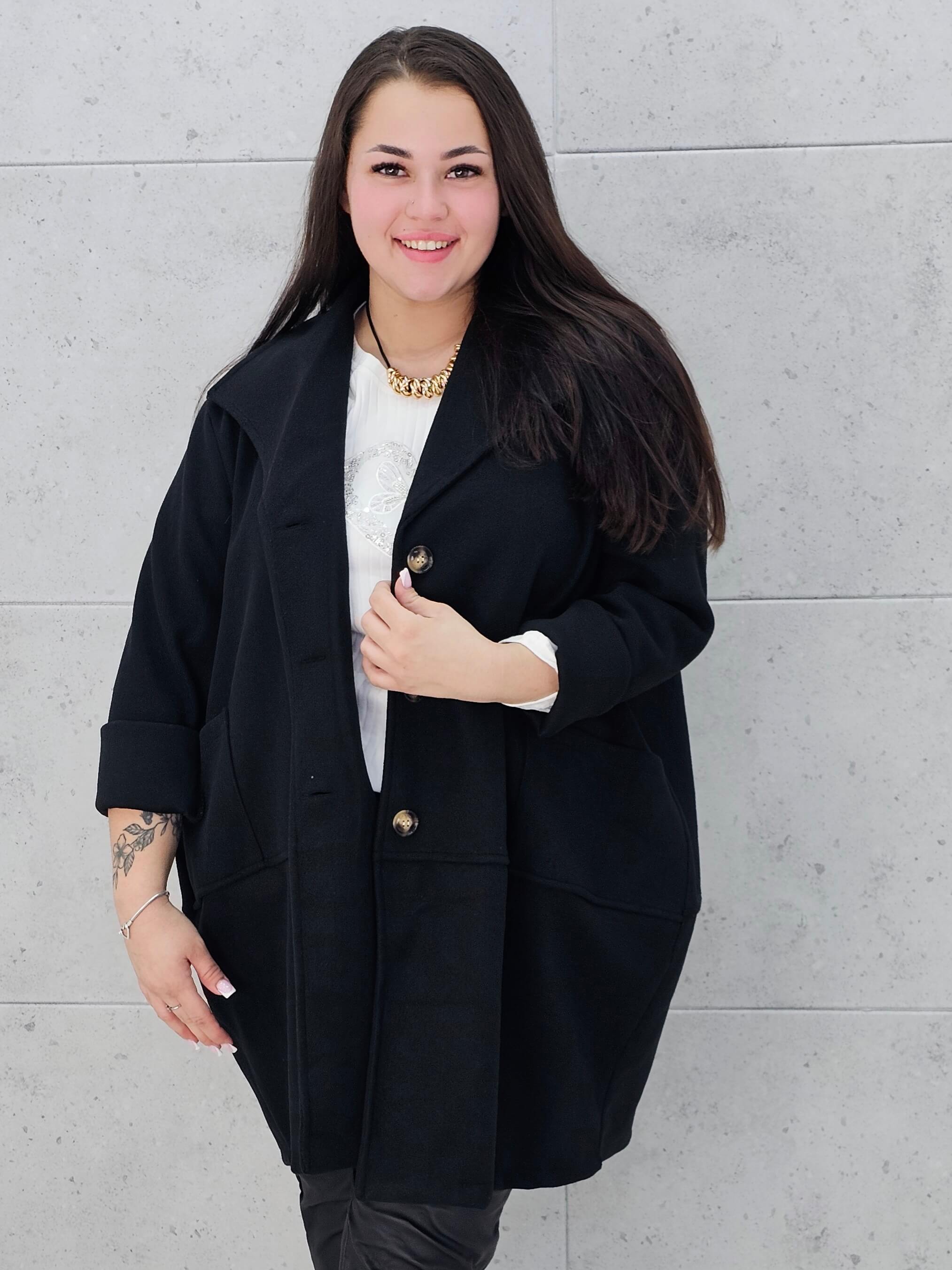 Ten płaszcz to must-have sezonu! Luźny, oversize’owy krój zapewnia swobodę ruchów i pozwala dopasować go do różnych sylwetek, a przy tym wygląda niezwykle stylowo. Wykonany z miękkiego, ciepłego materiału, idealnie sprawdzi się w chłodniejsze dni. Duże, praktyczne kieszenie dodają uroku i wygody, a klasyczne guziki podkreślają ponadczasowy charakter